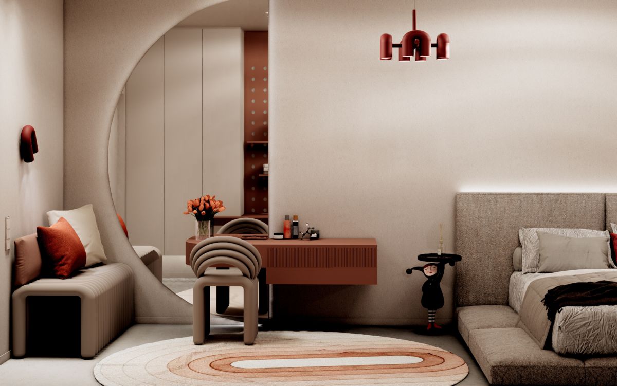 Комната девочки спроектирована в приглушенном серо-бежевом цвете с персиковым оттенком и винных акцентах. В комнате учтены места хранения, отдыха, учебы и просто комфортного времяпровождения с друзьями.