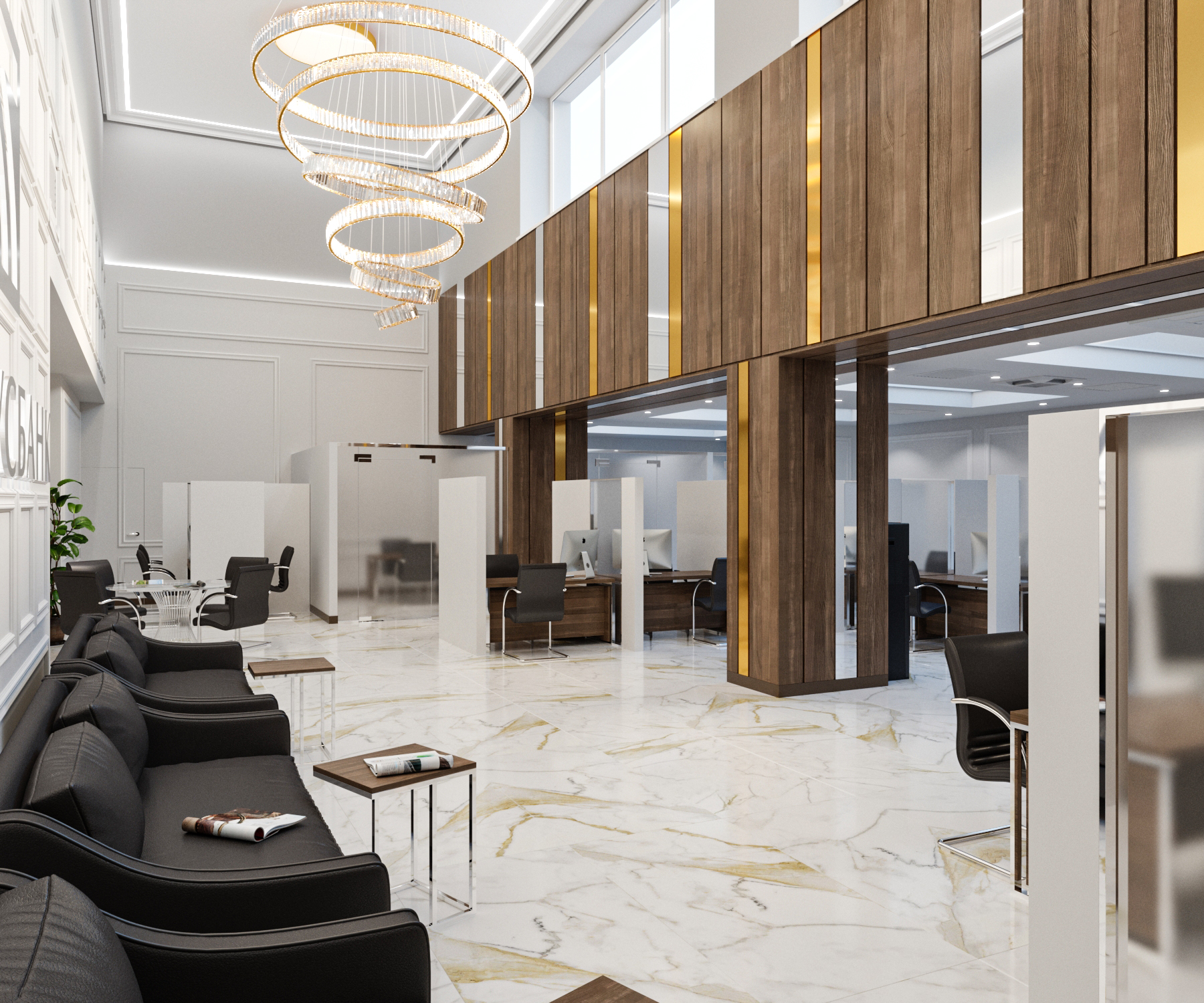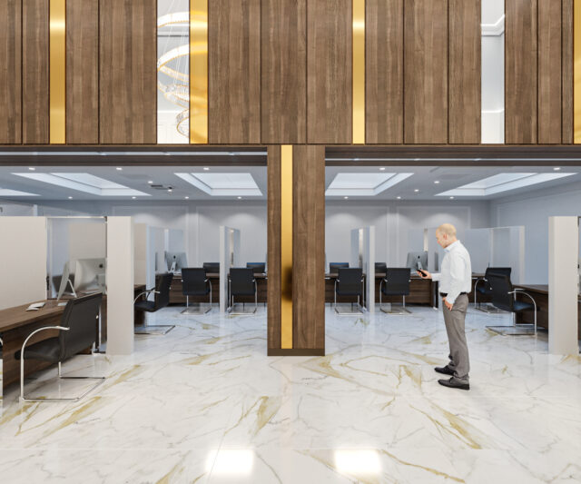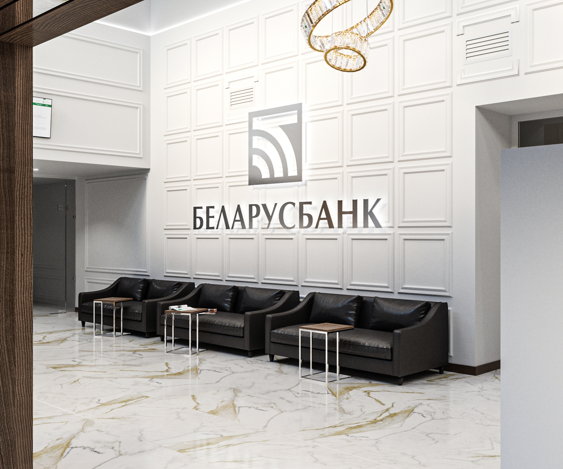 При реконструкции выполнялась перепланировка в операционном зале в здании специализированного назначения по проспекту Держинского,18 в городе Минске. Перепланировкой предусмотрены: помещения трех комнат для переговоров, разделённых между собой звукоизоляционными трансформируемыми перегородками. Помещение по обслуживанию клиентов, а так же комната для переводчиков.