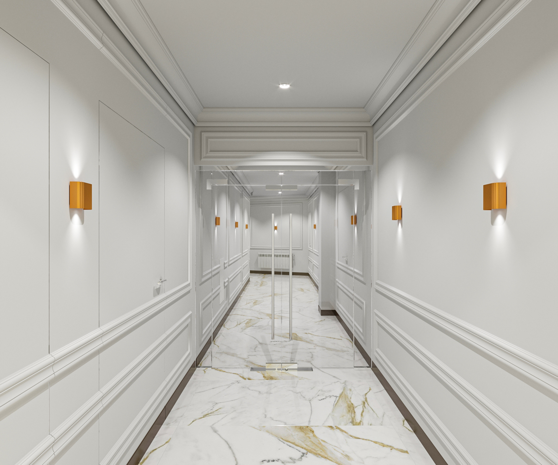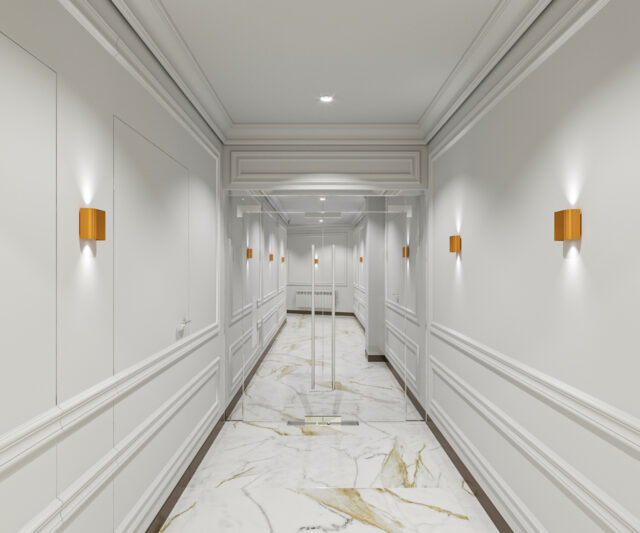 Характерными особенностями дизайн-проекта являются: просторные и светлые помещения, использование природных материалов, декоративный модульный потолок в переговорной из натурального дерева, простая форма мебели, наличие зеркал, стекол, латунных вставок, изящные акценты (хрустальная люстра в современном стиле). Для декорирования стен используются молдинги и деревянные панели. Пол выполнен из мрамора. Стиль интерьера — современная классика.