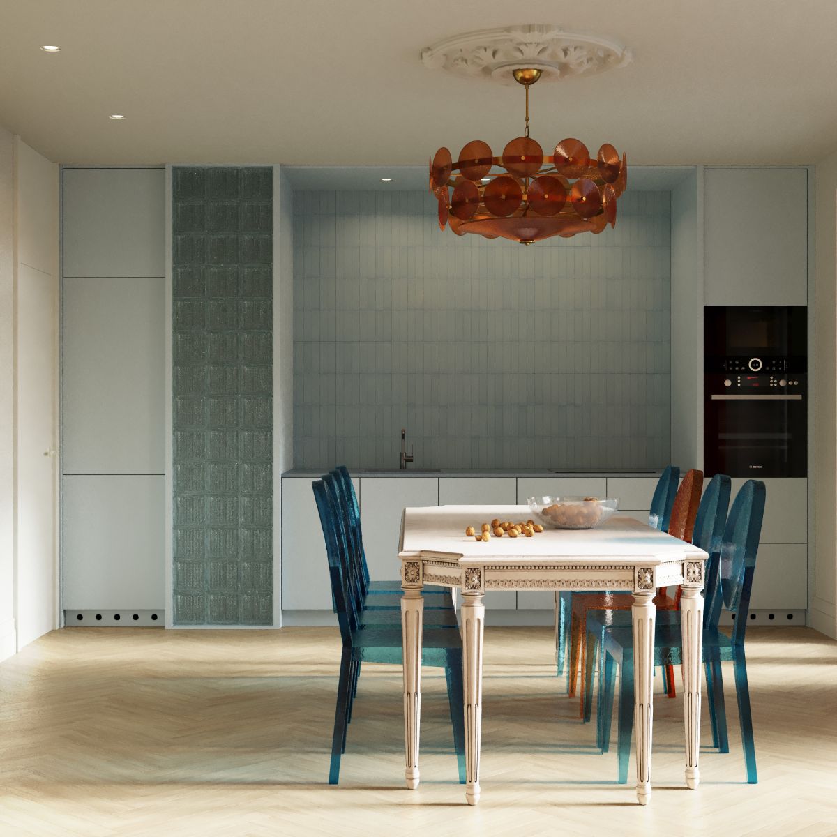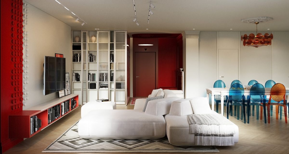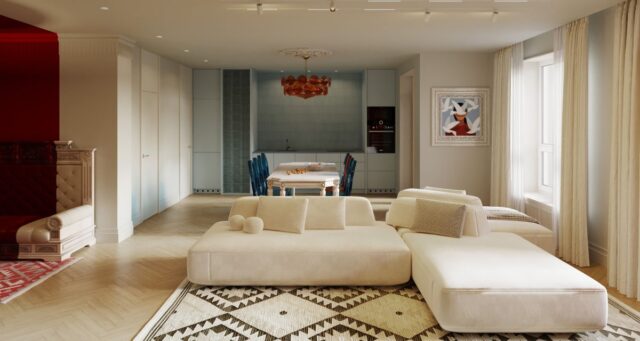 Баланс между громоздкими старинными вещами и хрупким бликующим стеклом достигнут благодаря глубине цвета, при этом сохранив чистоту исходных форм — круга и квадрата. Уют и атмосферу в интерьере помогли создать этнические мотивы в текстиле.