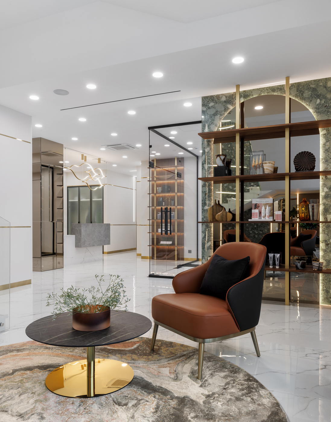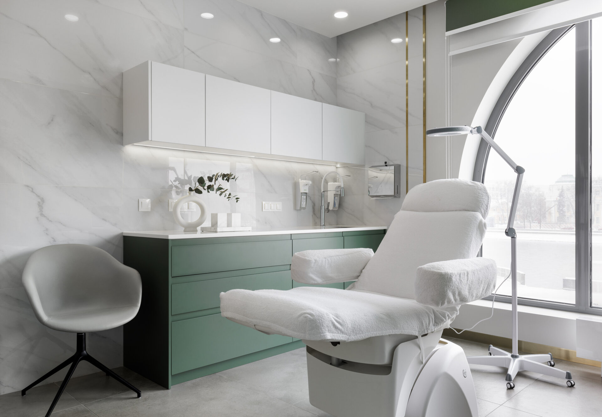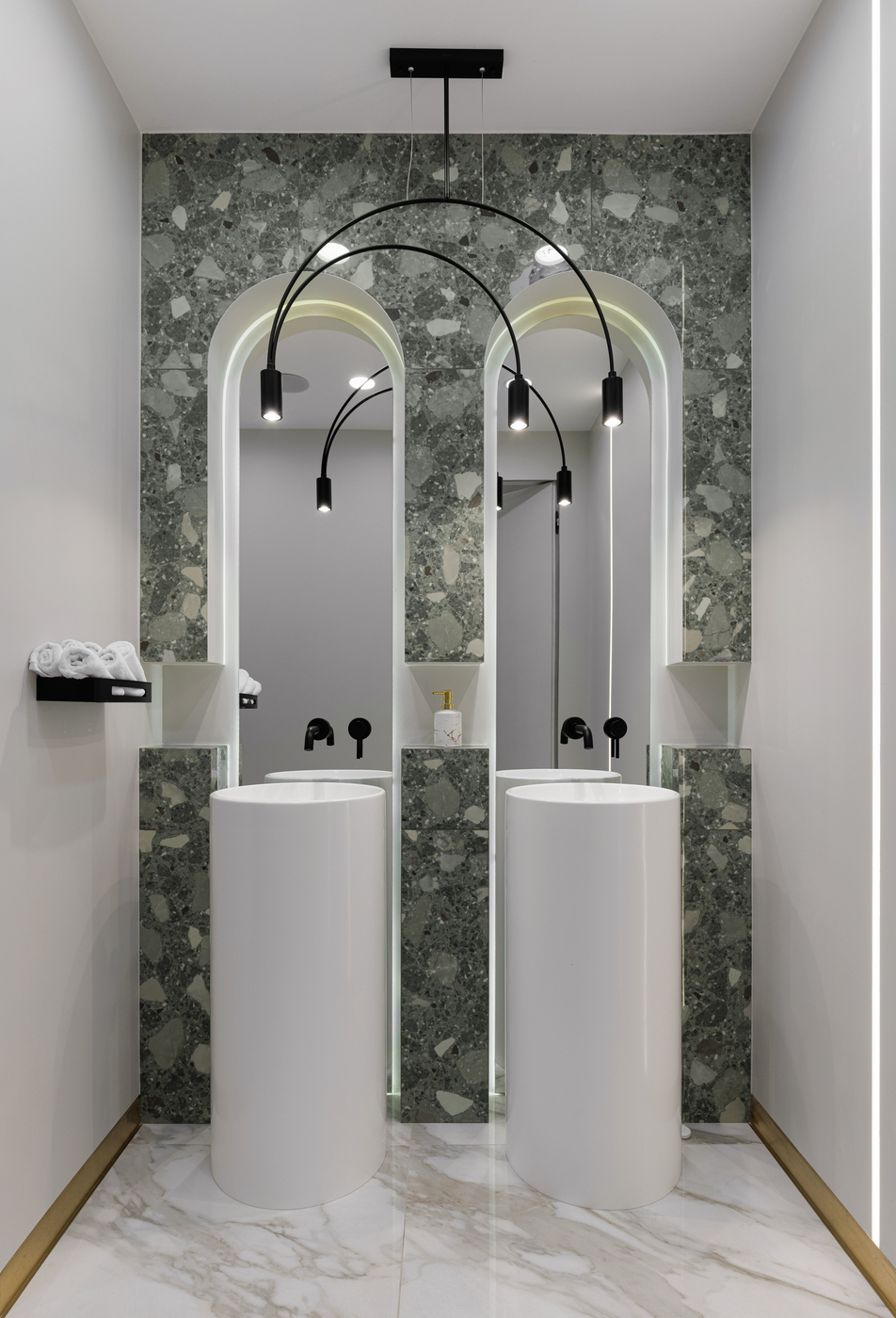 Задача проекта — соединение исторической атмосферы центра Москвы и современного интерьера. Эстетика светлых отделочных материалов, латунных деталей, повторение арочных окон в форме декора — всё сложилось в цельную, утонченную картину. Концепция проекта отражает современный взгляд на интерьер клиники эстетической медицины.
