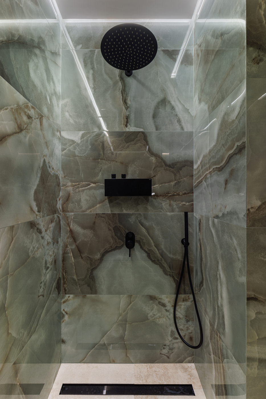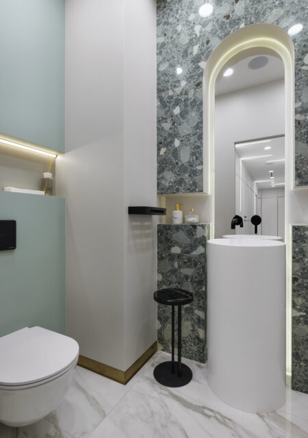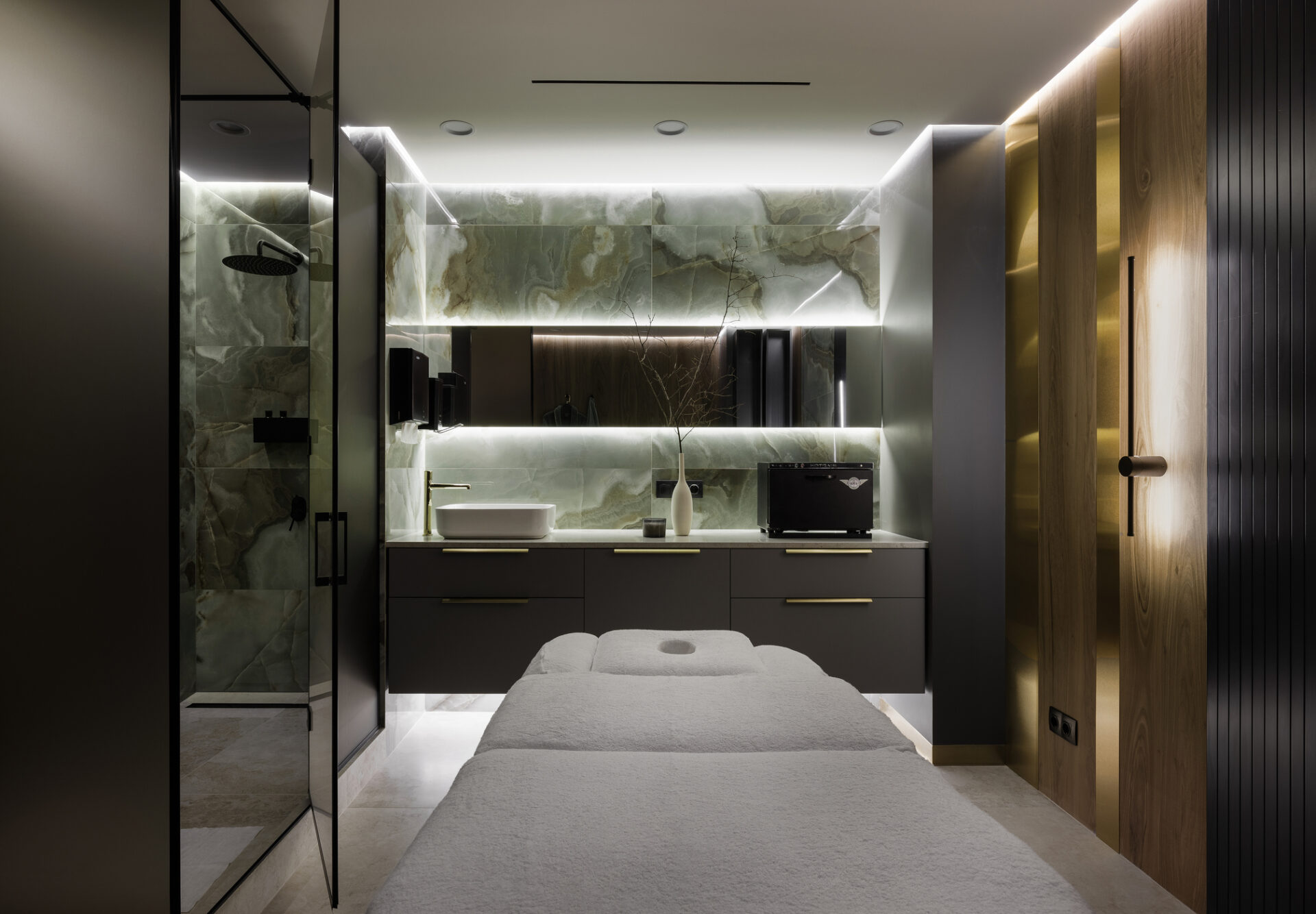 Сердцем проекта стали кабинеты SPA. Отделка из черного мрамора и теплый приглушенный свет создают спокойную расслабляющую атмосферу и ощущение роскоши. Мягкие фактуры текстиля и аромат арома-масел не оставят равнодушным даже самых изысканных клиентов.