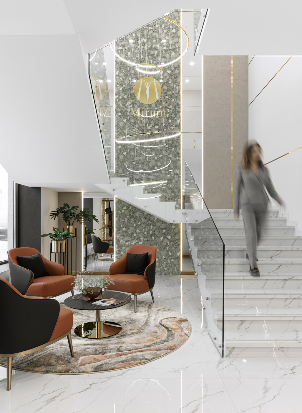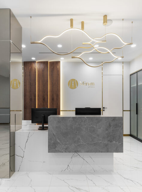 Концепция выполнена в современном минималистичном стиле, с использованием мрамора, дерева и латуни. Пространство получилось очень светлым, уютным и атмосферным. При проектировании были соблюдены все нормы и требования к медицинскому учреждению.