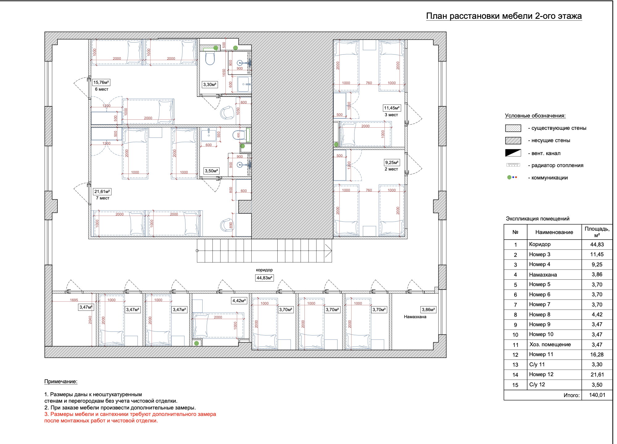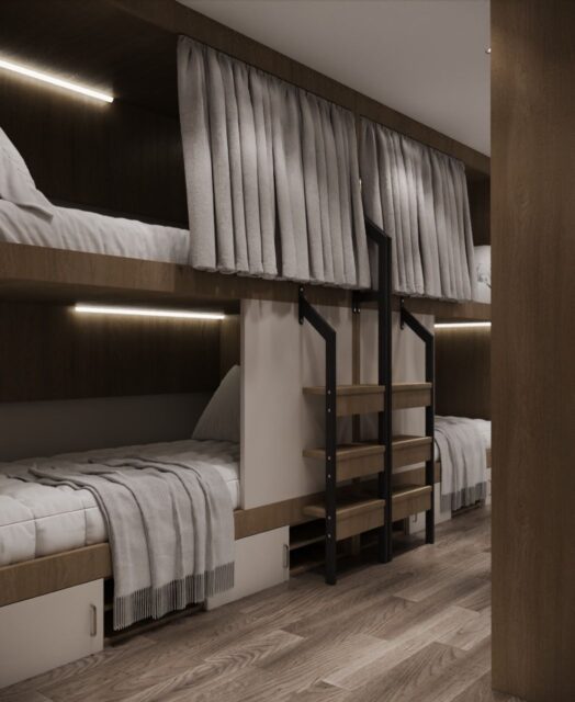 • Спальные помещения: Номера с двухъярусными кроватями, индивидуальными полками и освещением для каждого гостя, шкафчиками для хранения личных вещей. Также предусмотрены одноместные и двухместные номера.