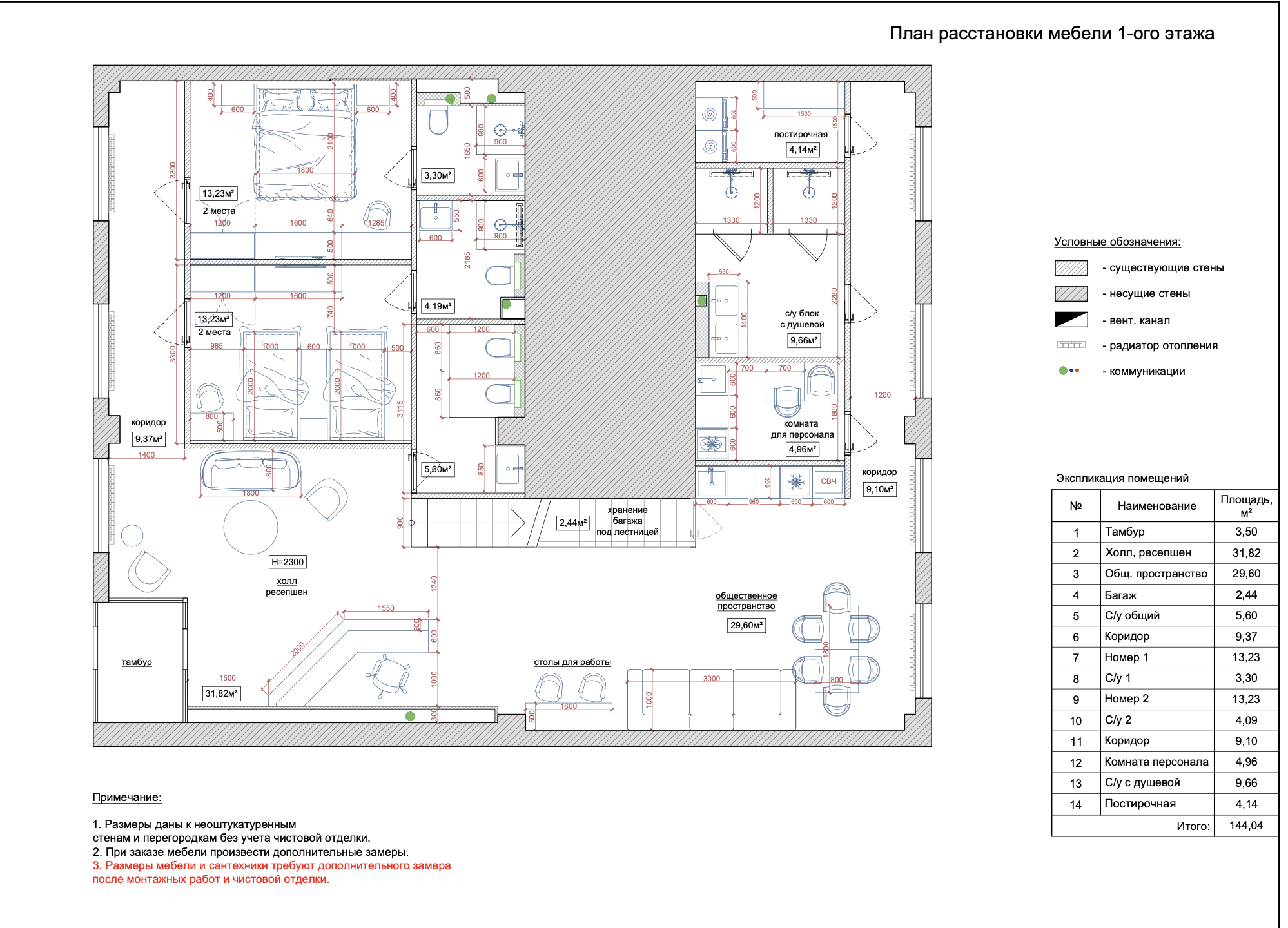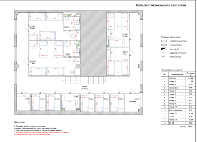 • Ванные комнаты: Универсальные, с несколькими душевыми кабинами и умывальниками.