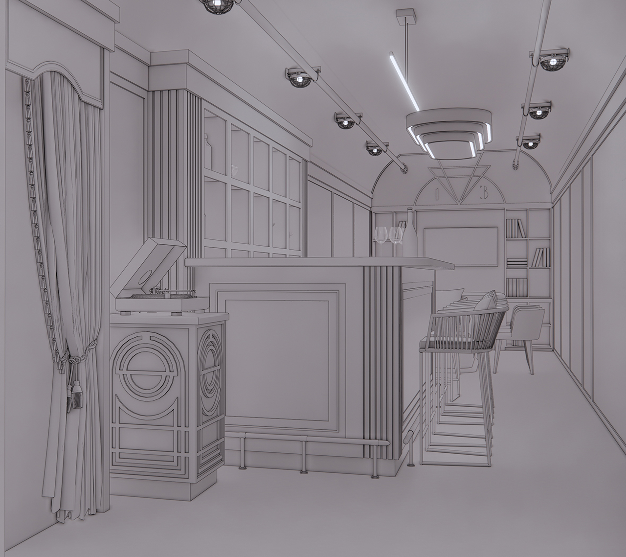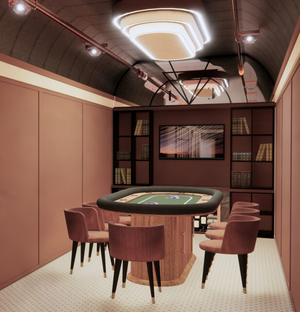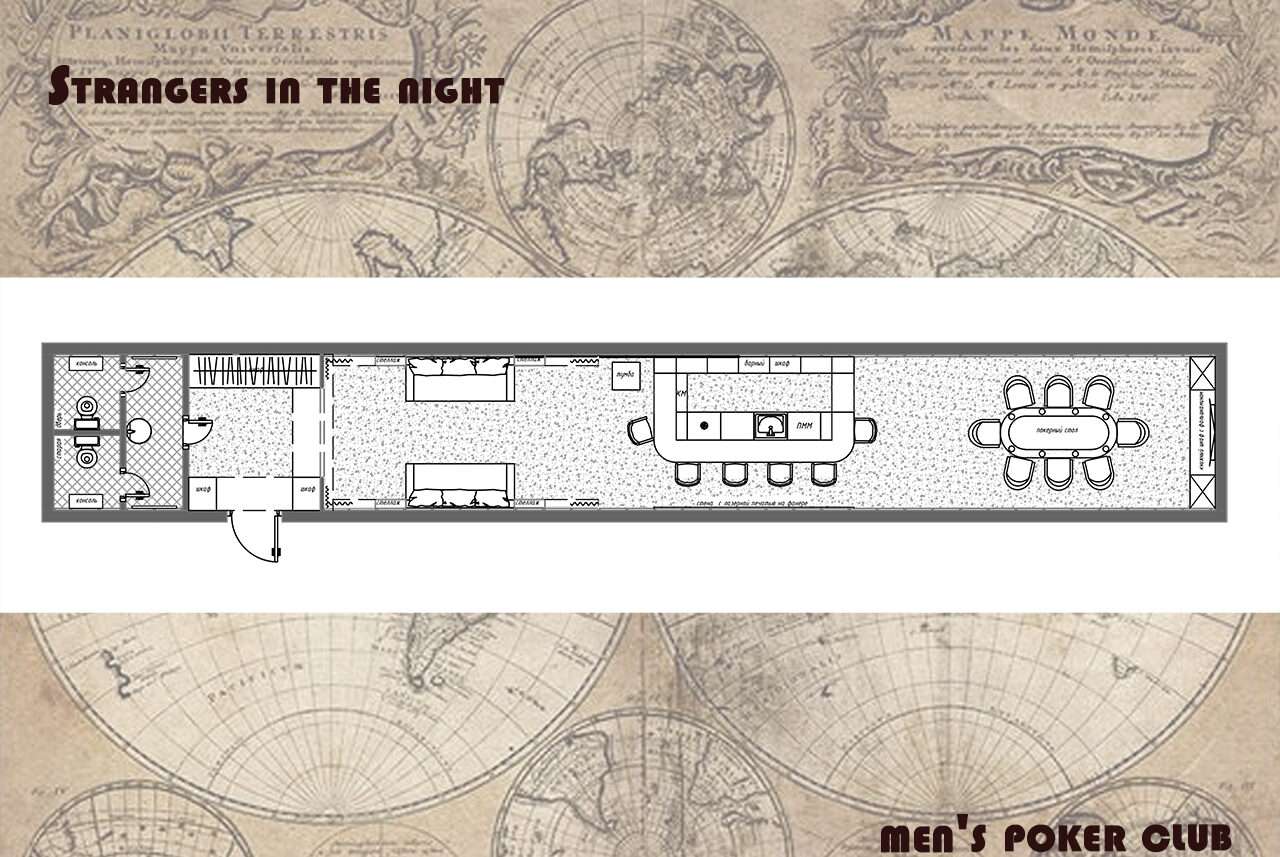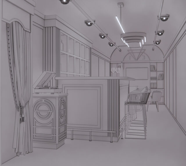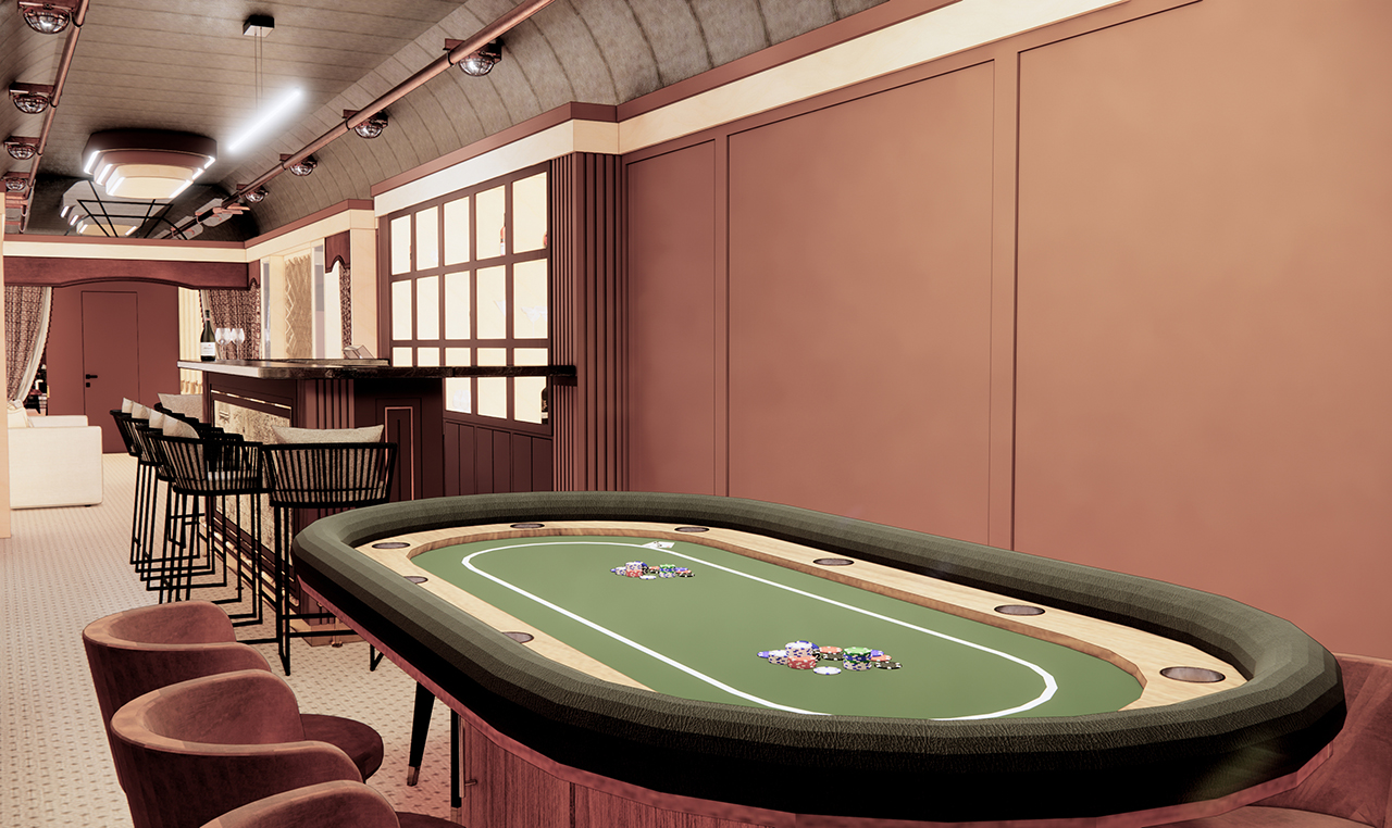 Вызовом на данном проекте стала задача по постановке военного вагона на мирные рельсы. Заказчик планирует трансформировать вагон некогда боевого железнодорожного ракетного комплекса в закрытый мужской клуб с покерным столом, баром, дорогой акустической системой и шикарной коллекцией виниловых пластинок.