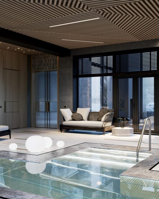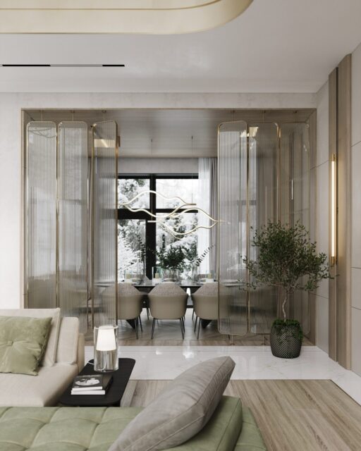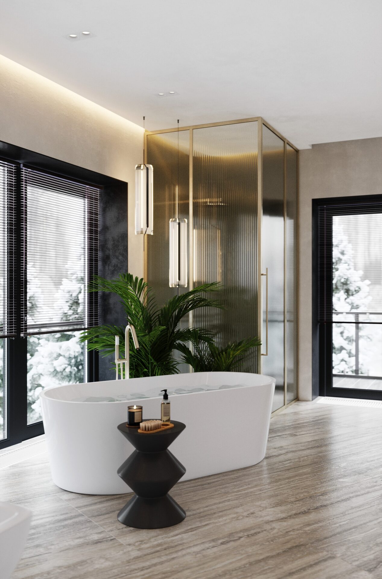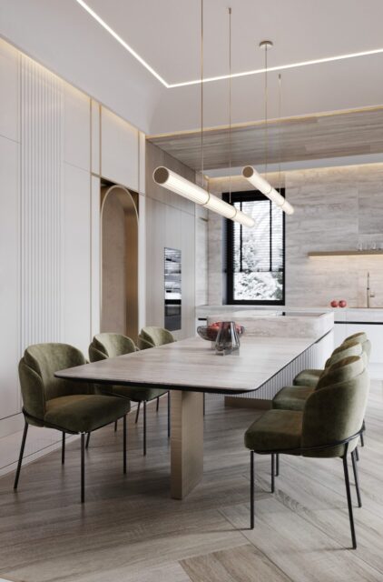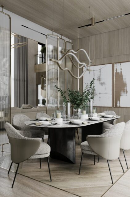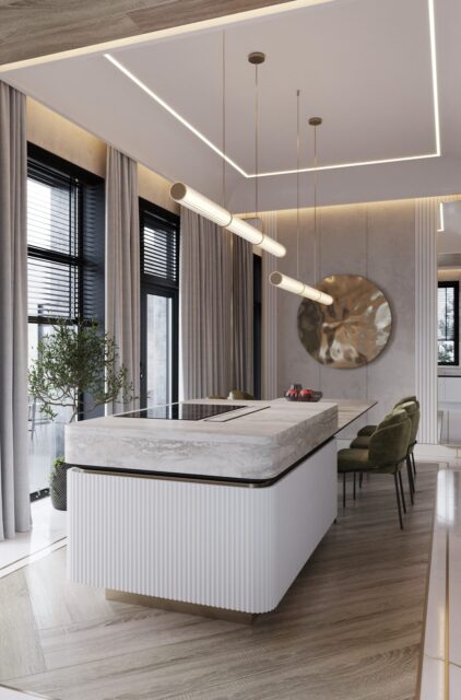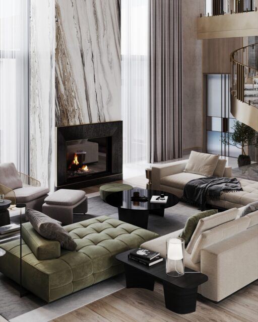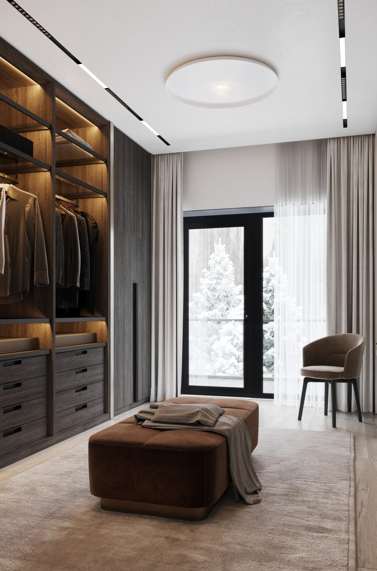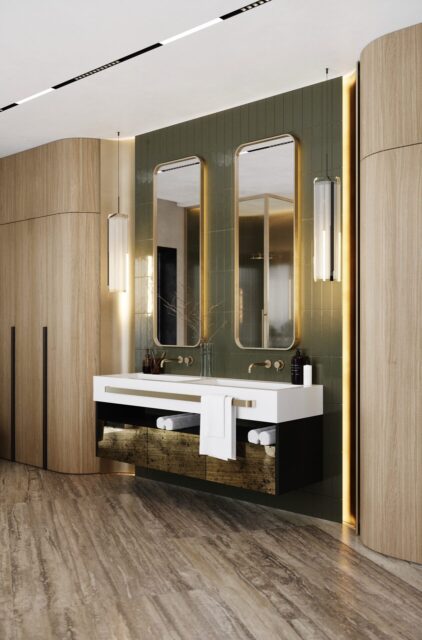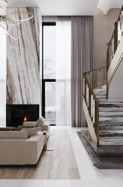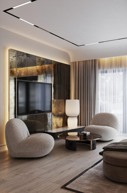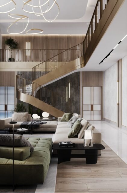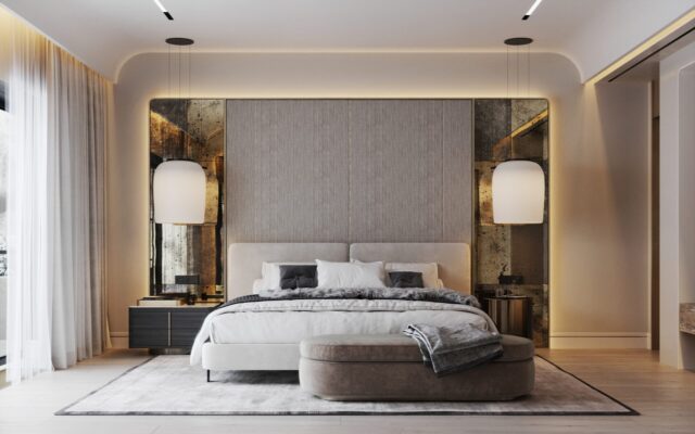 Отделка натуральными материалами и элементы под латунь, подчеркивают статусность и стиль интерьера. Радиусные конструкции прослеживаются во всех помещениях: в потолках, в форме лестницы, в светильниках, в мебели. Текстуры травертин шикарно подчеркивают природные оттенки стен и натурального дерева. Особое внимание стоит уделить зеркальным панелям, использованных в мастер-спальне. Это искусственно состаренное зеркало, которое создает интересный эффект, когда в нем отражается теплый свет от подвесных светильников у изголовья кровати.