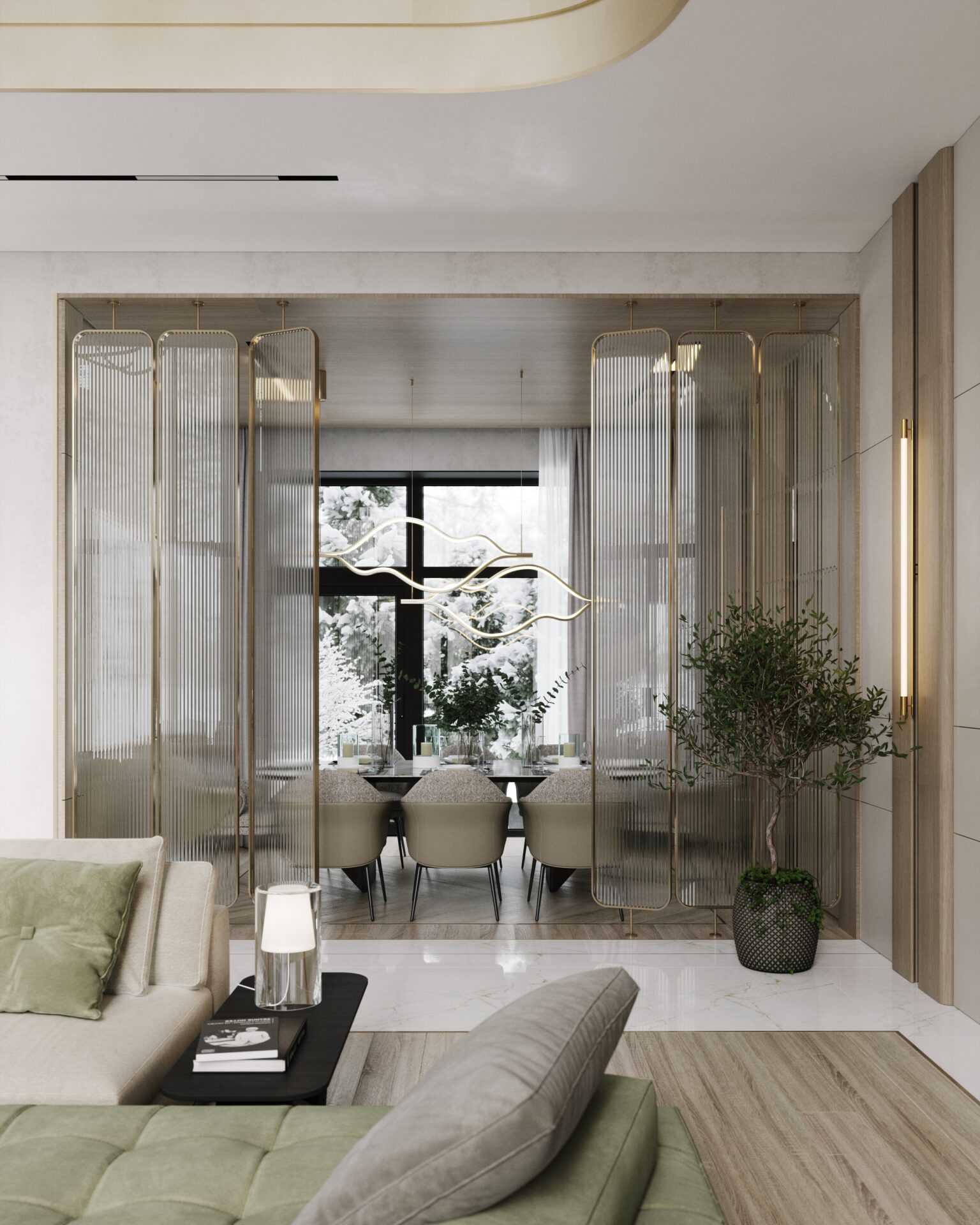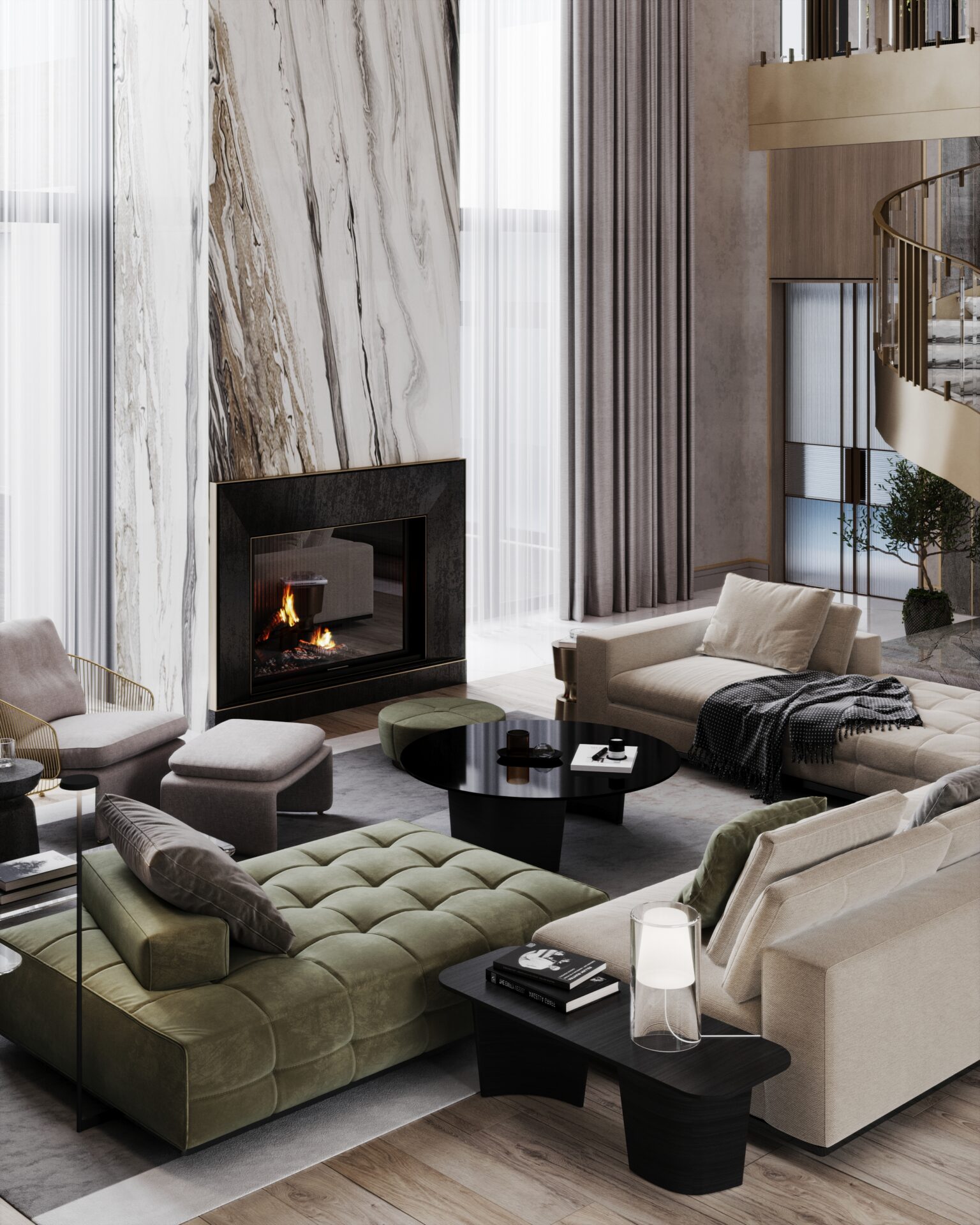 Концепция проекта-единое целое с природой, окружающей со всех сторон сам таунхаус. Второй свет в гостиной — портал, который дает возможность интерьеру стать продолжением великолепной атмосферы данного места.