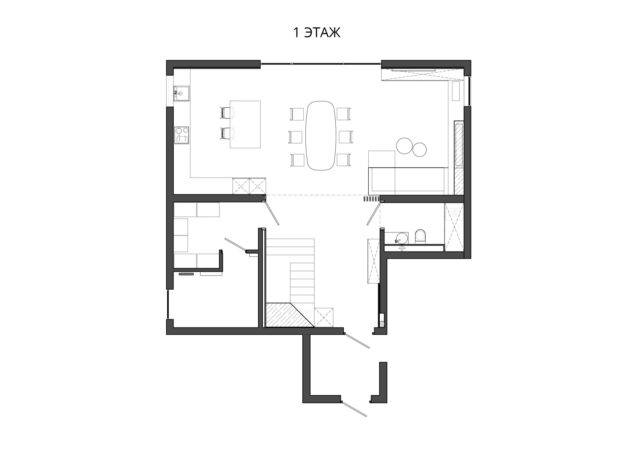 Главным пожеланием заказчиков по планировке первого этажа было сохранить открытое пространство. Лишь перегородка в виде реек из массива визуально отделяет зону прихожей и гостиной.