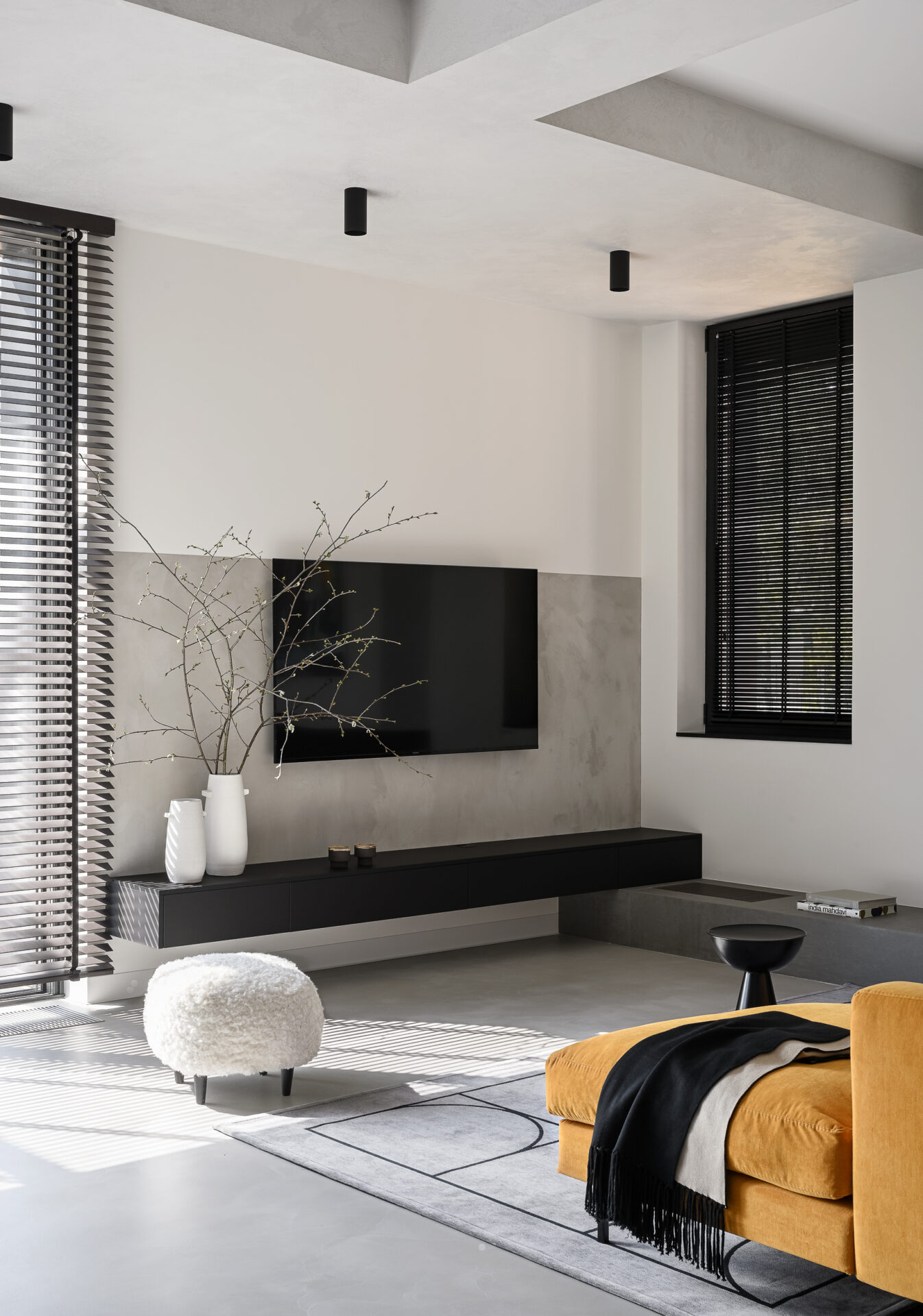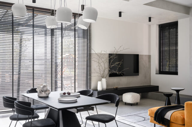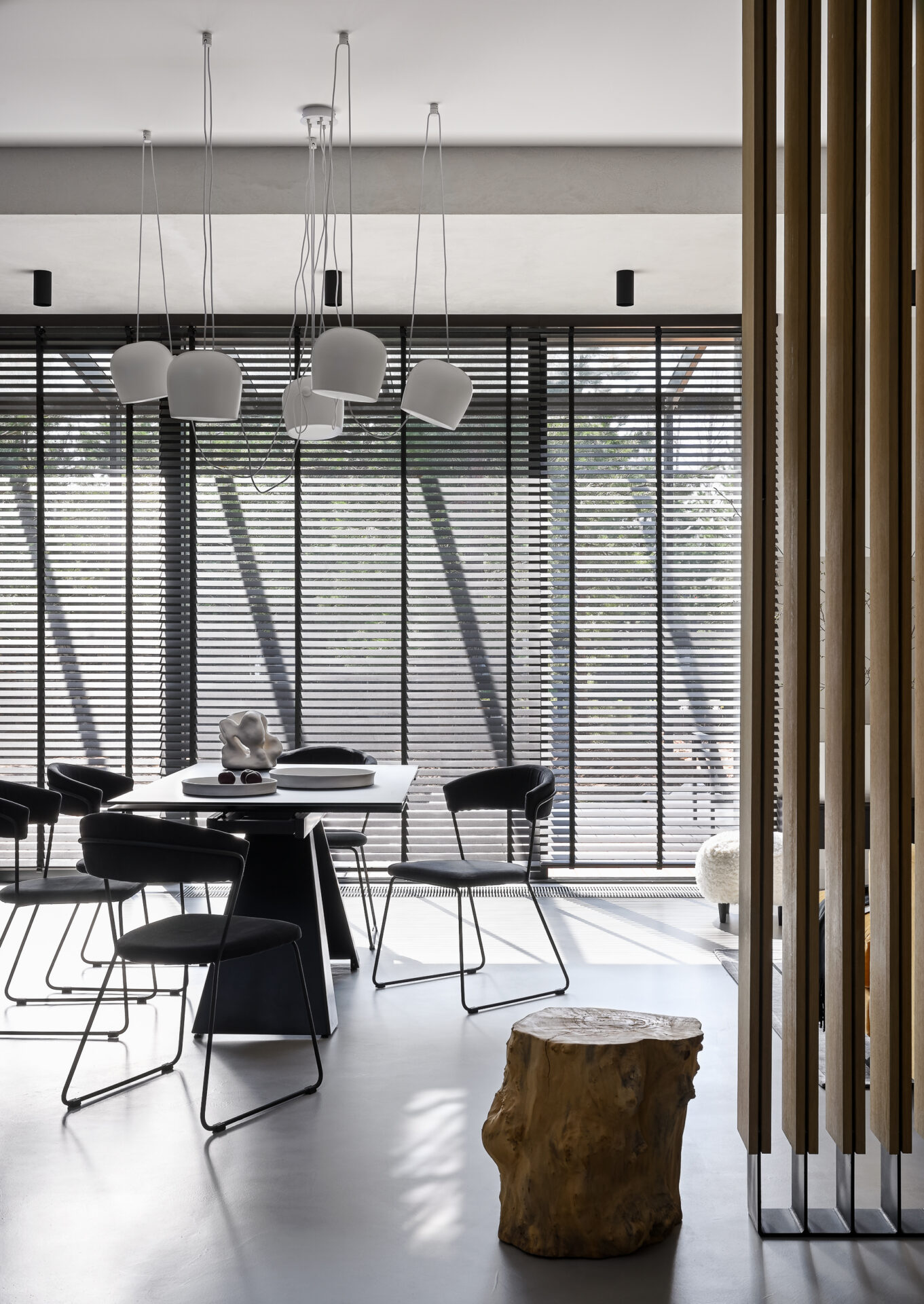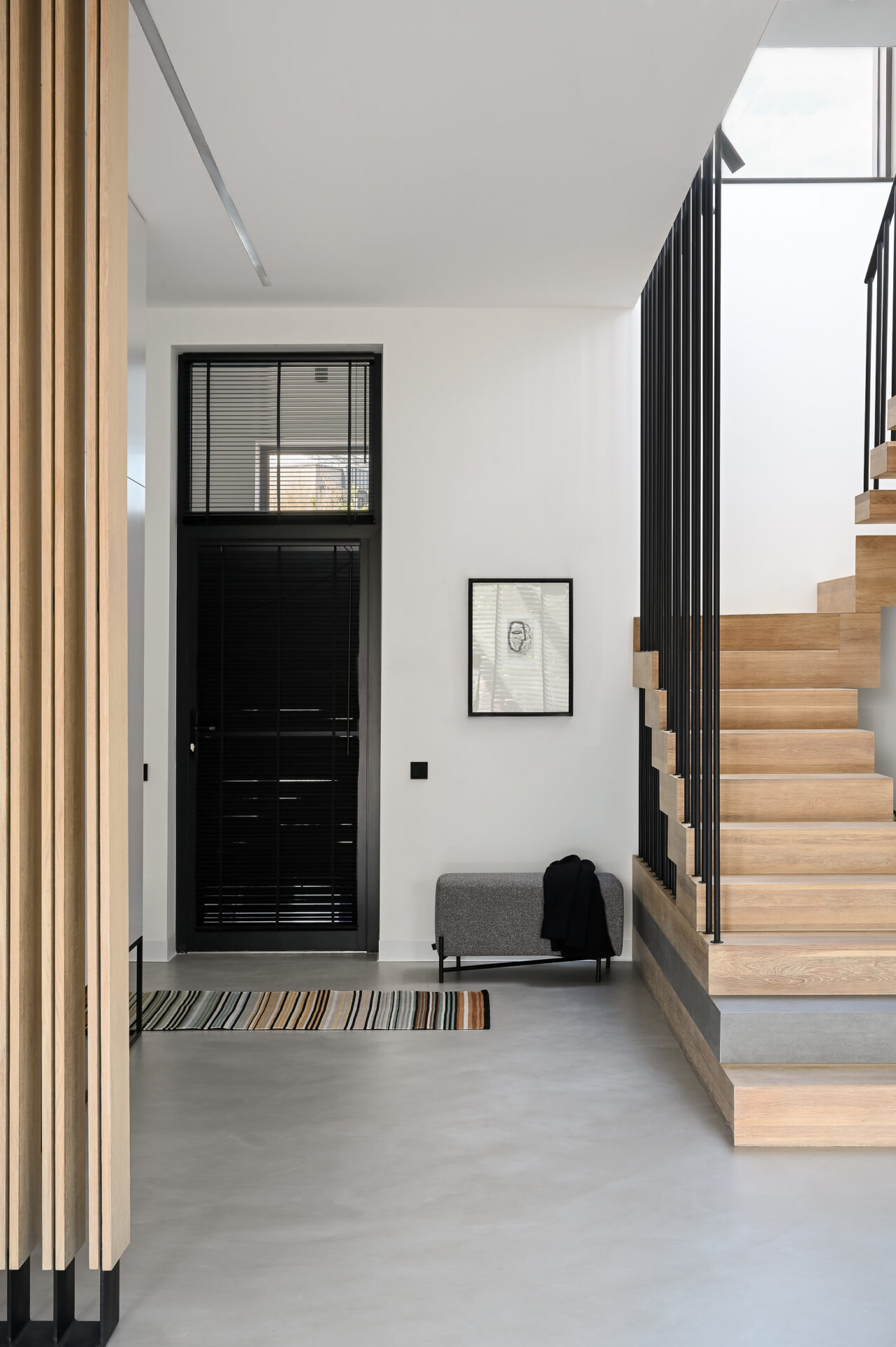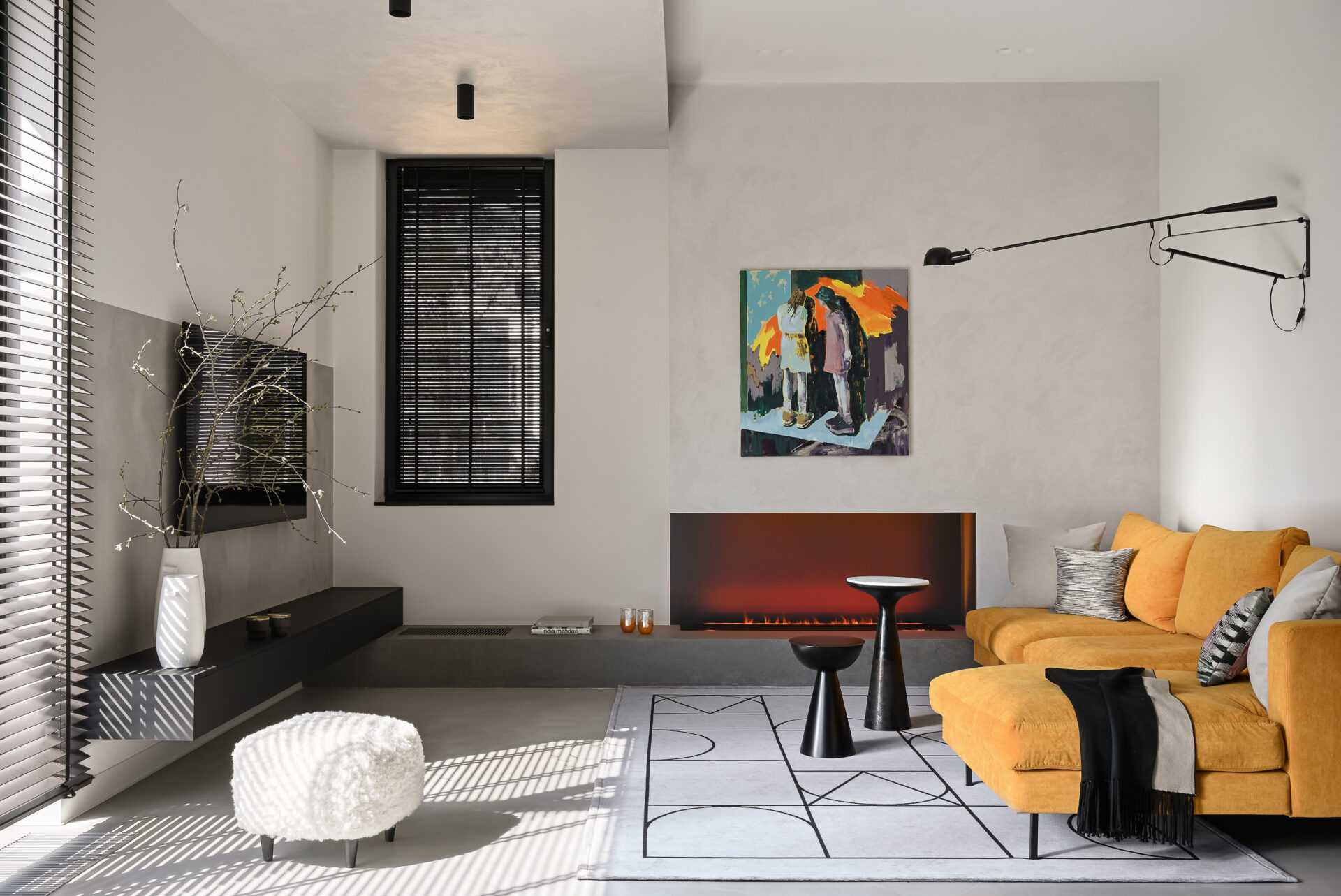 Для поддержания целостности на первом этаже сделали наливной пол с текстурой под бетон. Балки и часть перекрытия покрыли ненавязчивой штукатуркой, это создало эффект легкой дымки. Необычная игра светотени на полу и стенах, создаваемая жалюзи, и яркие блики камина добавляют ещё больше уюта.