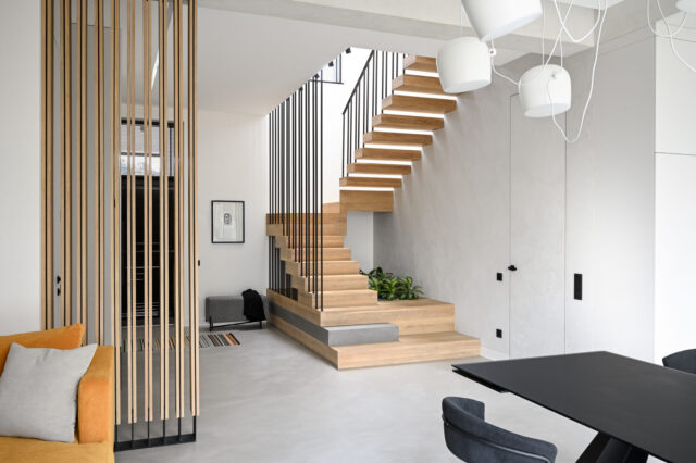Лестница оказалась одним из самых сложных конструктивных элементов. Для её монтажа усиливали стену, сочетали различные материалы такие как: металл, массив дуба, ламинам. В воплощении в реальность участвовало множество подрядчиков и благодаря слаженной работе получилось все идеально.