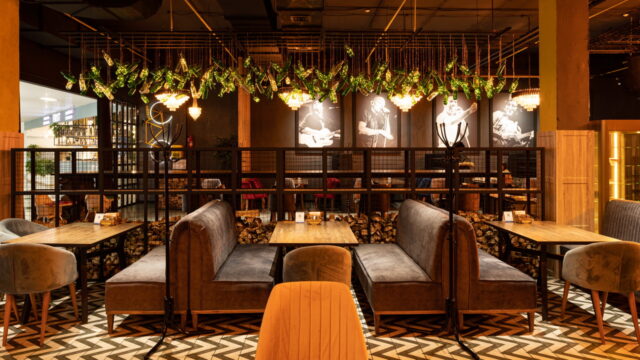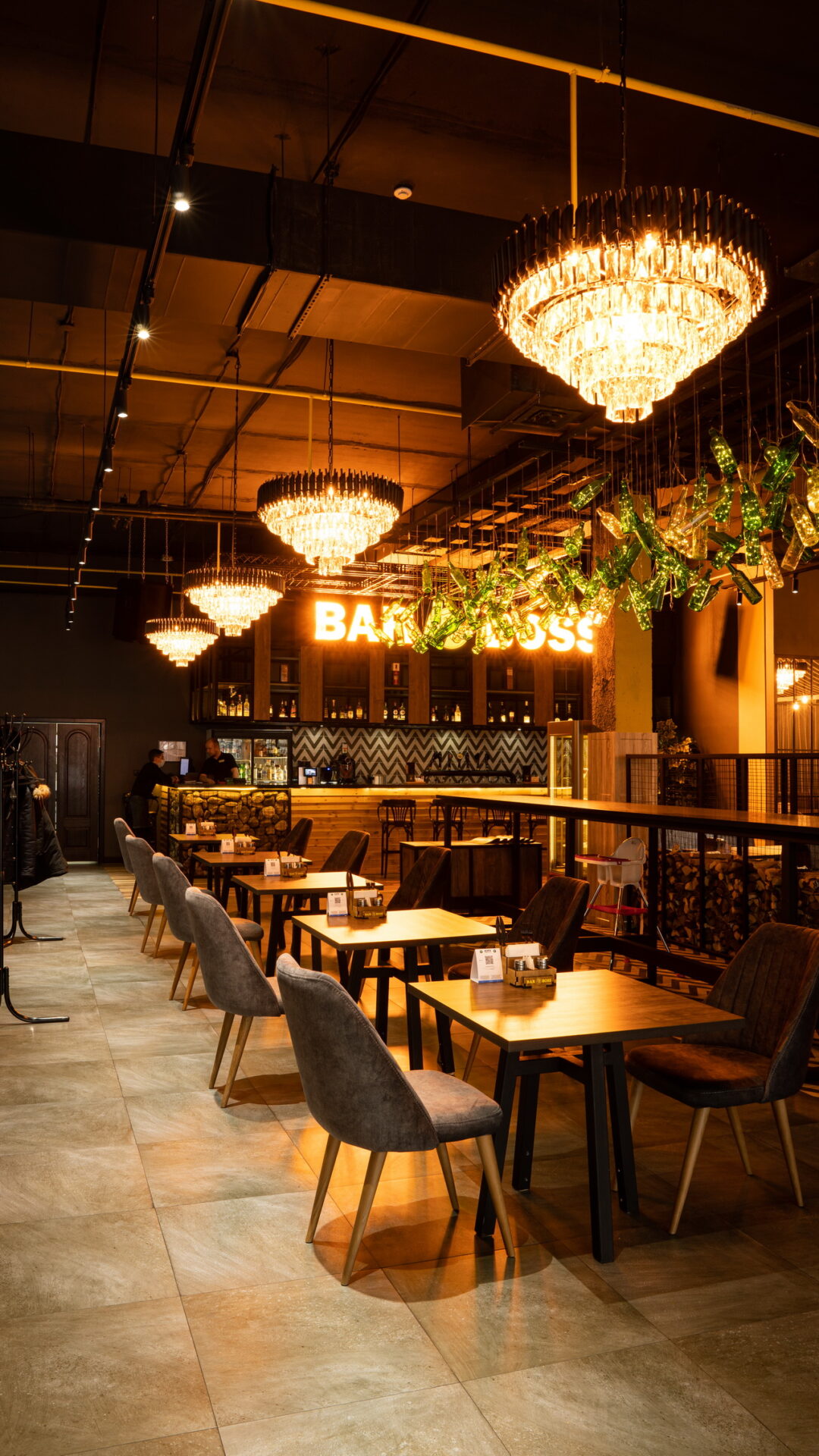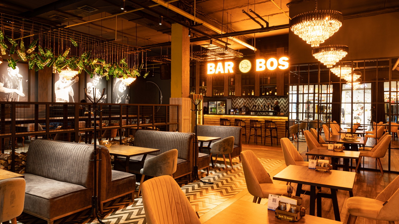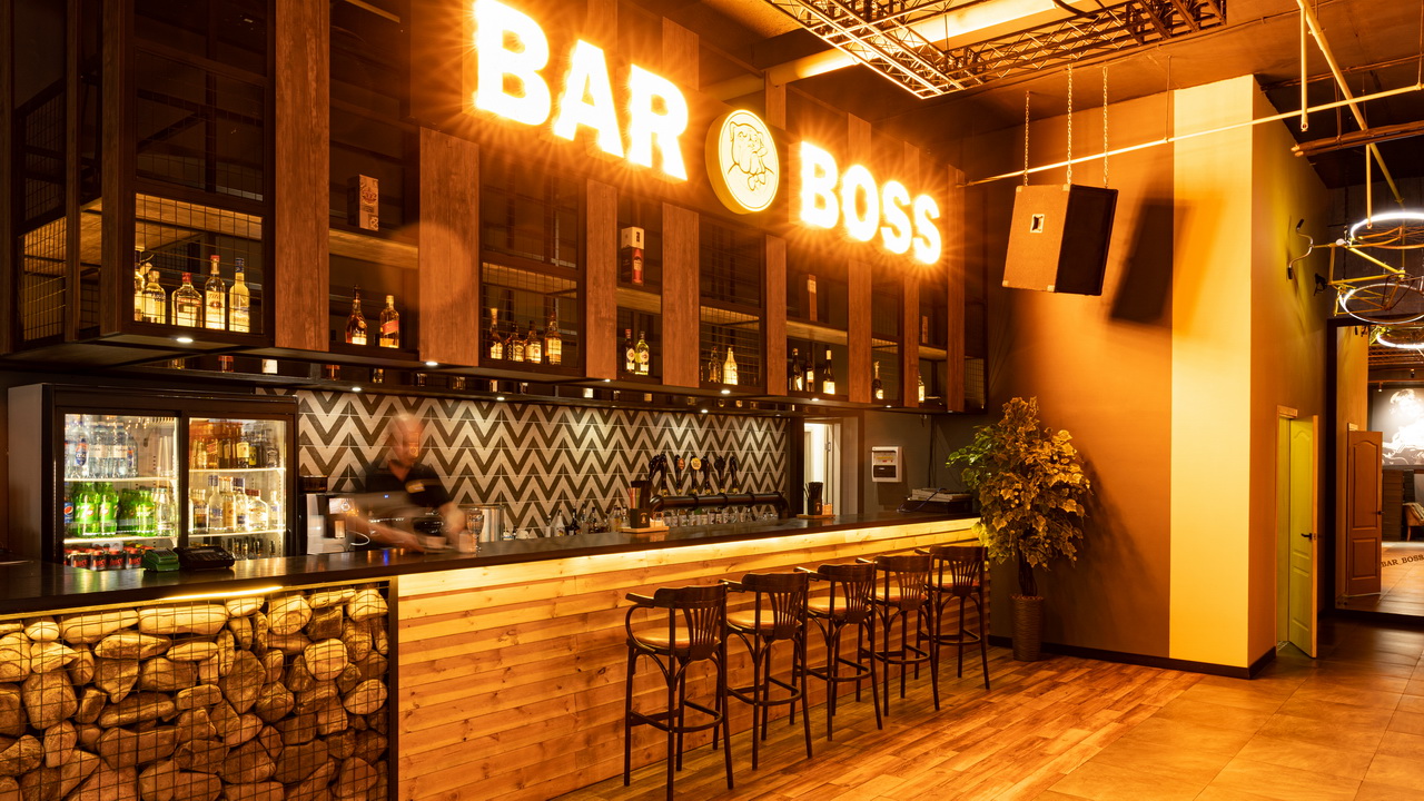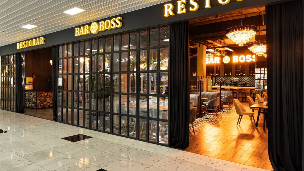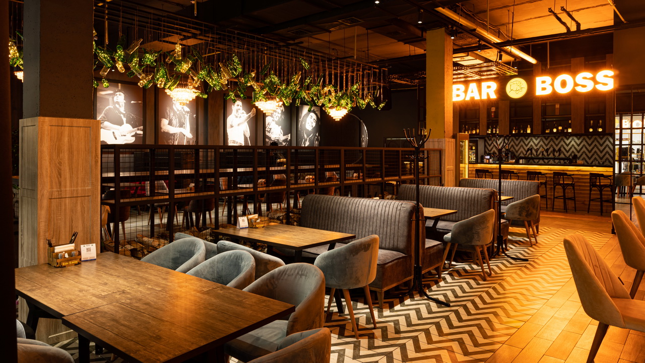 Одним из ресторанов который нам предложили сделать в торговом центре является BAR BOSS. Главным пожеланием клиентов было сделать его максимально уютным, лофтовым и с оттенком брутальности и шика. Когда мы начали его разработку, столкнулись с трудностями большой проходимости на территории торгового центра, что нам категорически не подходило. Мы постарались по возможности отгородить его довольно лёгкими перегородками, не затронув общую концепцию торгового центра и бара. Добавили пару деталей из «мужского гаража» ,которые кстати попросили вписать нас клиенты, картины с легендарными исполнителями и декоративную инсталляцию из бутылок. Несмотря на все это, бар получился довольно гармоничным и сдержанным.