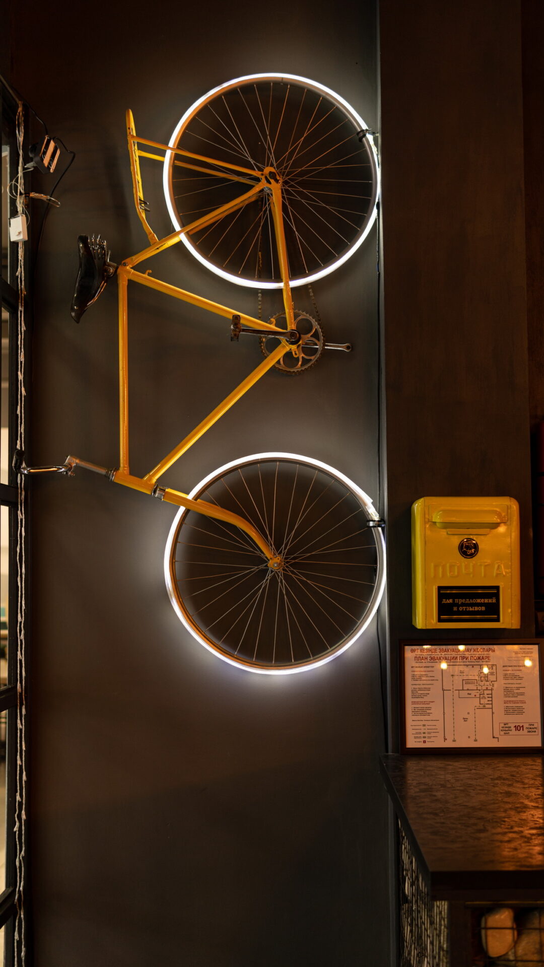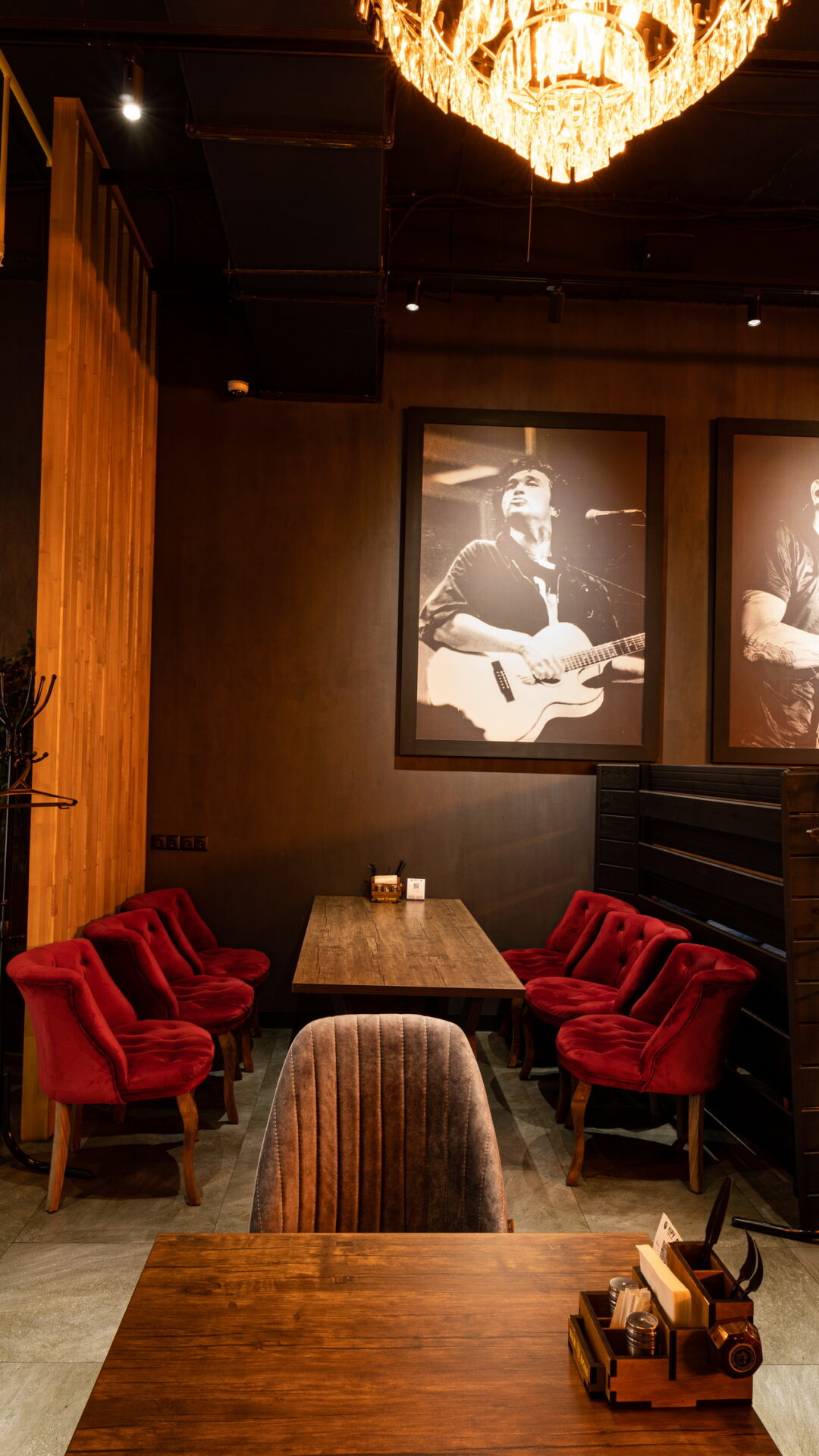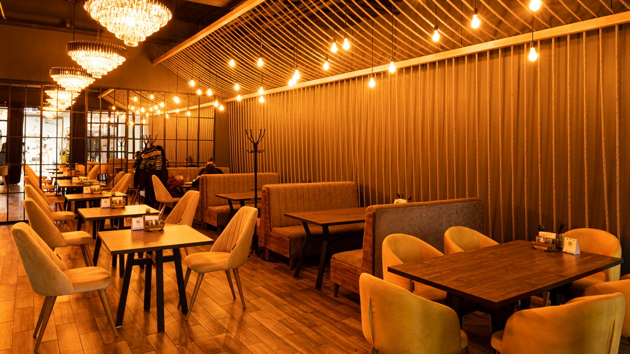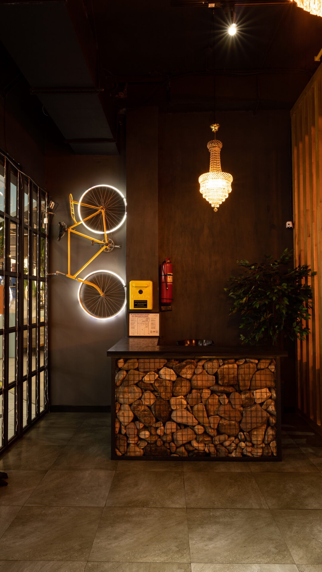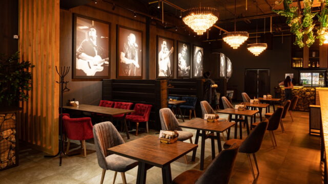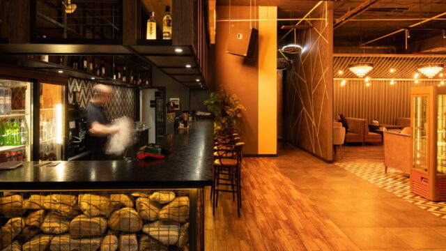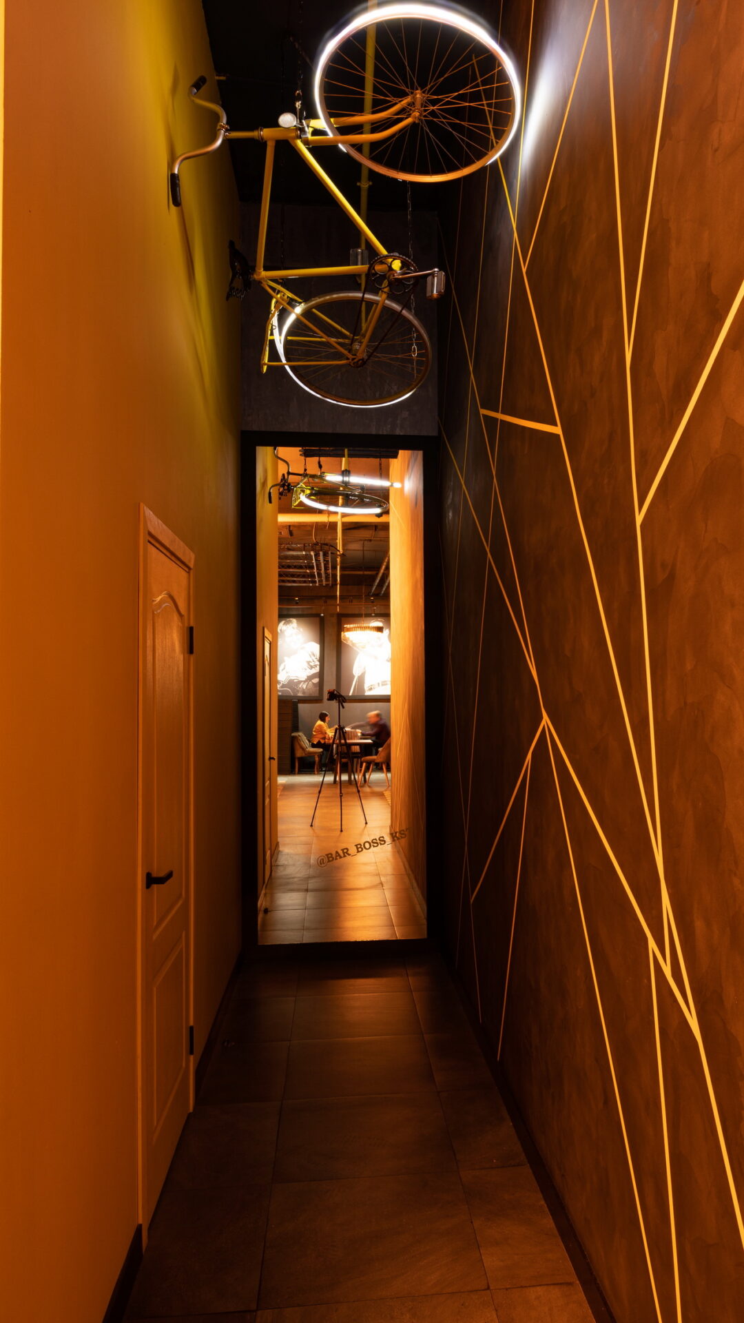 Одним из ресторанов который нам предложили сделать в торговом центре является BAR BOSS. Главным пожеланием клиентов было сделать его максимально уютным, лофтовым и с оттенком брутальности и шика. Когда мы начали его разработку, столкнулись с трудностями большой проходимости на территории торгового центра, что нам категорически не подходило. Мы постарались по возможности отгородить его довольно лёгкими перегородками, не затронув общую концепцию торгового центра и бара. Добавили пару деталей из «мужского гаража» ,которые кстати попросили вписать нас клиенты, картины с легендарными исполнителями и декоративную инсталляцию из бутылок. Несмотря на все это, бар получился довольно гармоничным и сдержанным.