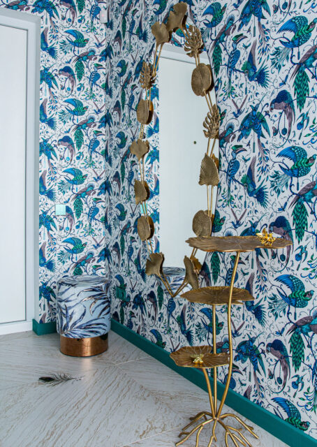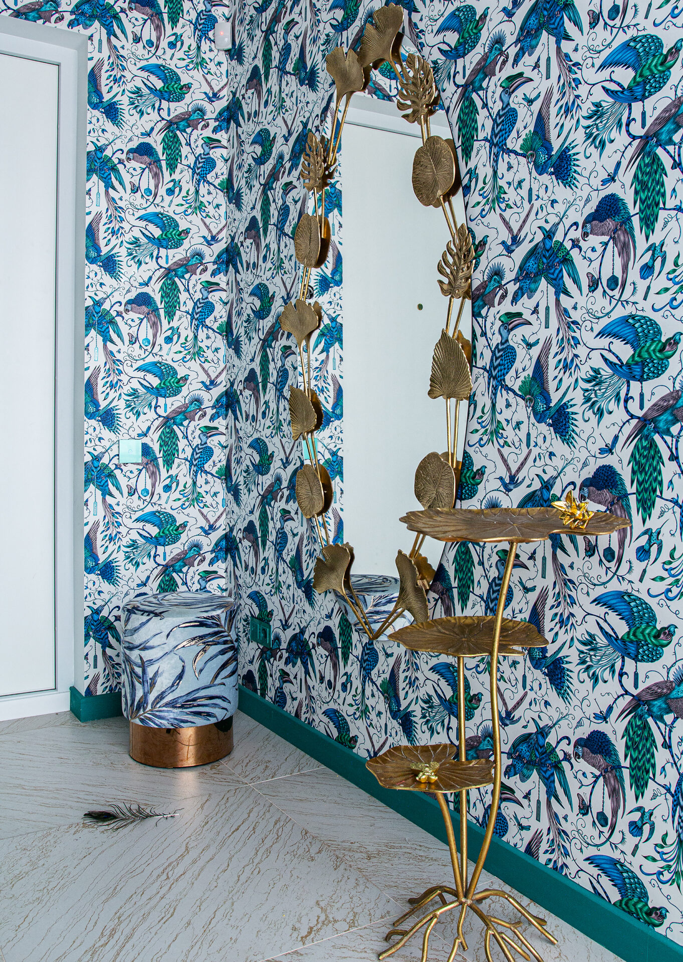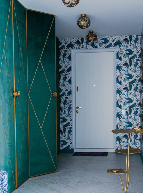 ▫️Прихожая. Изумрудный шкаф с текстильными панелями и латунными заклепками, розы ручной работы итальянских мастеров и конечно, птицы из самой чащи тропических лесов встречают на входе своим пением 🦜🦚🦩