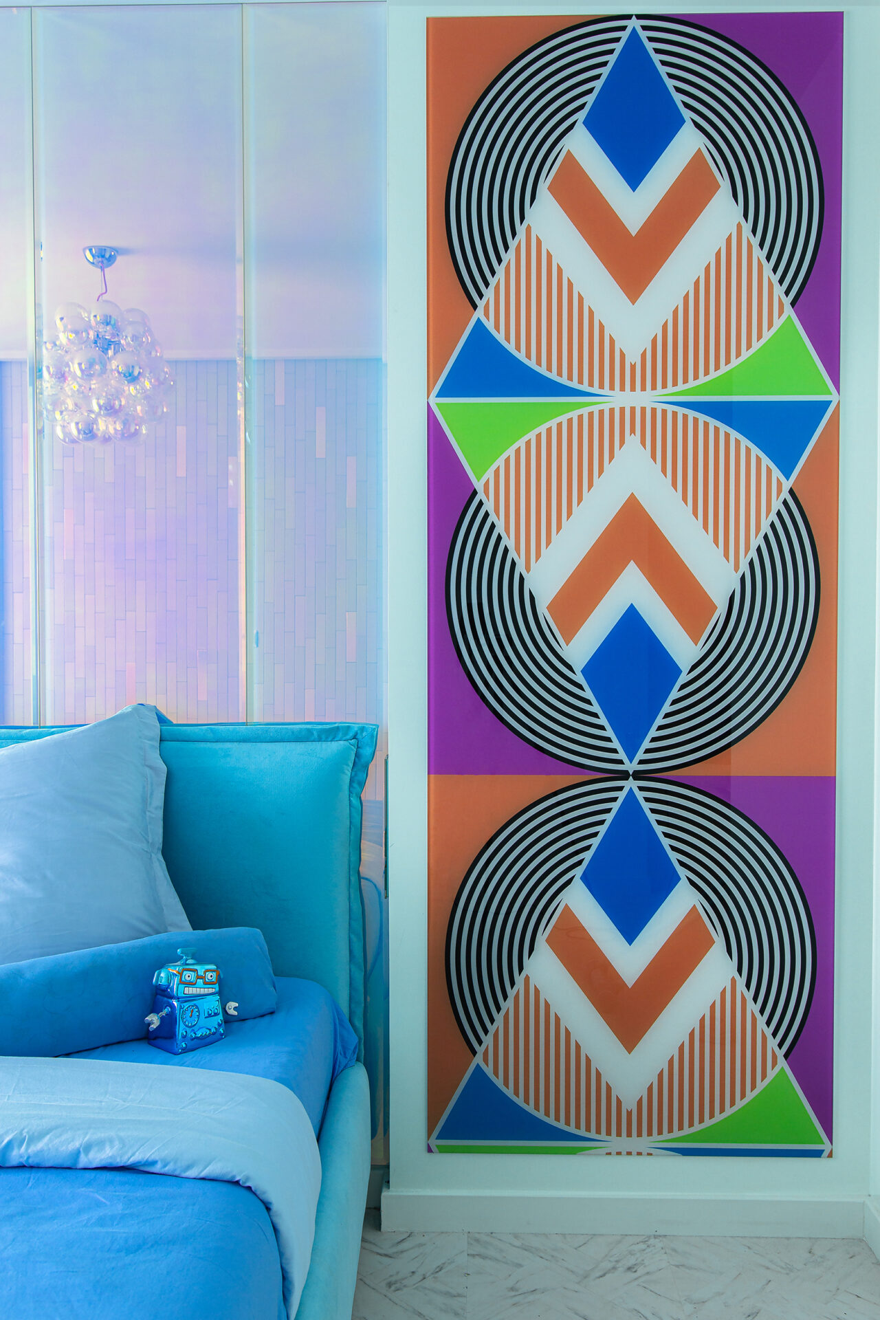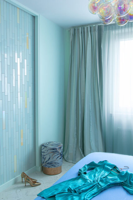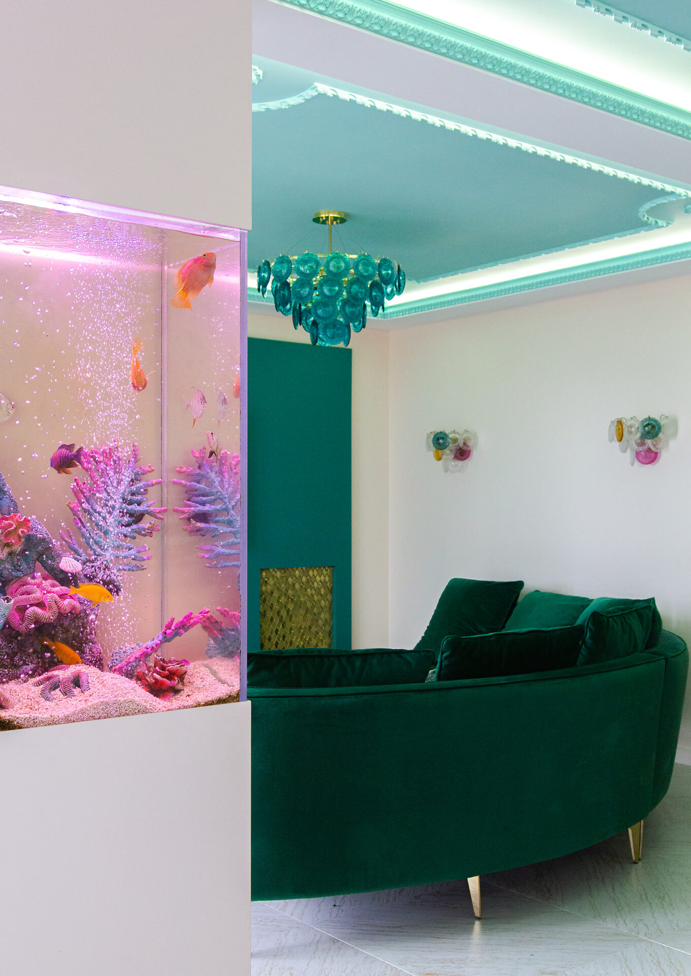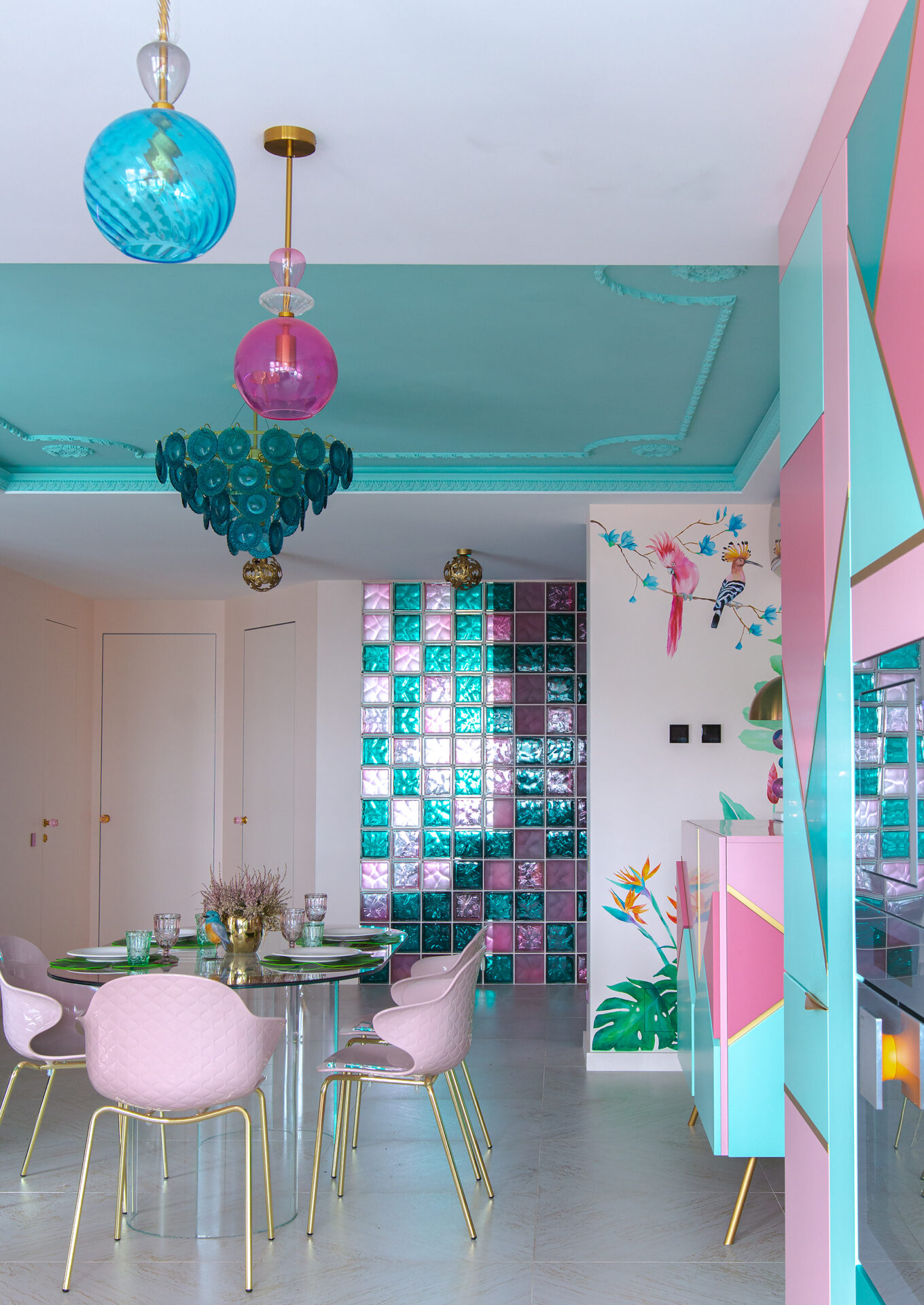 Игра геометрии красок, рабочая зона из мятного акрила и зеркала создают атмосферу кафе у океана 💙
