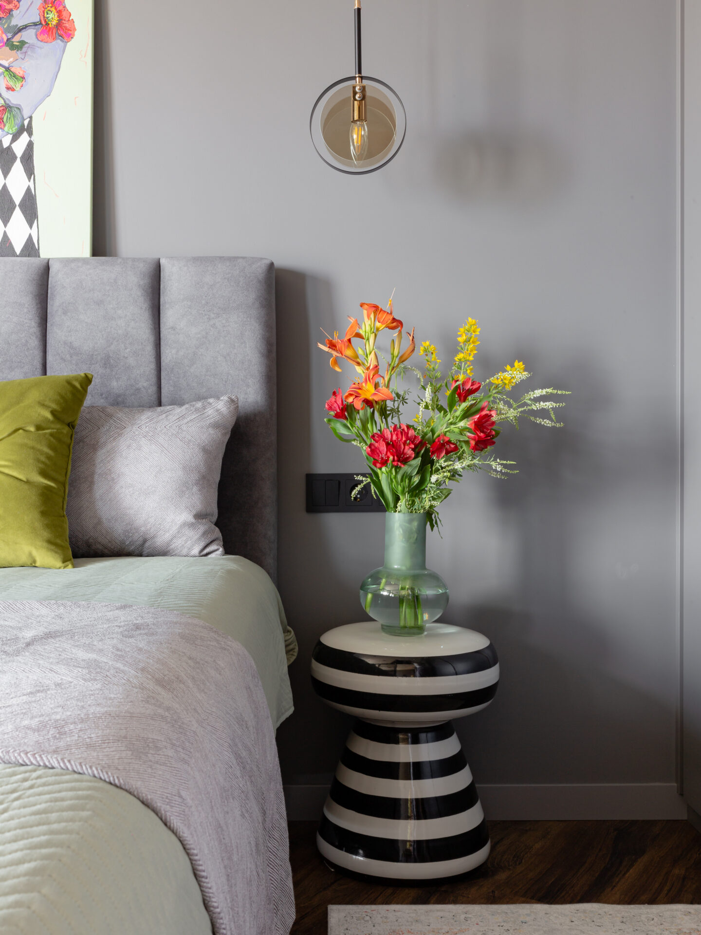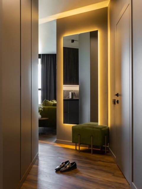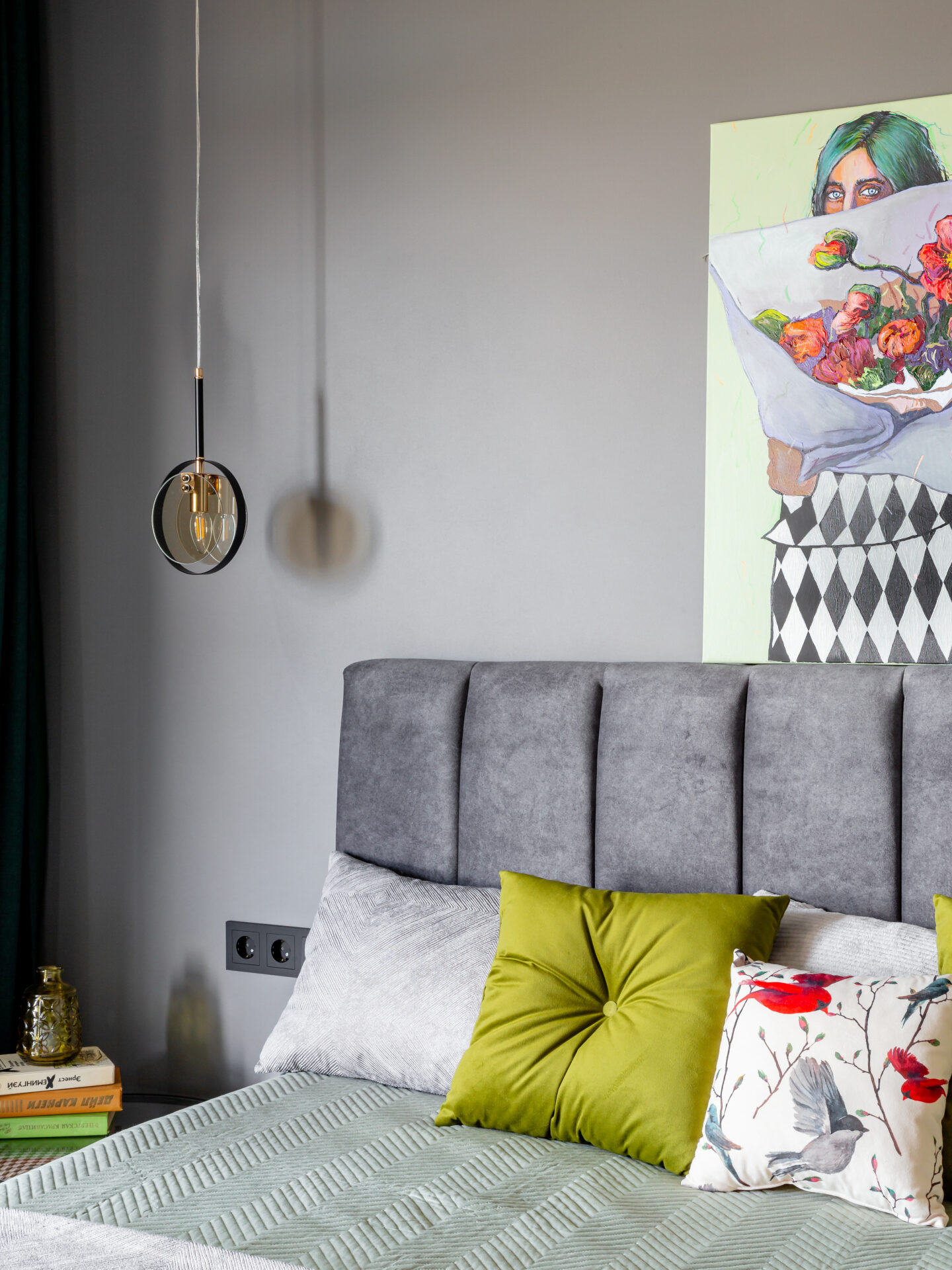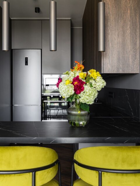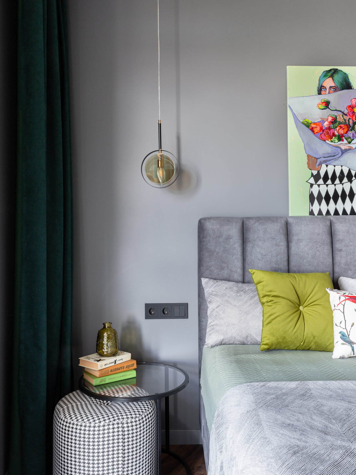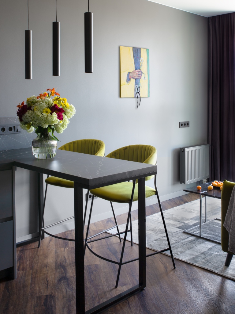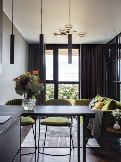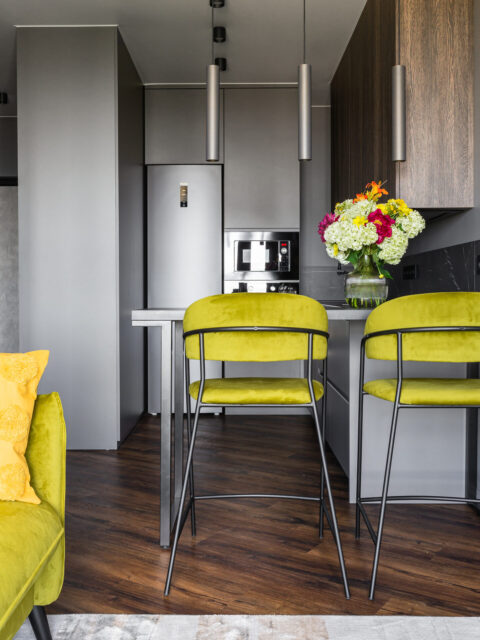 Проект Лайм, ЖК Минск Мир – небольшая квартира для смелой молодой пары. В проекте развенчиваем сразу 2 мифа о том, что сложно что-то интересное придумать на 39 квадратах, и что темные цвета не для маленьких квартир. В нашем случае темный цвет стен служит фоном для ярких цветов в мебели и декоре, где получилось подчеркнуть все оттенки зеленого. Для кухни-гостиной выбрали яркие сочные цвета, в спальне остановились на более спокойных оттенках. Темный санузел как грот, который снимает всю накопившуюся усталость после долгого рабочего дня. Стеклянная перегородка, отделяющая спальню от кухни-гостиной, сливается с панорамным остеклением и добавляет воздуха в пространство. В проекте при небольшом метраже получилось расположить достаточно вместительную кухню, отделив ее от коридора просторным шкафом для хранения. И полноценную спальную комнату, куда встала кровать шириной 180 с сохранением нормальных проходов по периметру, и вместительный шкаф для хранения вещей.