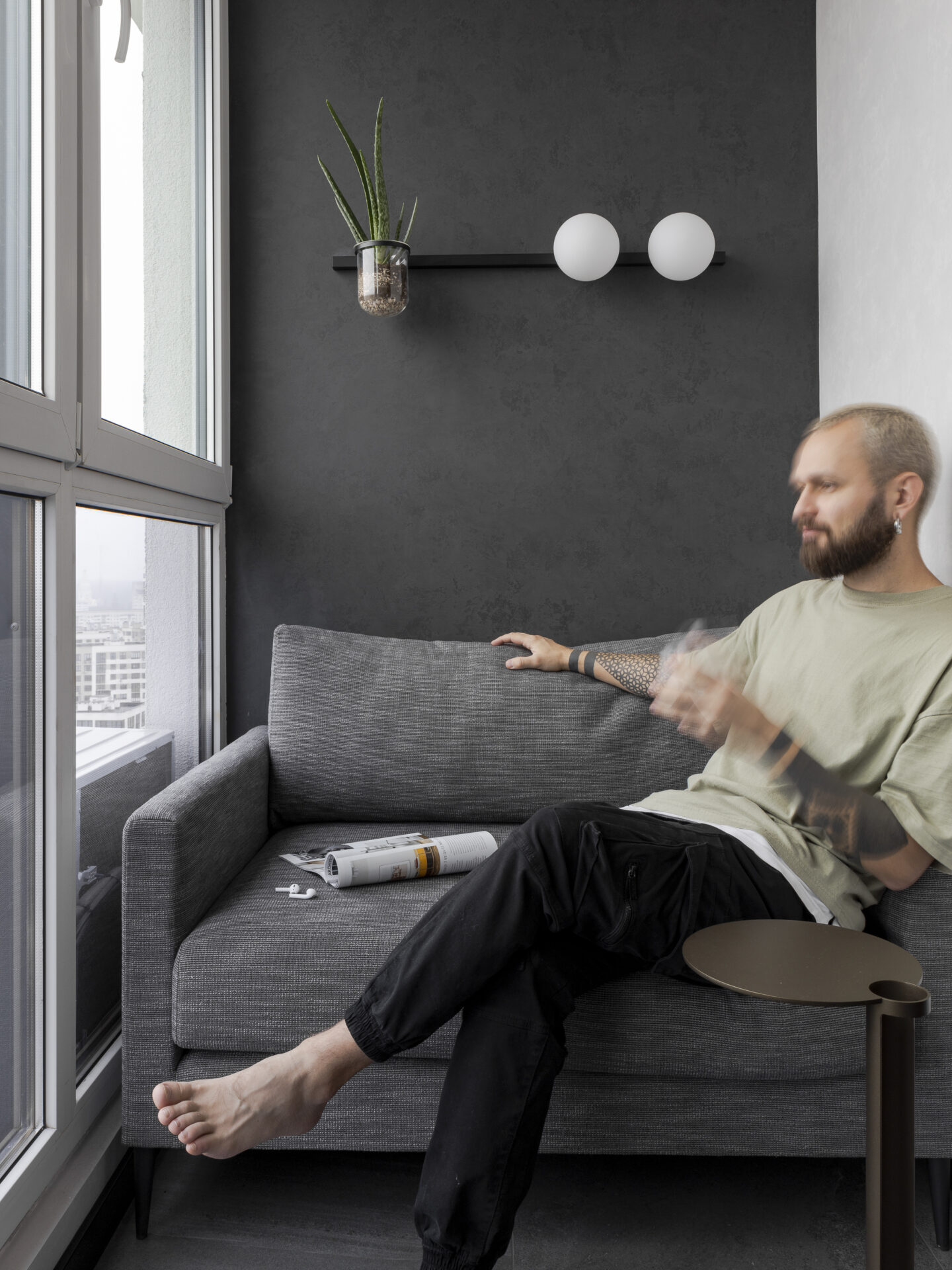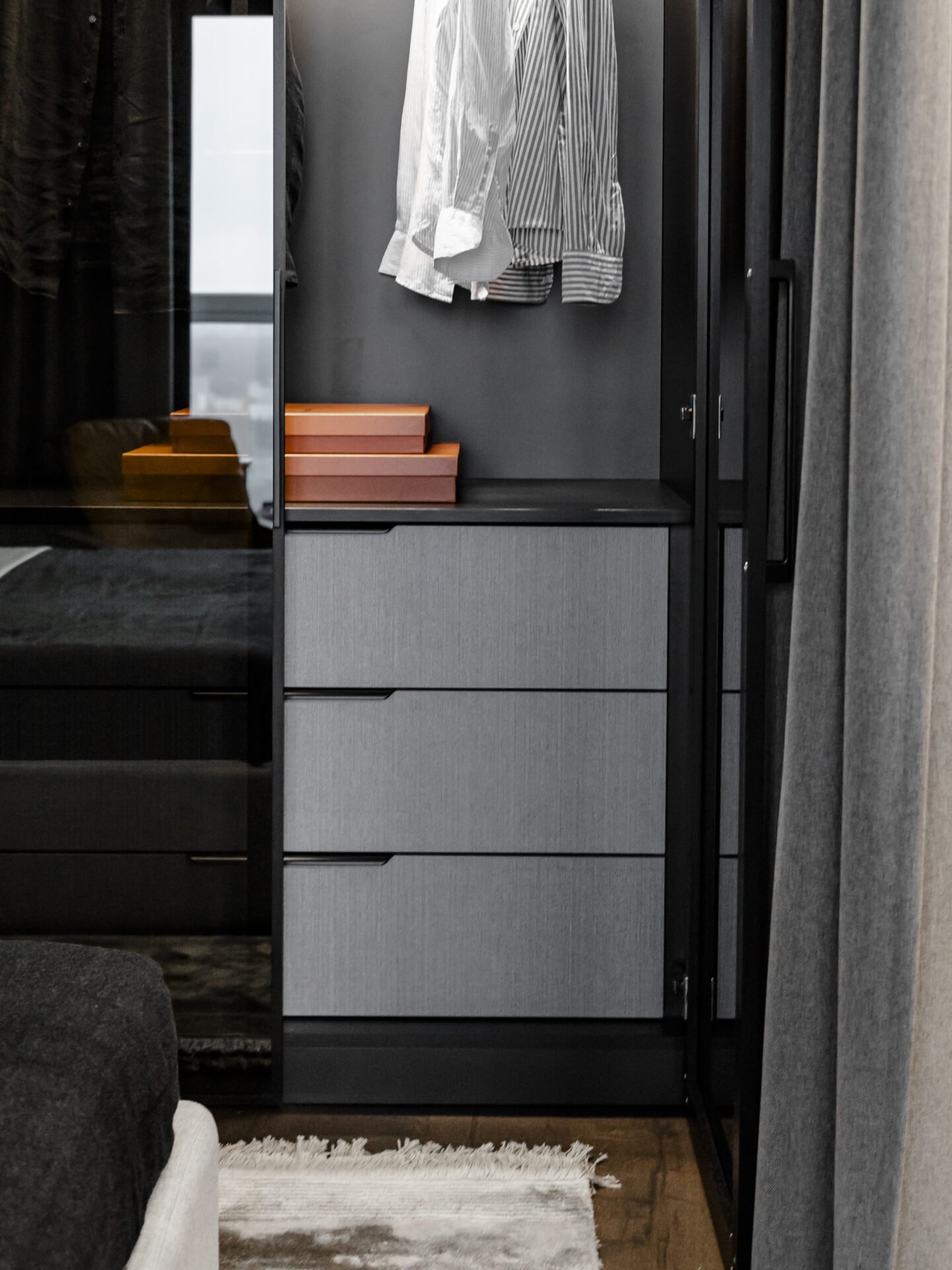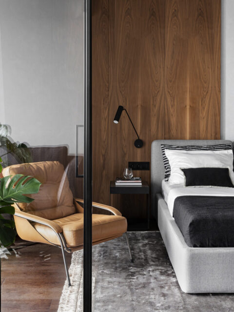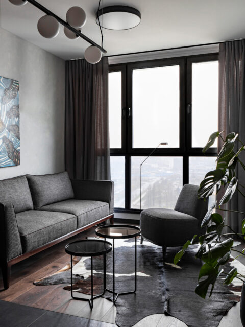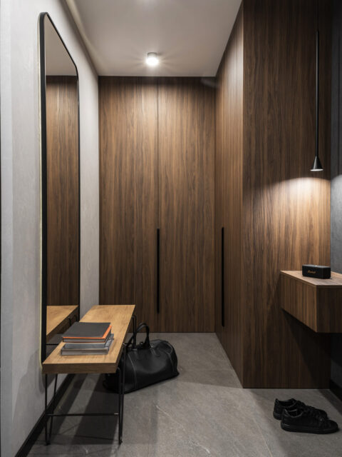 Объект был реализован для молодого мужчины в ЖК Маяк Минска, на 20 этаже с прекрасным видом. Квартира не большая, всего 48.5 кв.м. Основным требованием от заказчика было сделать пространство максимально просторным, практически не используя перегородок, сохранить естественный свет и использовать для отделки преимущественно темные обволакивающие цвета и материалы. Для того, чтобы сохранить пространство дизайнеры отказались от гардеробной в сторону создания просторной прихожей с большим количеством мест для хранения. Кухня-гостиная и зона спальни разделены большой стеклянной перегородкой которая сохраняет объем помещения и при необходимости может эффективно зонировать пространство. При создании концепции дизайнеры отталкивались от предпочтений и вкусов клиента: смелый, уверенный в себе молодой мужчина напомнил крепкий, экзотический, мужской напиток — Бурбон. Так и родилось название проекта. Насыщенный золотистый цвет напитка реализовали в фасадах мебели и шпонированных стеновых панелях. Для отделки стен применили декоративную штукатурку. В сочетании с темными обволакивающими цветами камня, металла, дерева и богатыми фактурными тканями удалось создать уютное мужское убежище от современной городской суеты.