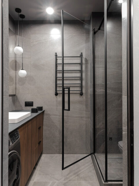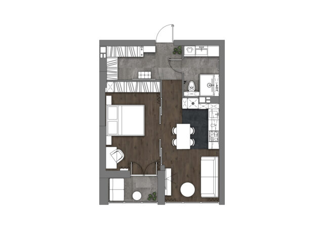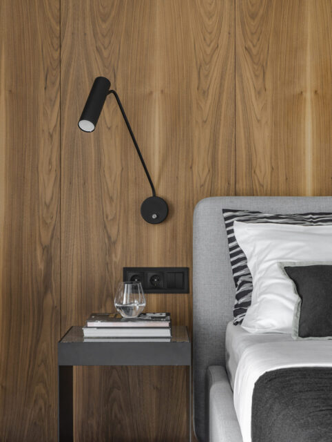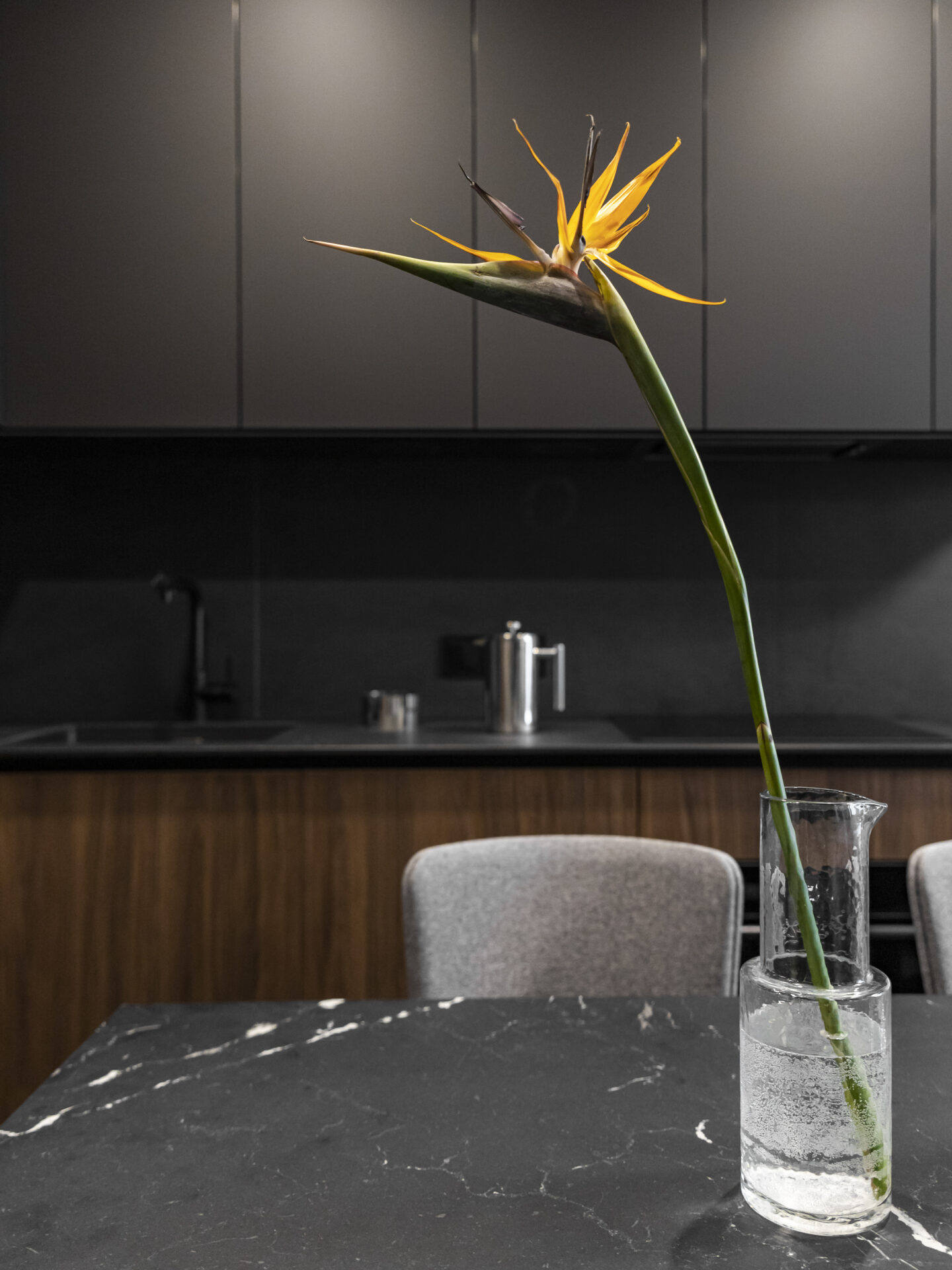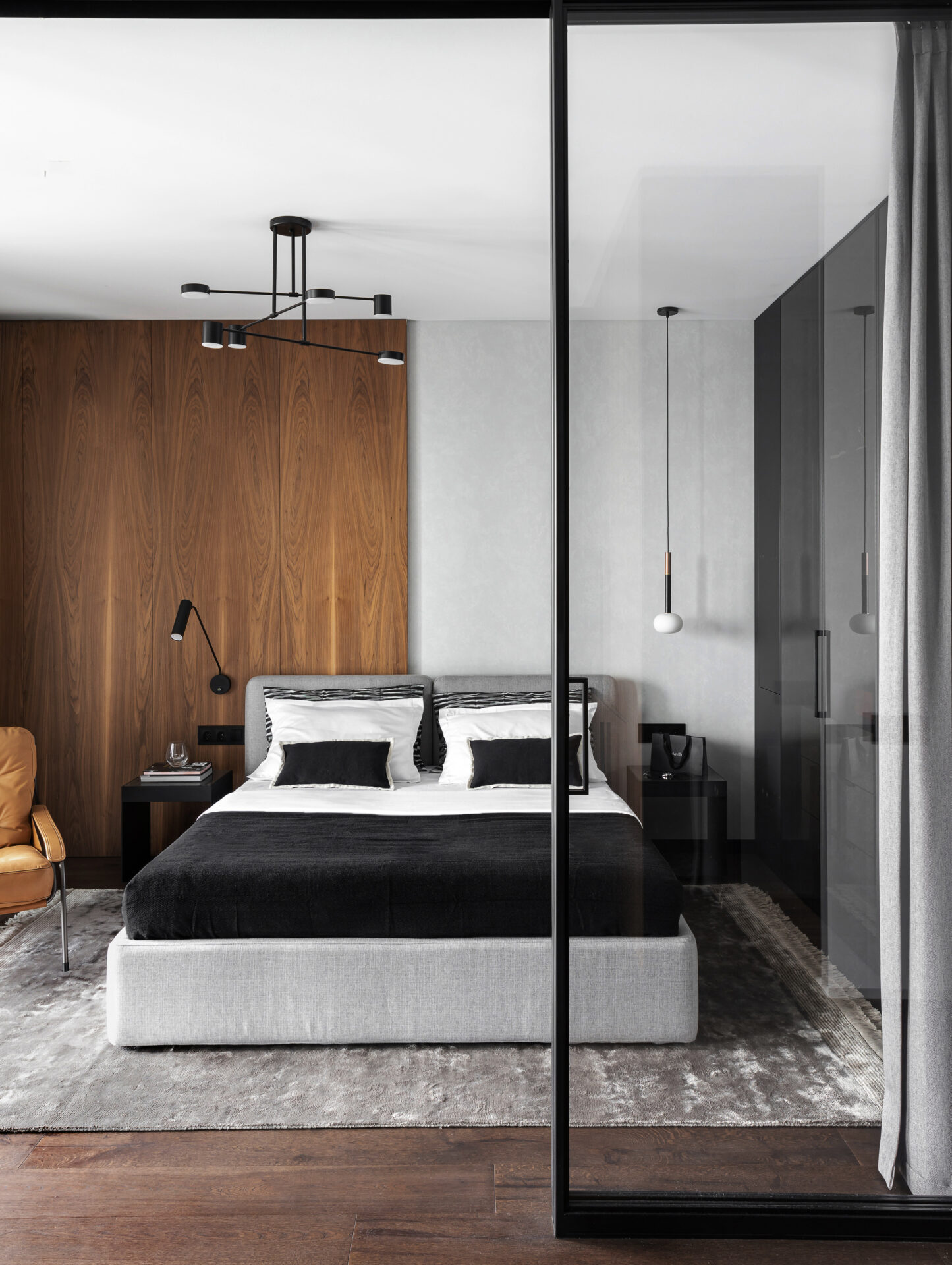 Объект был реализован для молодого мужчины в ЖК Маяк Минска, на 20 этаже с прекрасным видом. Квартира не большая, всего 48.5 кв.м. Основным требованием от заказчика было сделать пространство максимально просторным, практически не используя перегородок, сохранить естественный свет и использовать для отделки преимущественно темные обволакивающие цвета и материалы. Для того, чтобы сохранить пространство дизайнеры отказались от гардеробной в сторону создания просторной прихожей с большим количеством мест для хранения. Кухня-гостиная и зона спальни разделены большой стеклянной перегородкой которая сохраняет объем помещения и при необходимости может эффективно зонировать пространство. При создании концепции дизайнеры отталкивались от предпочтений и вкусов клиента: смелый, уверенный в себе молодой мужчина напомнил крепкий, экзотический, мужской напиток — Бурбон. Так и родилось название проекта. Насыщенный золотистый цвет напитка реализовали в фасадах мебели и шпонированных стеновых панелях. Для отделки стен применили декоративную штукатурку. В сочетании с темными обволакивающими цветами камня, металла, дерева и богатыми фактурными тканями удалось создать уютное мужское убежище от современной городской суеты.