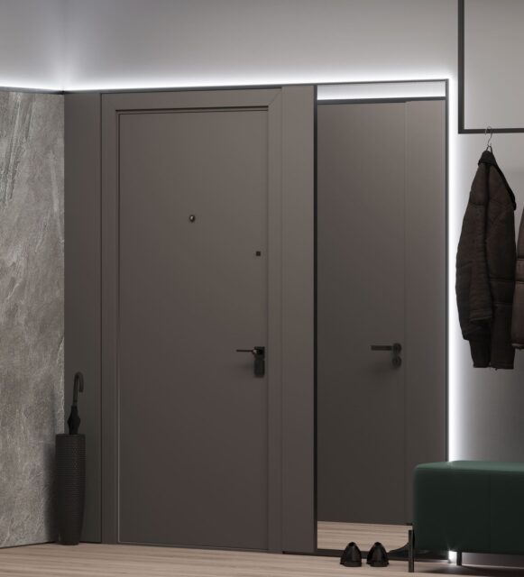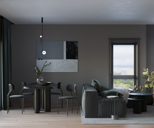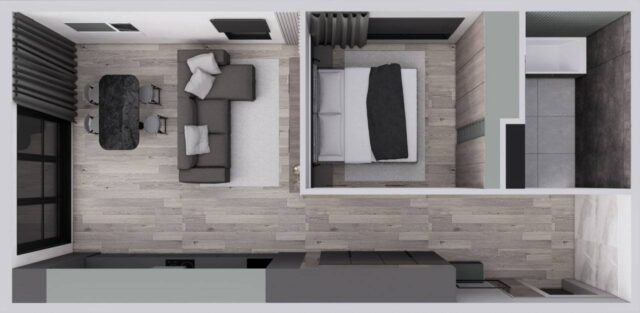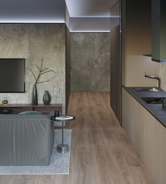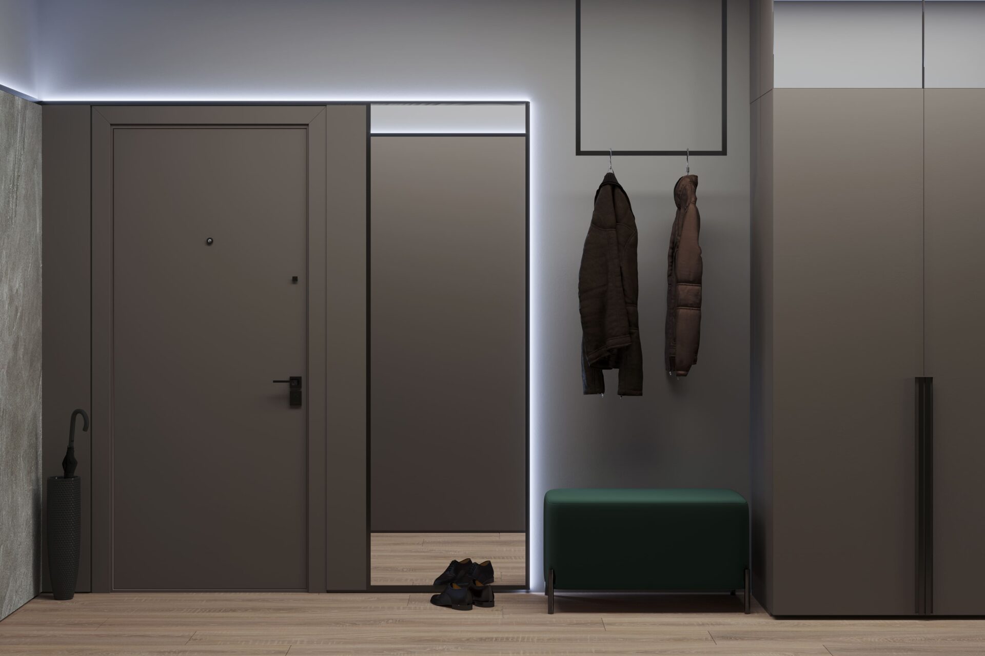 В зоне гостиной расположен большой стол неправильной формы и невысокий мягкий диван. ТВ-зона отделана широкоформатным керамогранитом, которая перекликается с отделкой прихожей. В прихожей использовано интересное решение c горизонтальным делением стены и декоративной подсветкой. Графичности интерьеру добавляет прямоугольное зеркало в тонкой раме и металлическая вешалка для одежды.