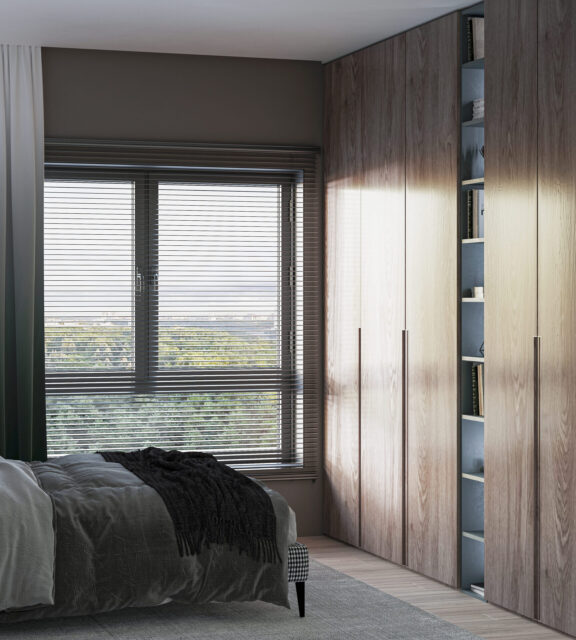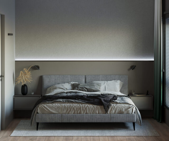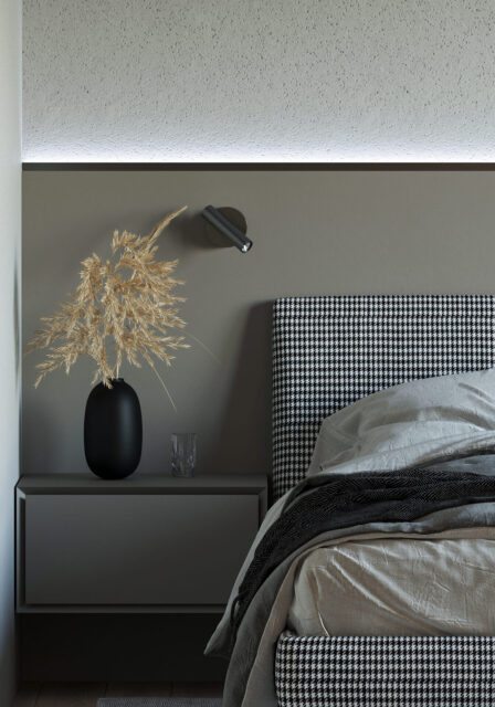 В спальне расположена удобная кровать и большая система хранения. Стена за изголовьем украшена декоративной штукатуркой, имитирующей бетон.