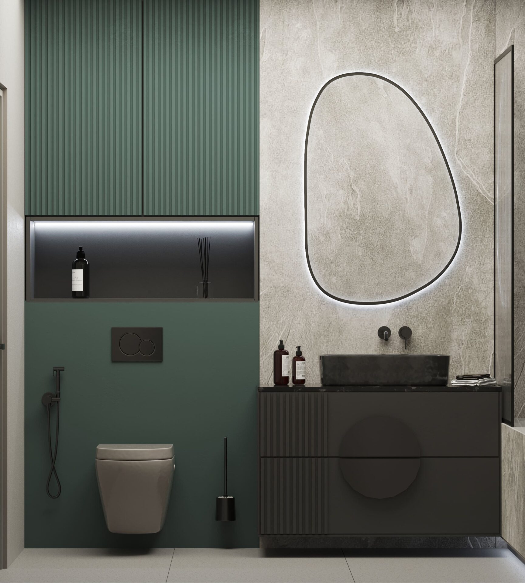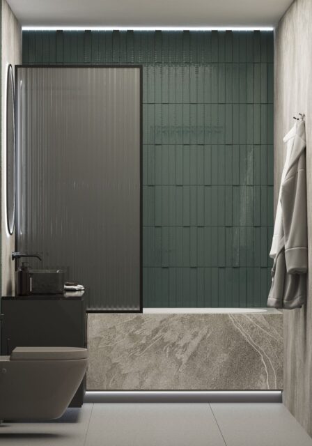 В ванной фокусной точкой, служит стена из рельефной плитки. Также стоит отметить использование цветной сантехники и широкоформатного керамогранита.