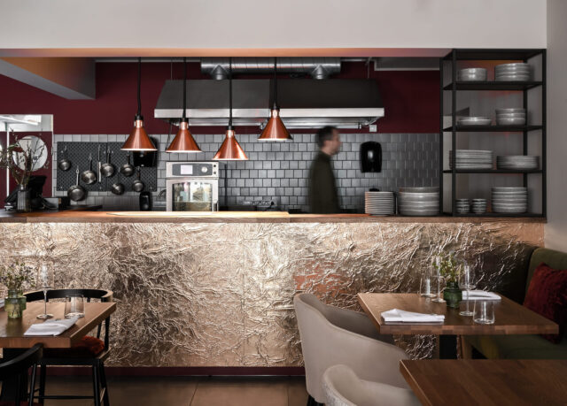 Кухня полностью открыта для посетителей, что позволяет им наблюдать за работой поваров. А стойка, за которой готовятся блюда, отделана панелями, имитирующими листы мятой латуни.