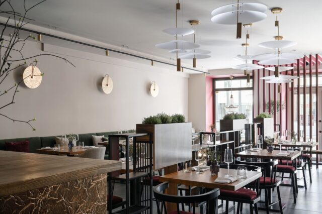 Центральная зона ресторана подсвечивается композицией из люстр. Невысокий стеллаж посредине помещения несет не только декоративную функцию, но и разделяет пространство, создавая более интимную обстановку для сидящих там гостей.