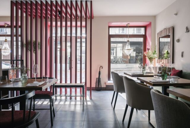 Реализованный интерьер ресторана «Roots» находится в самом центре города Вильнюс, Литва. На общей площади в 85 м2 удалось разместить 16 столиков на 36 посадочных мест. Главной задачей, с которой обратился владелец и шеф-повар ресторана, было создать стильный современный интерьер, который бы дополнял и поддерживал основную гастрономическую линию заведения. В основе меню ресторана лежит локальный продукт — корнеплоды. Отсюда и название проекта «Roots». Природная тема отражается и в интерьере ресторана. В цветовой гамме преобладают натуральные тона: теплый бежевый, травянистый зелёный, свекольно-бордовый, а также использовано дерево и металл.