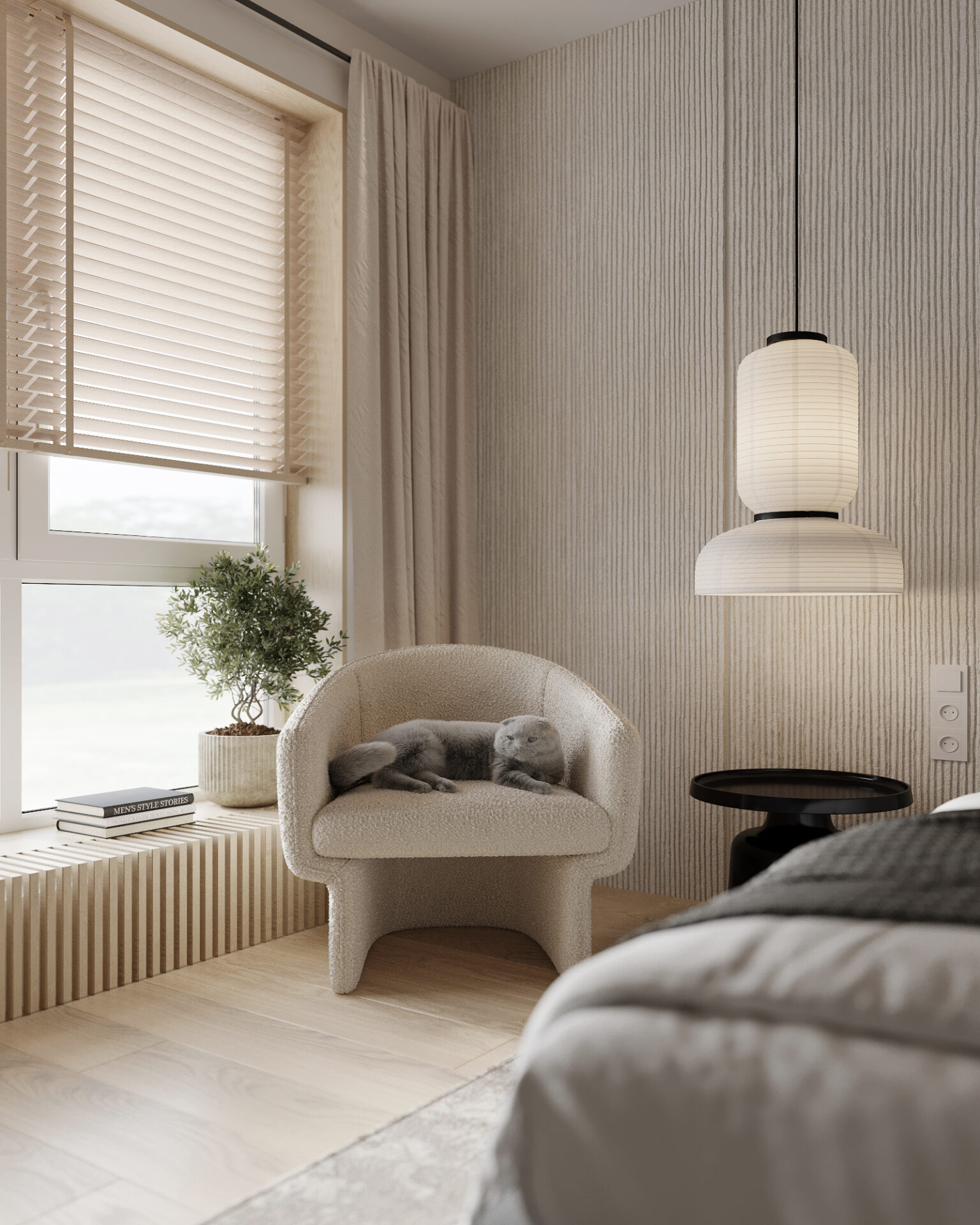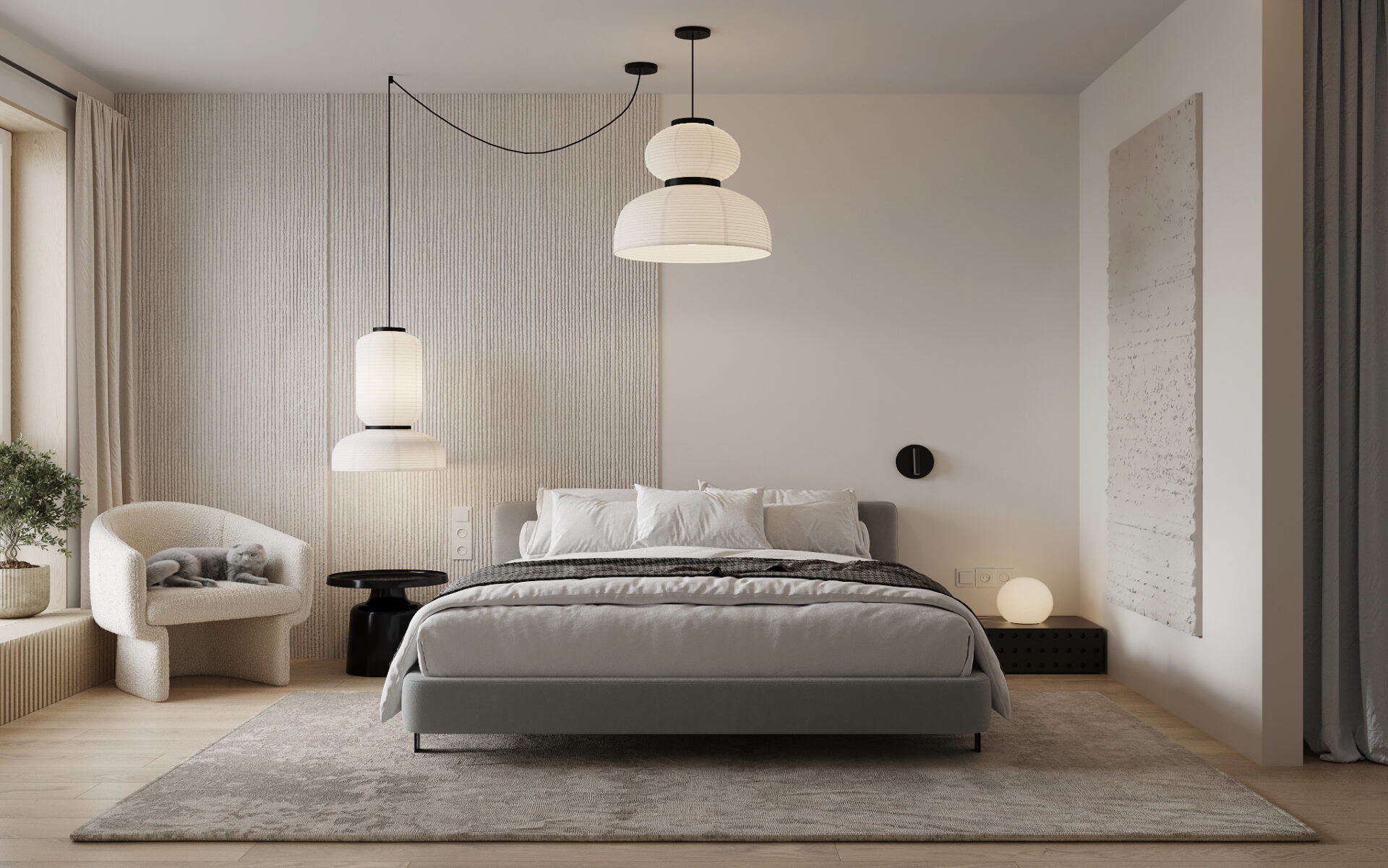 Отправной точкой для спальни стали подвесные светильники &tradition Formakami, которые внесли ноту японской атмосферы. Отделка стен — рукотворная штукатурка и гладкие крашенные плоскости. Игра фактур.