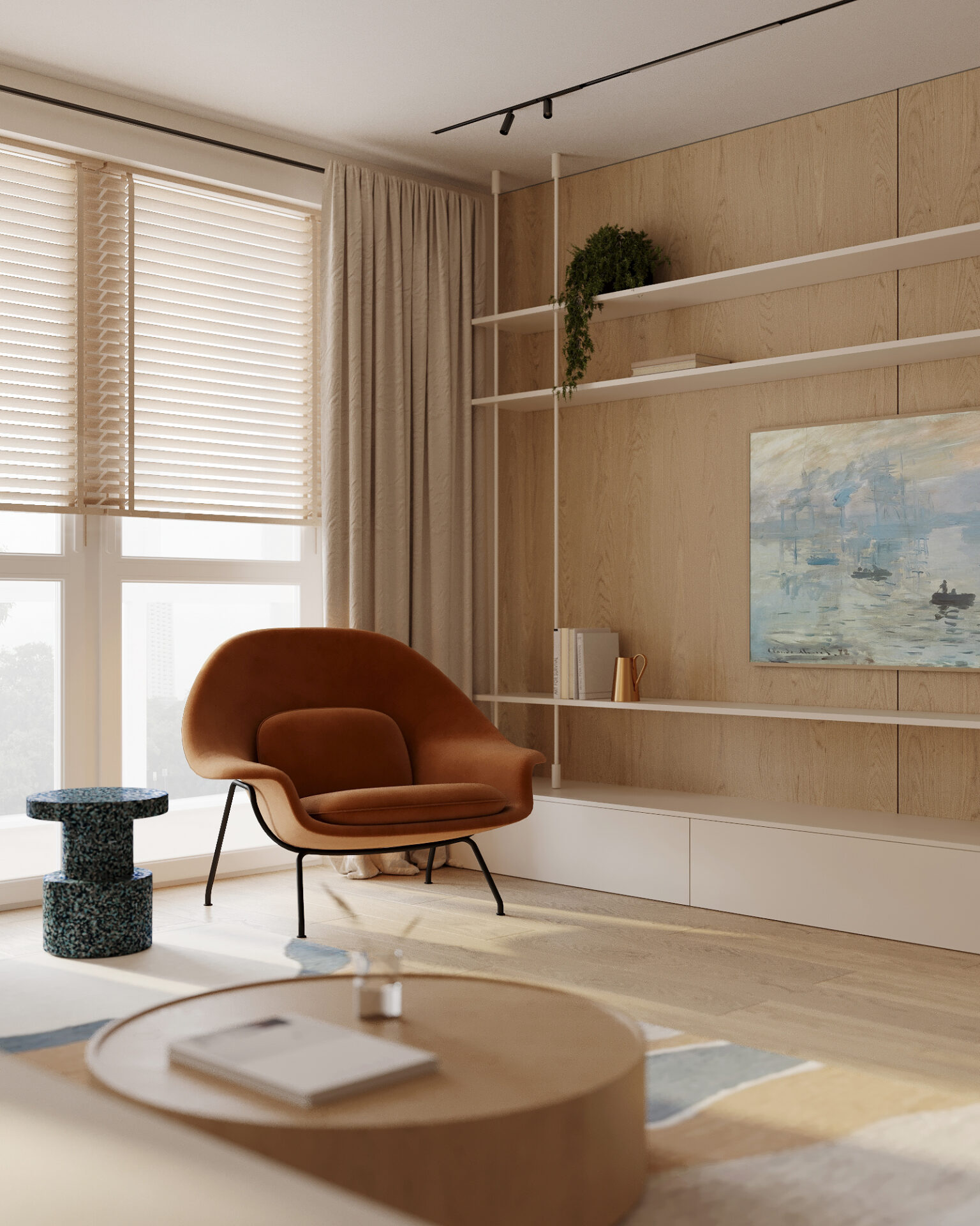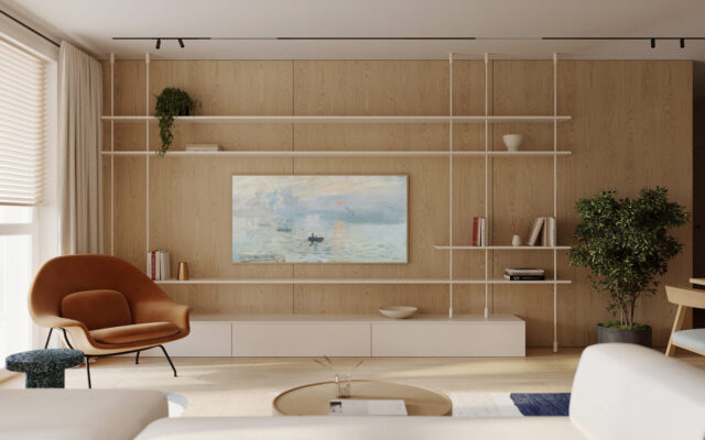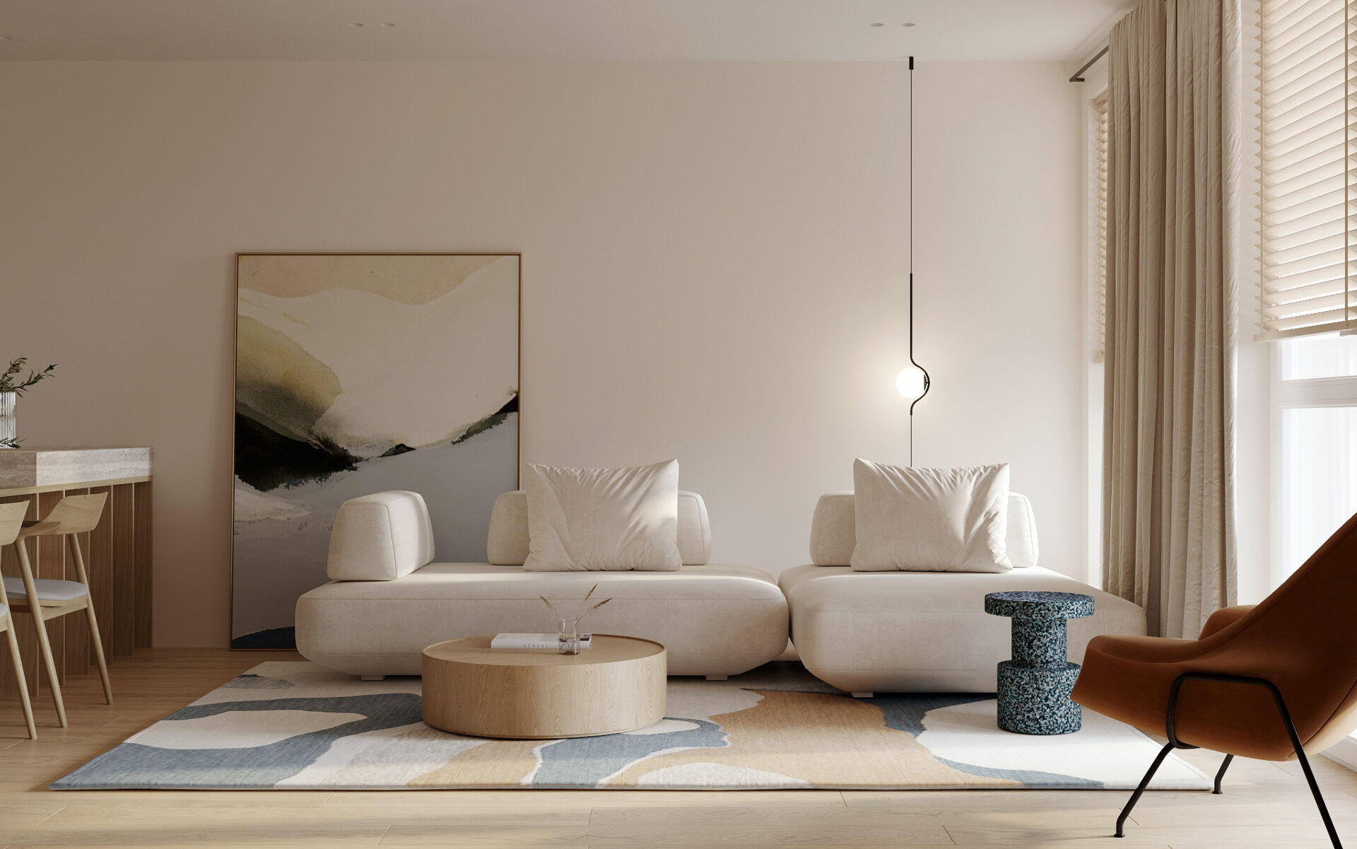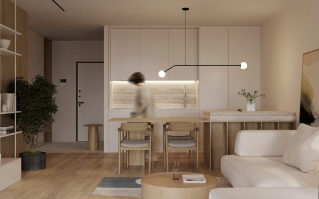 Цветовая гамма интерьера была продиктована пожеланиями заказчиков и ориентацией по сторонам света. В вечернее время все пространство залито теплым закатным светом. Базу в виде молочного оттенка для стен и потолка дополняет текстура выбеленного дуба паркета и стеновых панелей, травертин, голубые и синие оттенки в декоре и текстиле всего интерьера квартиры.
