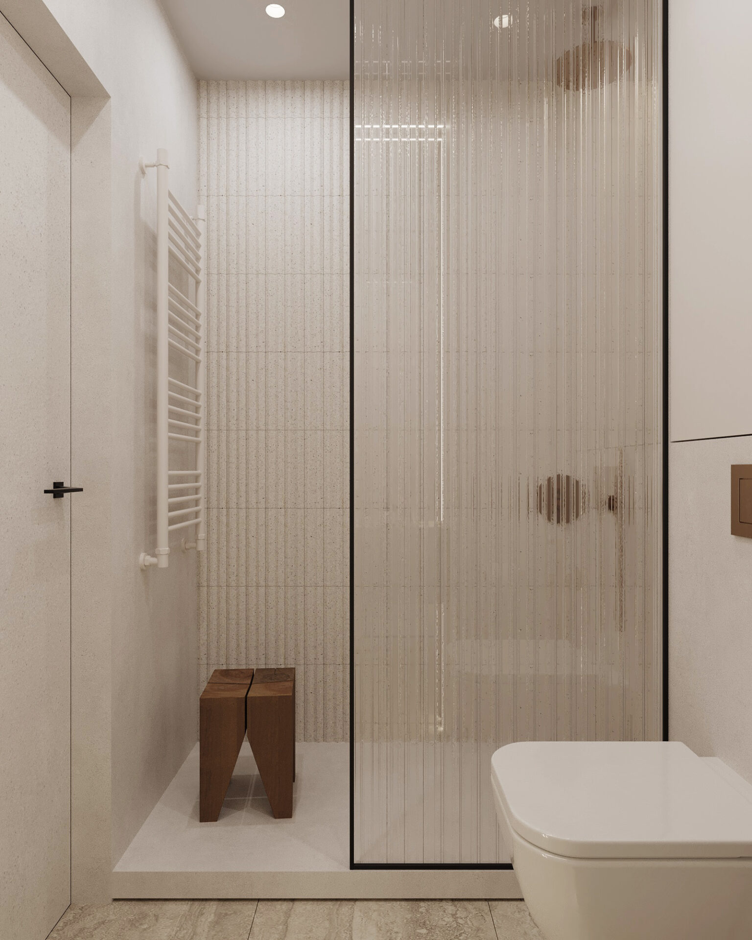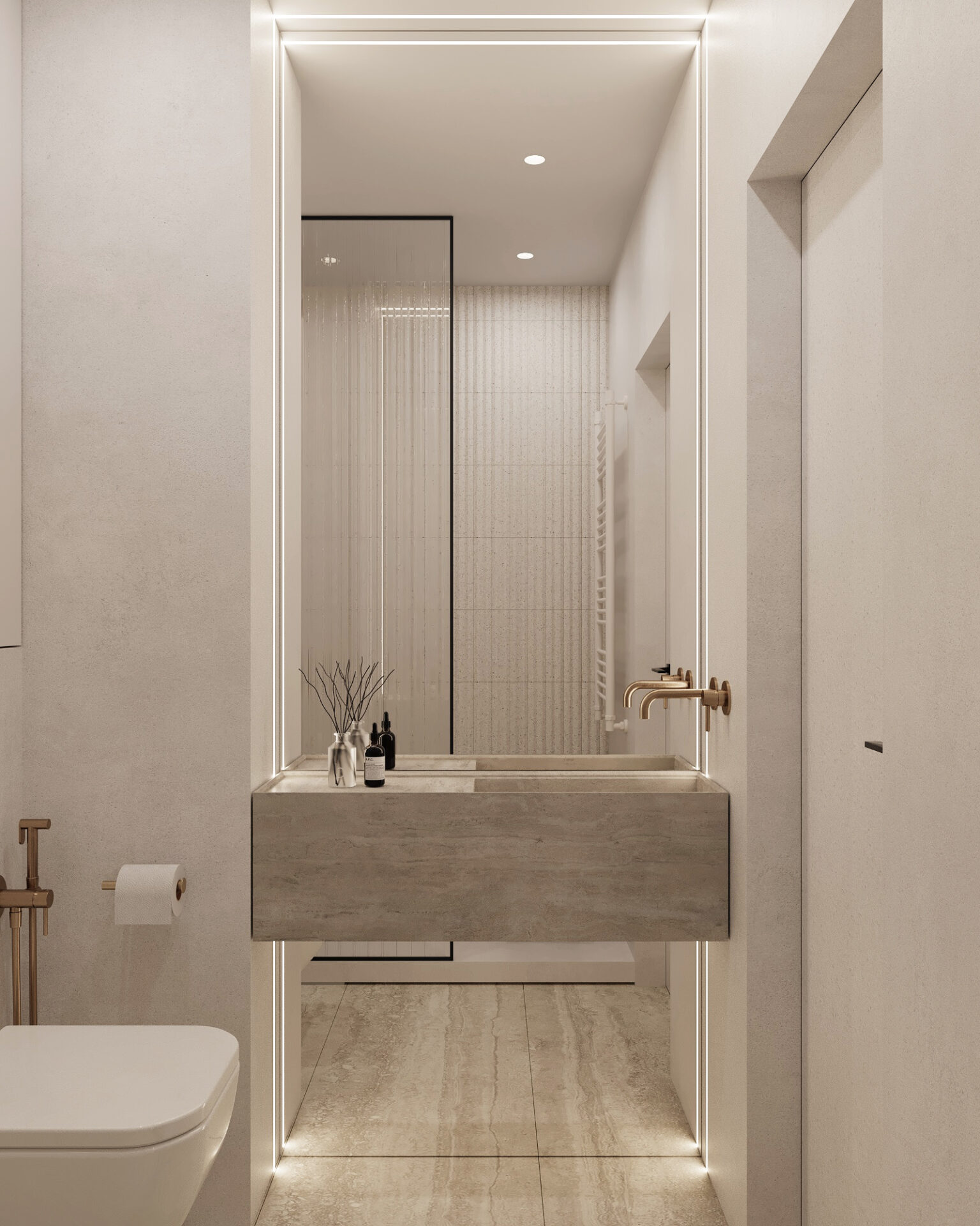 В гостевом с/у использована плитка WOW STRIPES с объемной и гладкой поверхностью. На части стен проектом предусмотрена отделка микроцементом. Акцентная зона решена монолитным объемом умывальника из керамогранита и большим зеркалом. П-образная подсветка, встроенная в потолок и стены ниши отражается в зеркале, создает интересный визуальный эффект и хороший свет, чтобы отражение в зеркале всегда радовало.