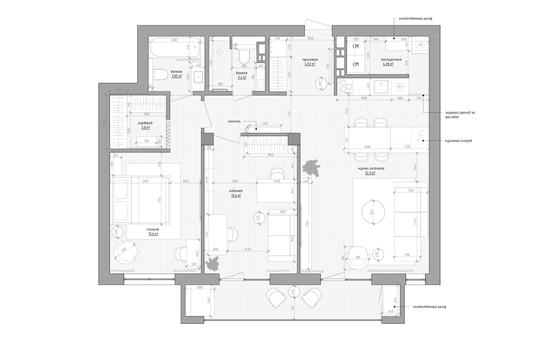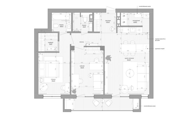 В общественной части квартиры организовано пространство кухни-гостиной и кабинета. Нашлось место для кладовой-постирочной, а в гостевом с/у- для душа.