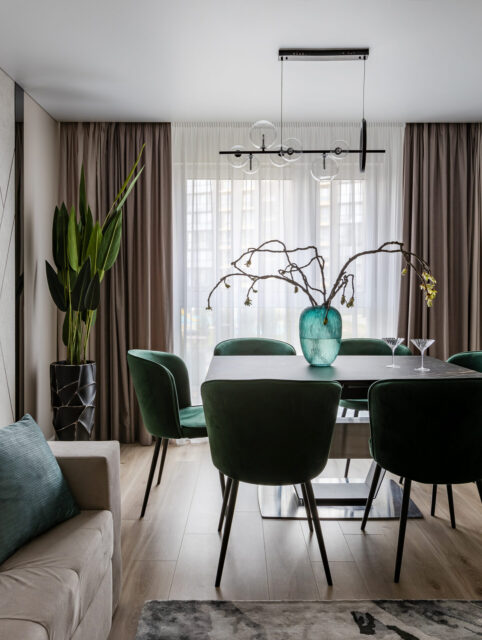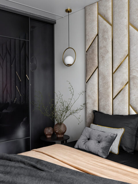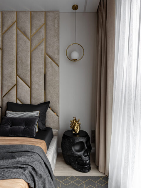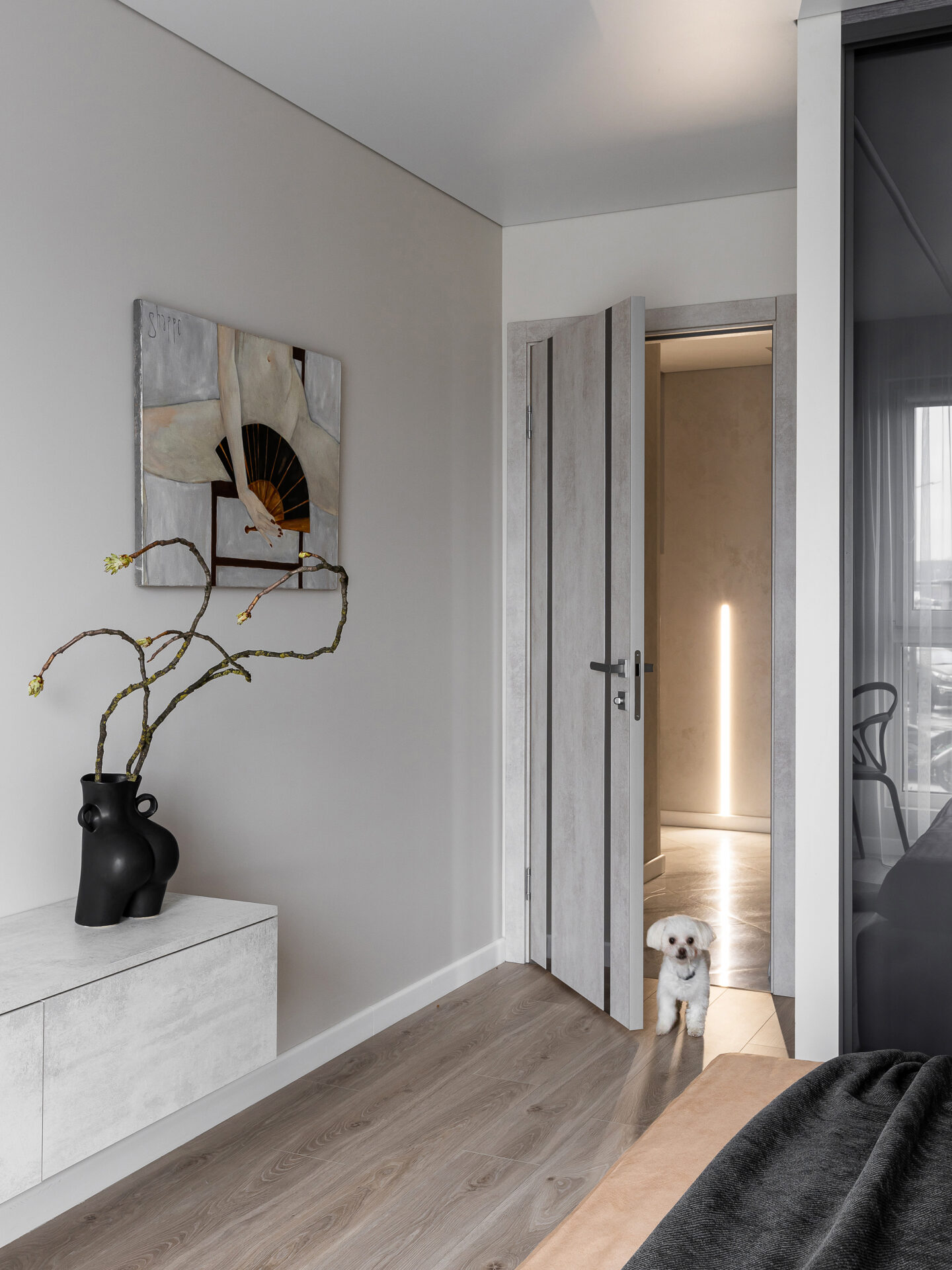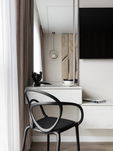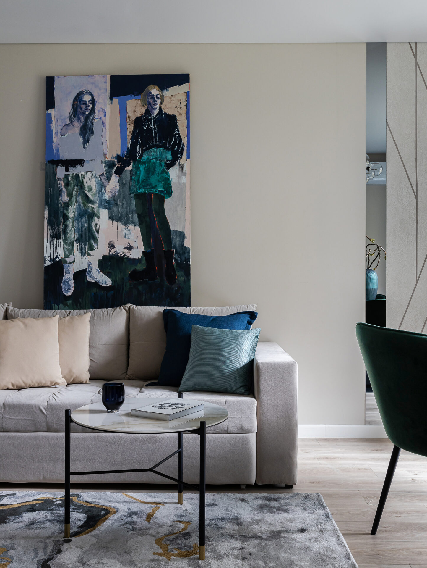 Учитывая все пожелания семьи, было создано комфортное, стильное, функциональное, светлое, наполненное воздухом пространство. В квартире достаточно много мест хранения, таких как гардеробная в спальне, большой вместительный шкаф в коридоре и детской, просторная кухня с ящиками и даже большая скрытая ниша для стиральной машины и белья в ванной комнате. Золотые элементы нашли своё место в спальне в виде светильников и геометрических линий в изголовье. Ярким акцентом выступает искусство, стулья и различные аксессуары. Детская комната получилась стильной, легко меняющейся с ростом и потребностями ребёнка.