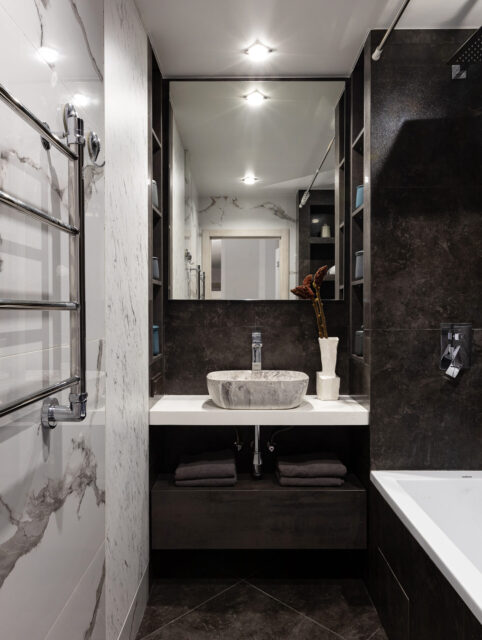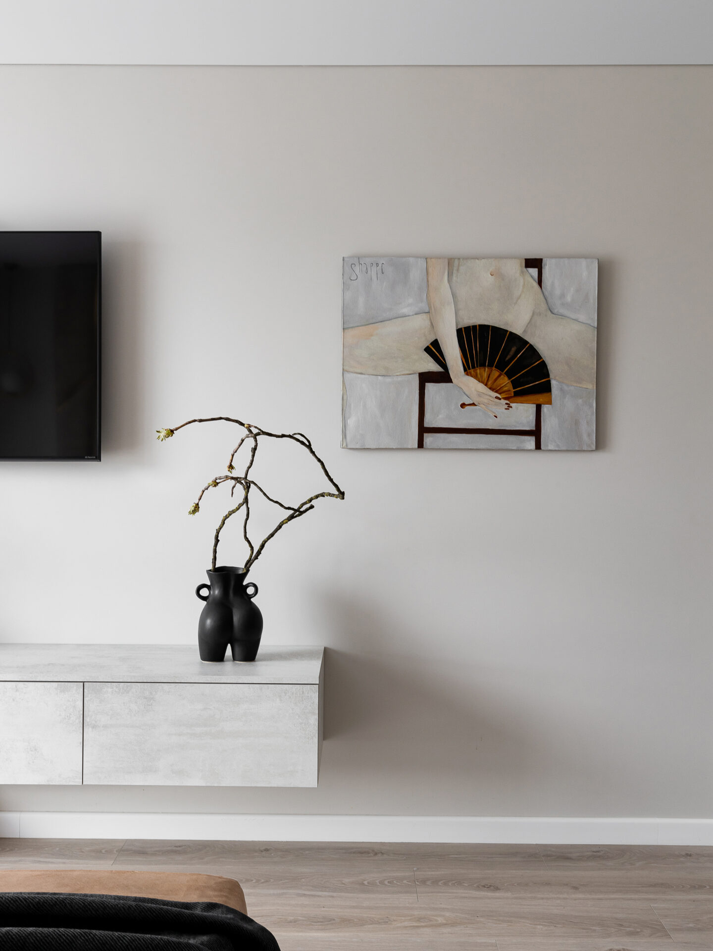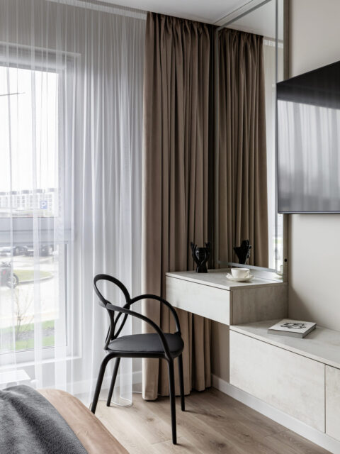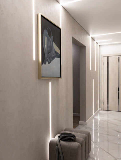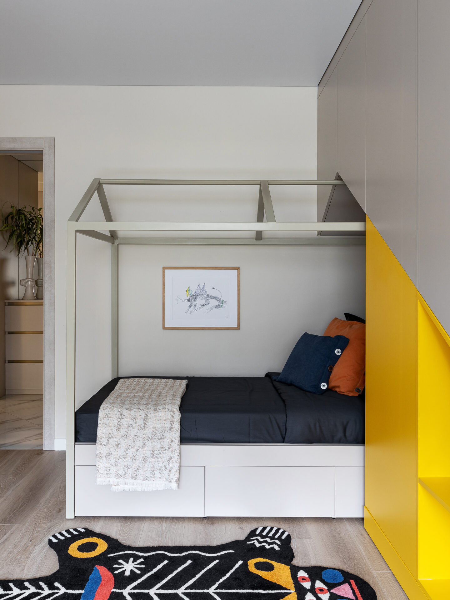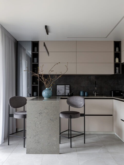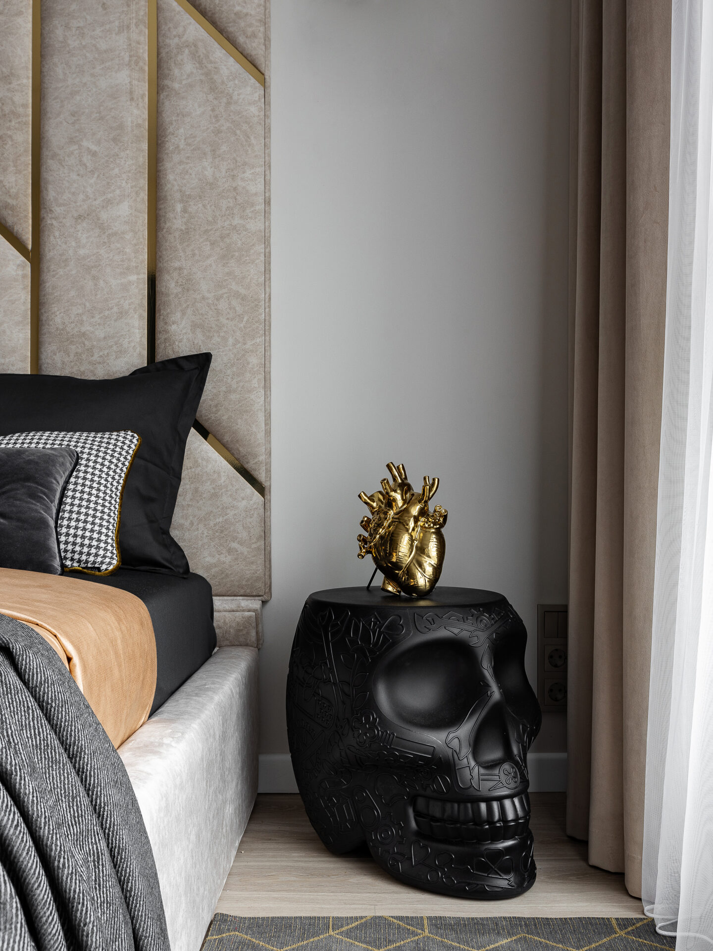 Учитывая все пожелания семьи, было создано комфортное, стильное, функциональное, светлое, наполненное воздухом пространство. В квартире достаточно много мест хранения, таких как гардеробная в спальне, большой вместительный шкаф в коридоре и детской, просторная кухня с ящиками и даже большая скрытая ниша для стиральной машины и белья в ванной комнате. Золотые элементы нашли своё место в спальне в виде светильников и геометрических линий в изголовье. Ярким акцентом выступает искусство, стулья и различные аксессуары. Детская комната получилась стильной, легко меняющейся с ростом и потребностями ребёнка.