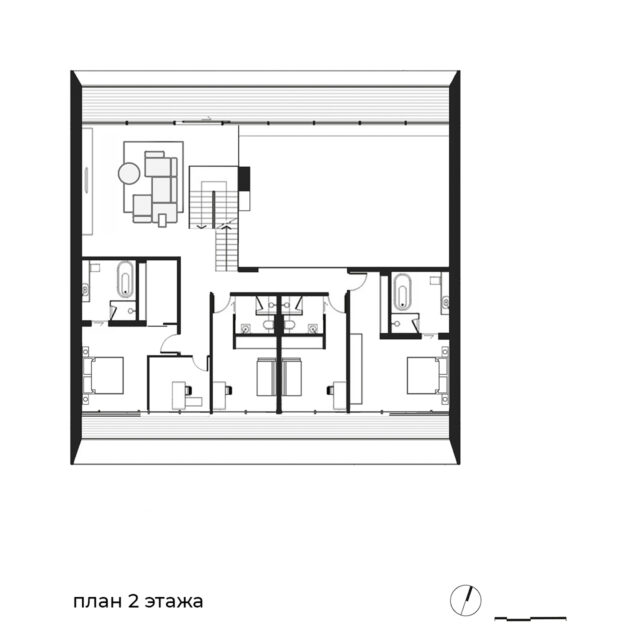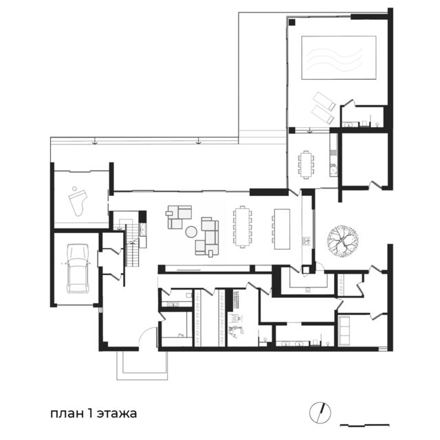 Дом имеет два этажа: первый — общий, второй — исключительно семейный. На первом уровне так же располагается спа зона с бассейном.