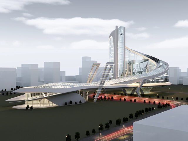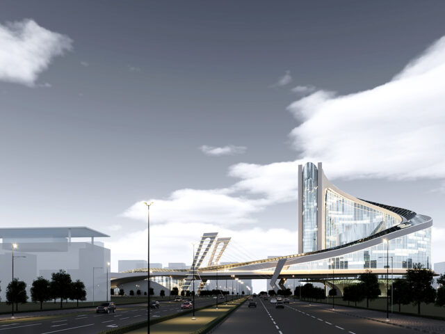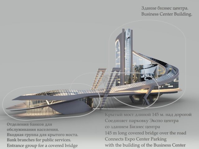2.Крытый мост с прозрачными стенами и потолком в функциональном значении соединяет большую парковку Экспо центра с Бизнес центром. В линии стыковки моста и Бизнес центра свой вход с пропускным пунктом. Сам мост длиной 145м. и шириной 18м. является зоной общего посещения и может стать новым Арбатом левого берега города Нур-Султан.