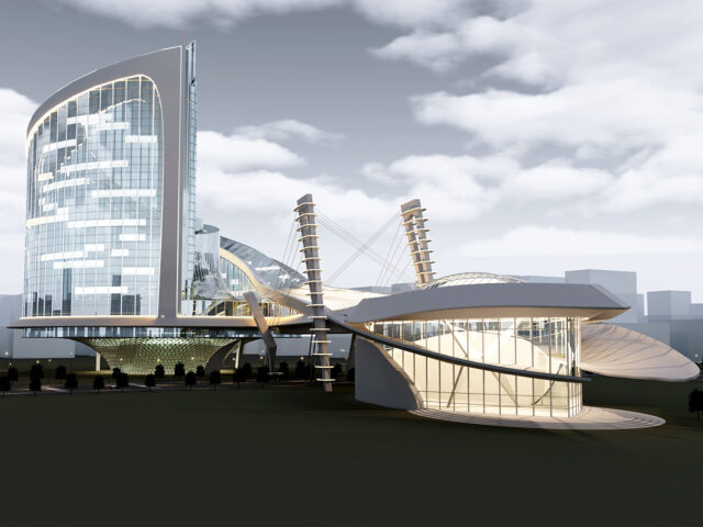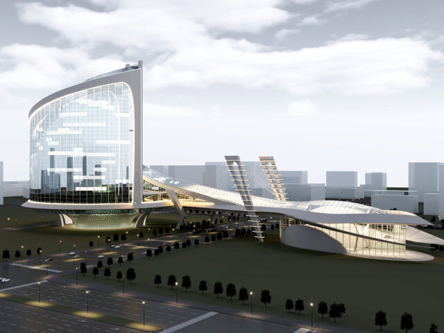 Округлая форма здания продиктована находящийся рядом архитектурой, и завершает ось комплекса Экспо центра.