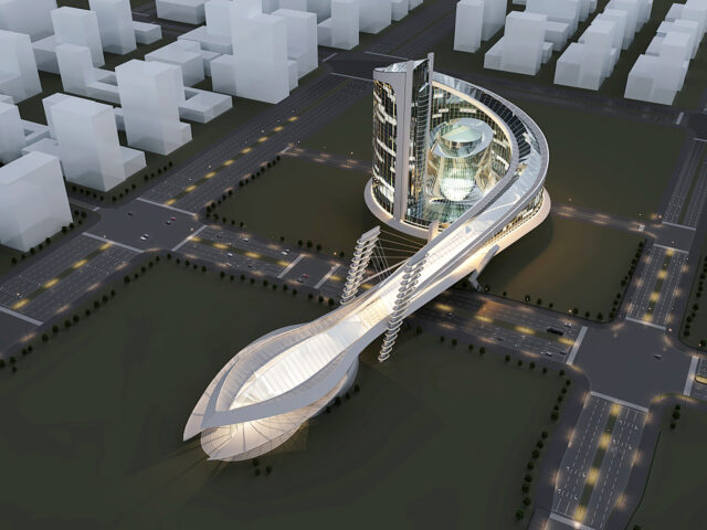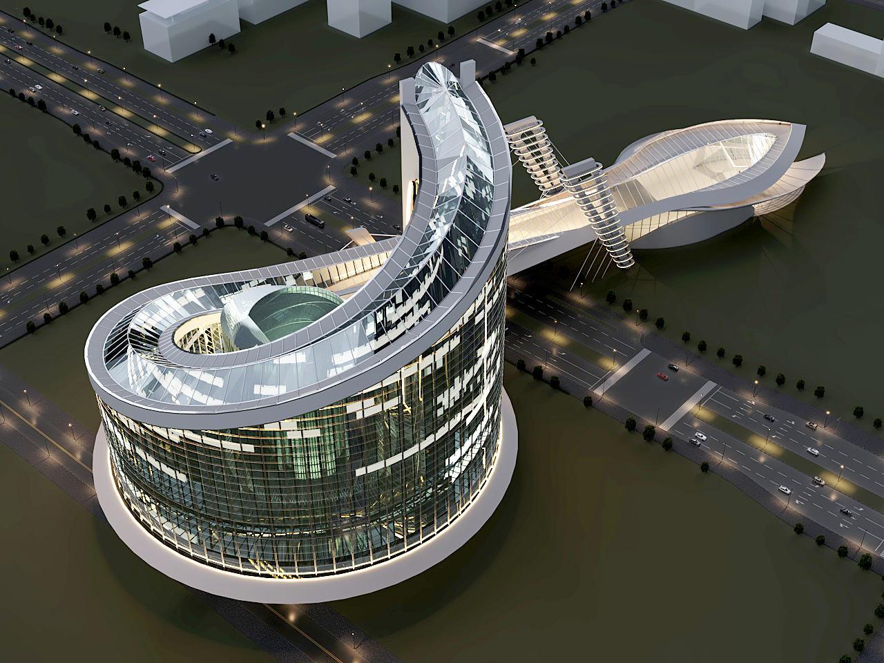 3.Здание бизнес центра является каскадным и к вершине имеет 45 этажей. У здания три основных входных группы, две в нижней части с земли со своими подъездами для авто, и одна пешеходная с моста. На первых трех этажах, до уровня моста расположены инфраструктурные помещения. Основная часть Бизнес центра закручивается по дуге, в ней расположены офисы. В центральной (отдельной) части здания располагается помещения для конференций.