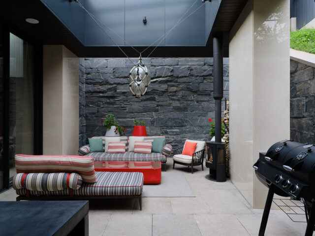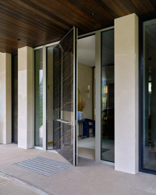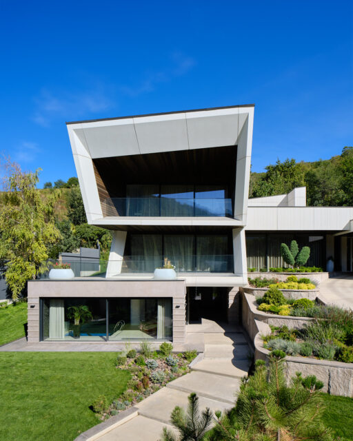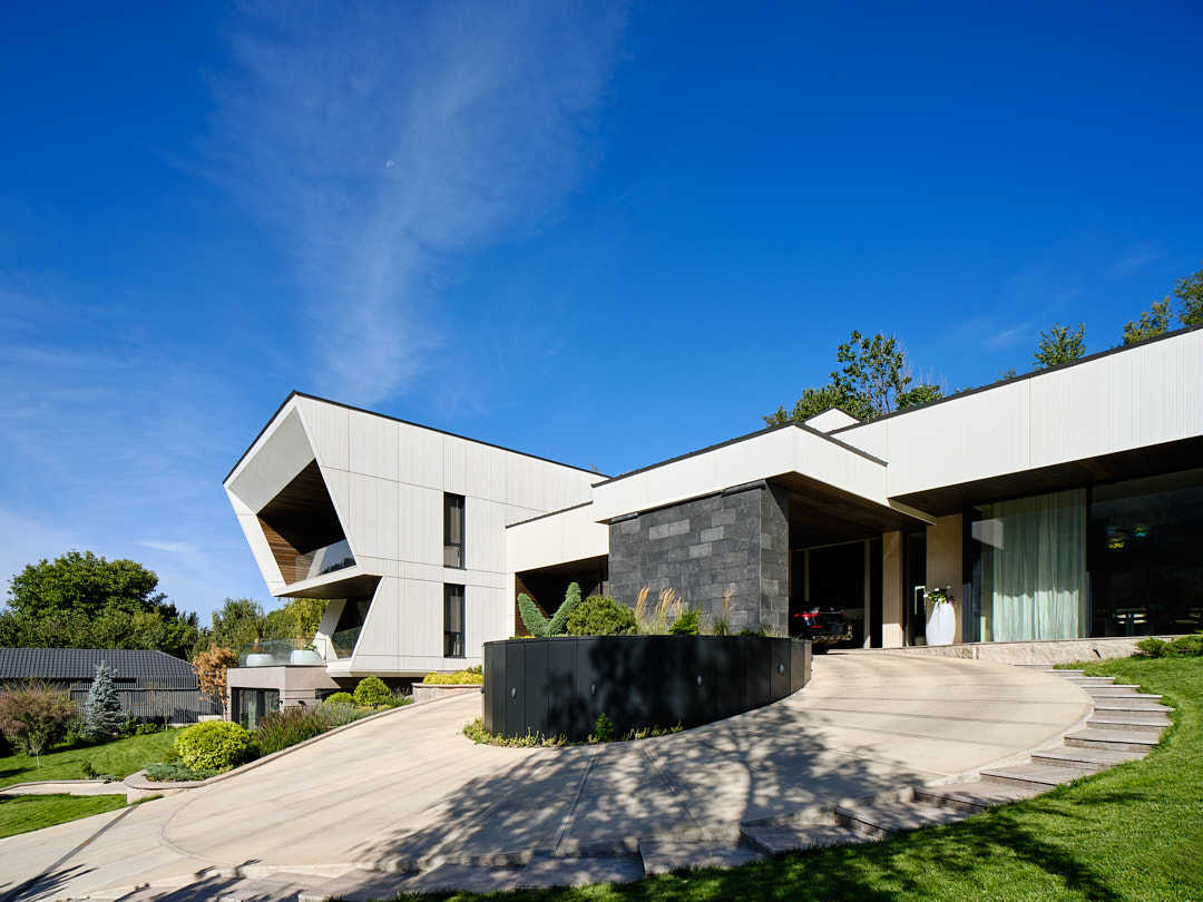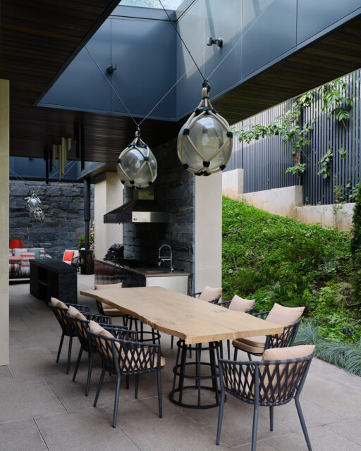 Для получения инсоляции на втором уровне было спроектировано патио, через которое свет наполняет кабинет, столовую и холл. Также патио служит для выхода из помещения непосредственно на участок за домом и уютной приватной зоной, закрытой от внешнего мира. Также были применены зенитные окна, которые наполняют солнечным светом большие помещения гостиной и столовой. Самое сложное и эффектное это планировочное решение и общая архитектура объемов как фасадов, так и интерьера. Даже на этапе бетонного монолита дом уже впечатлял пропорциями и объёмами пространств, и была задача не перегрузить его дизайнерскими решениями.