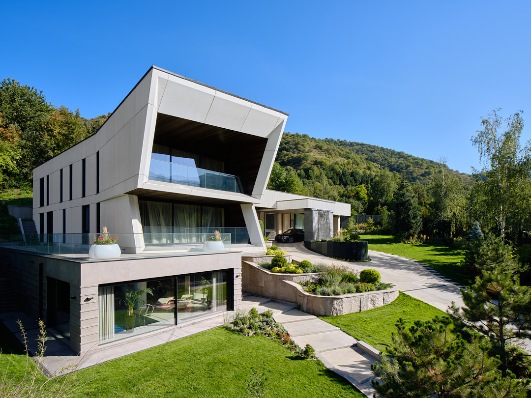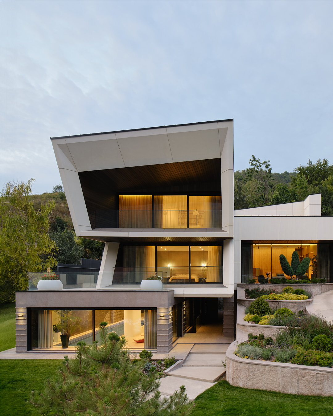 Отправной точкой было желание заказчицы и анализ участка, участок с перепадом высот в 16м. Поэтому было найдено решение заглубить дом в тело склона, что обусловлено необходимостью создать подпорную стенку для предотвращения сползания грунта, в роли подпорной стенки является конструкция дома, который двумя этажами частично заглублен в склон. Это лишило нас возможности выполнить окна со стороны склона и повлияло на планировочные решения.