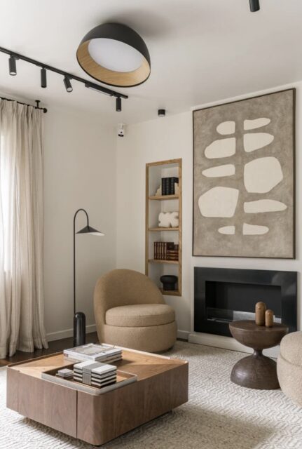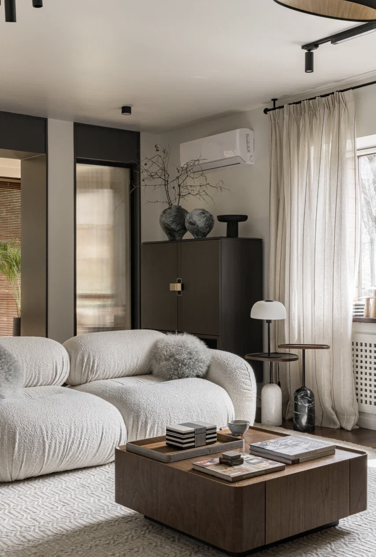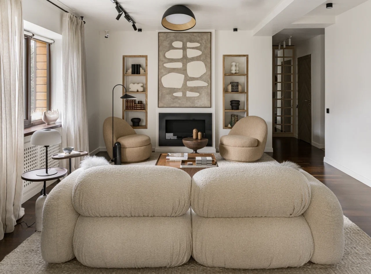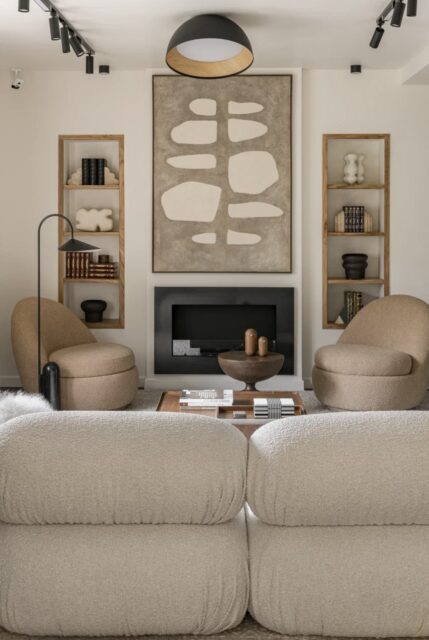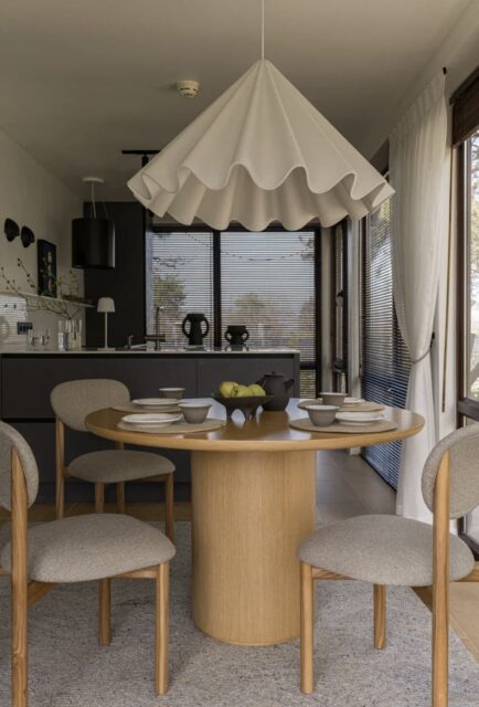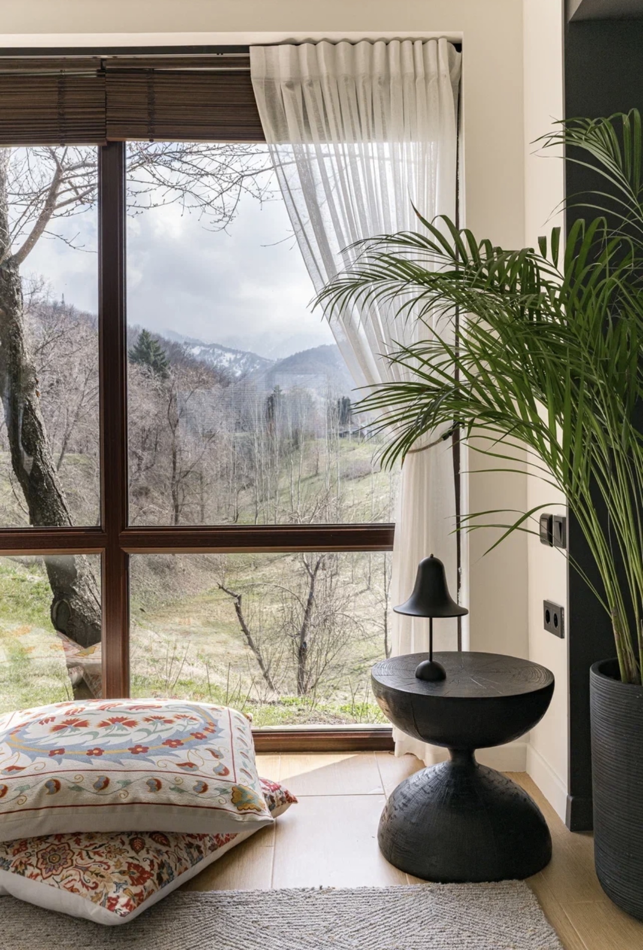 В интерьере использованы натуральные цвета, приятные на ощупь фактуры и материалы. Особенность дома — низкие потолки. Поэтому стены и потолок выкрашены в один тон, сделаны дополнительно акцентные вертикальные линии в проеме, использована нарочито большая картина в гостиной и потолочный светильник . В гостиной были внедрены камин и встроенные стеллажи. В доме расположили много дополнительного света — торшер, настольные лампы, ночники — что придает особую ауру и уют вечером. Дабы увеличить пространство в углу разместили зеркало в пол. На кухне был заказан очень функциональный и стильный гарнитур со всем необходимым. Акцентным элементом кухни является круглый стол и войлочная люстра над ним. А изюминкой столовой зоны считаю релакс-зону у окна с напольными подушками с этно мотивами и столиком из дерева суар. Также, была выделена зона под небольшой функциональный гардероб.