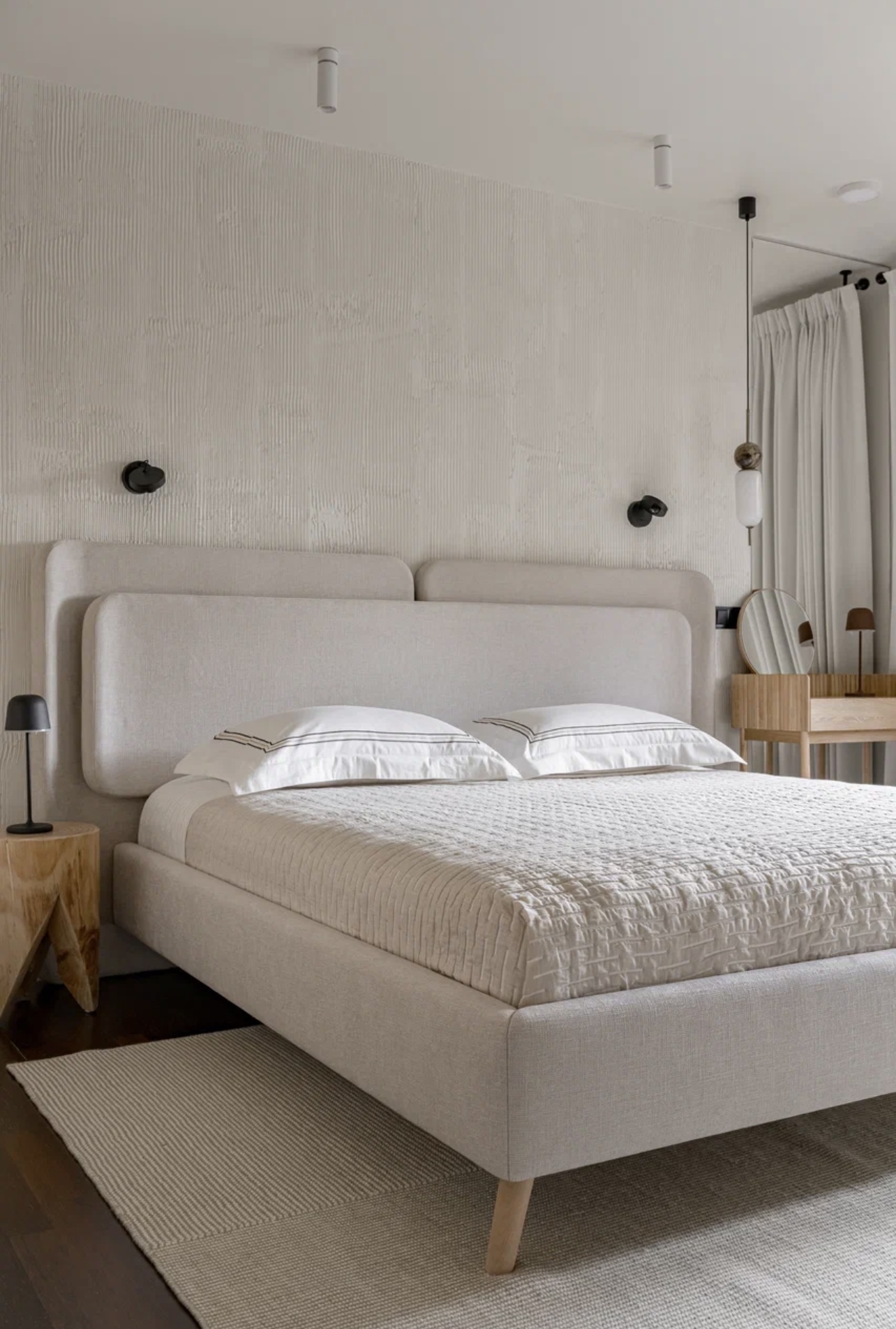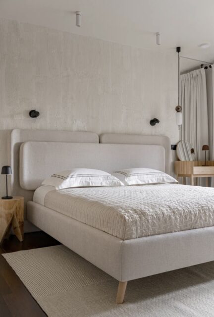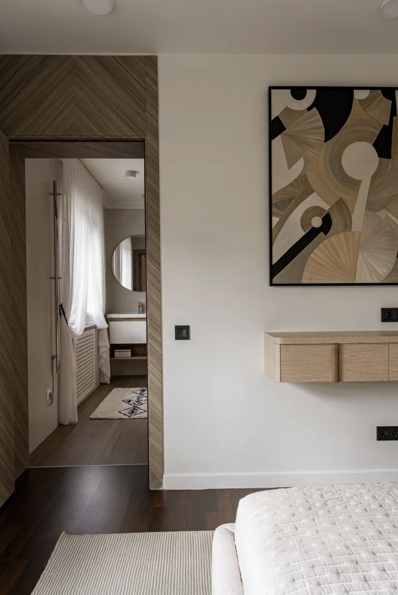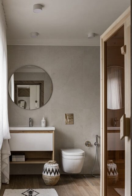Спальня выполнена в спокойных пастельных тонах, располагающих к отдыху и умиротворению. Фишкой хозяйского санузла является маленькая сауна. Весь декор был подобран с учетом общей стилистики проекта, его габаритов и вкусовых пристрастий владельцев помещения. Получилось очень уютно и стильно — владельцы обожают свой дом и не хотят покидать его.