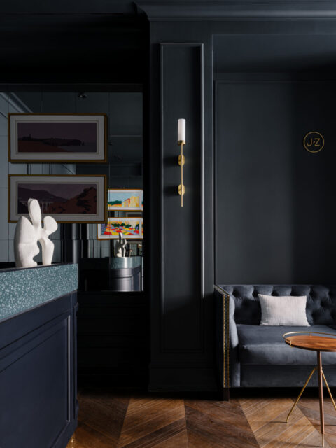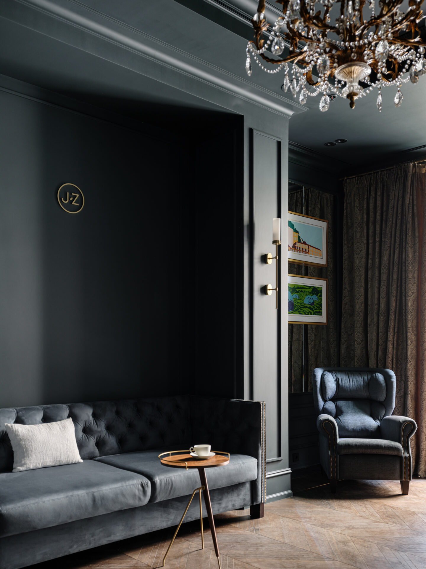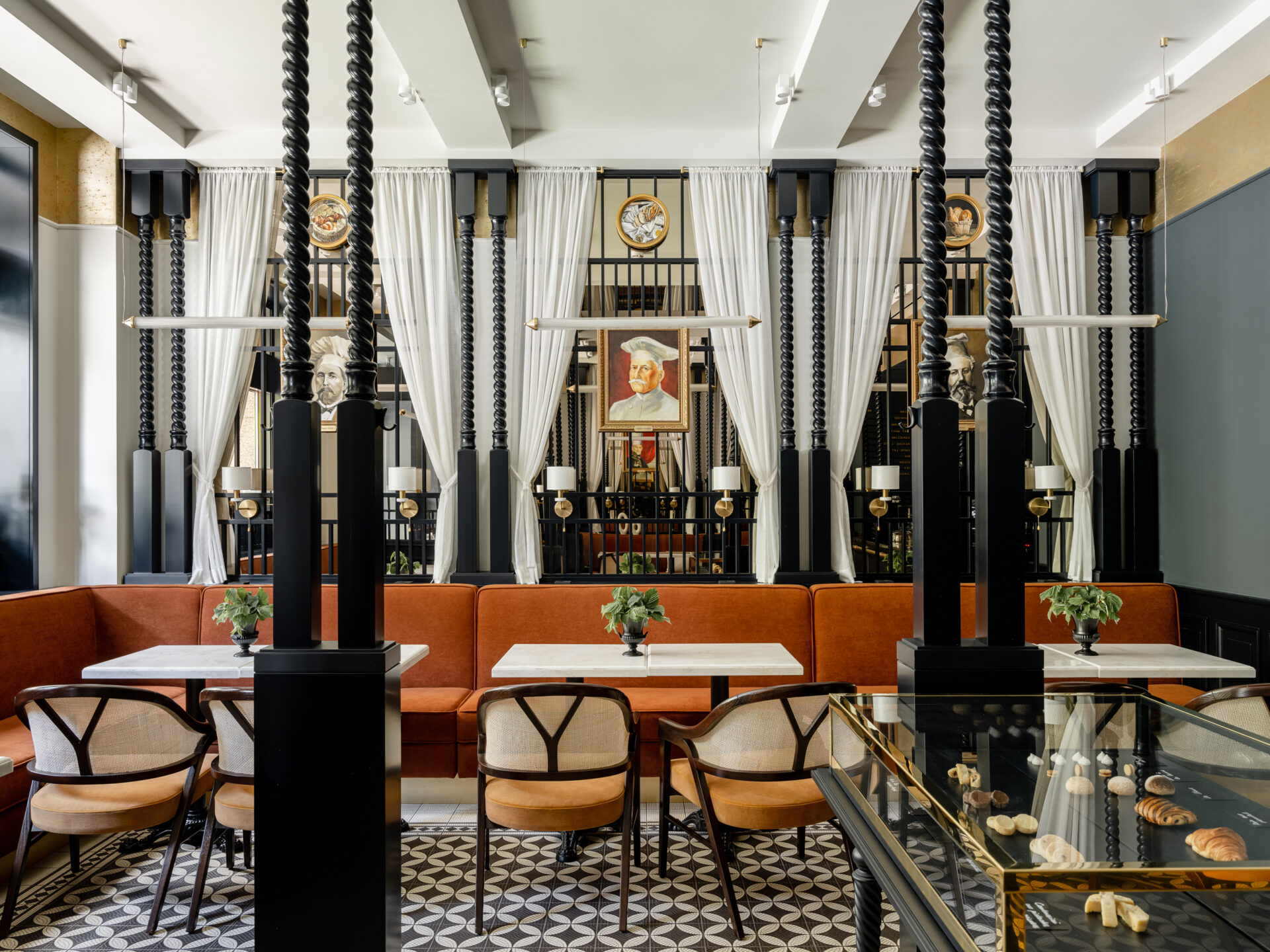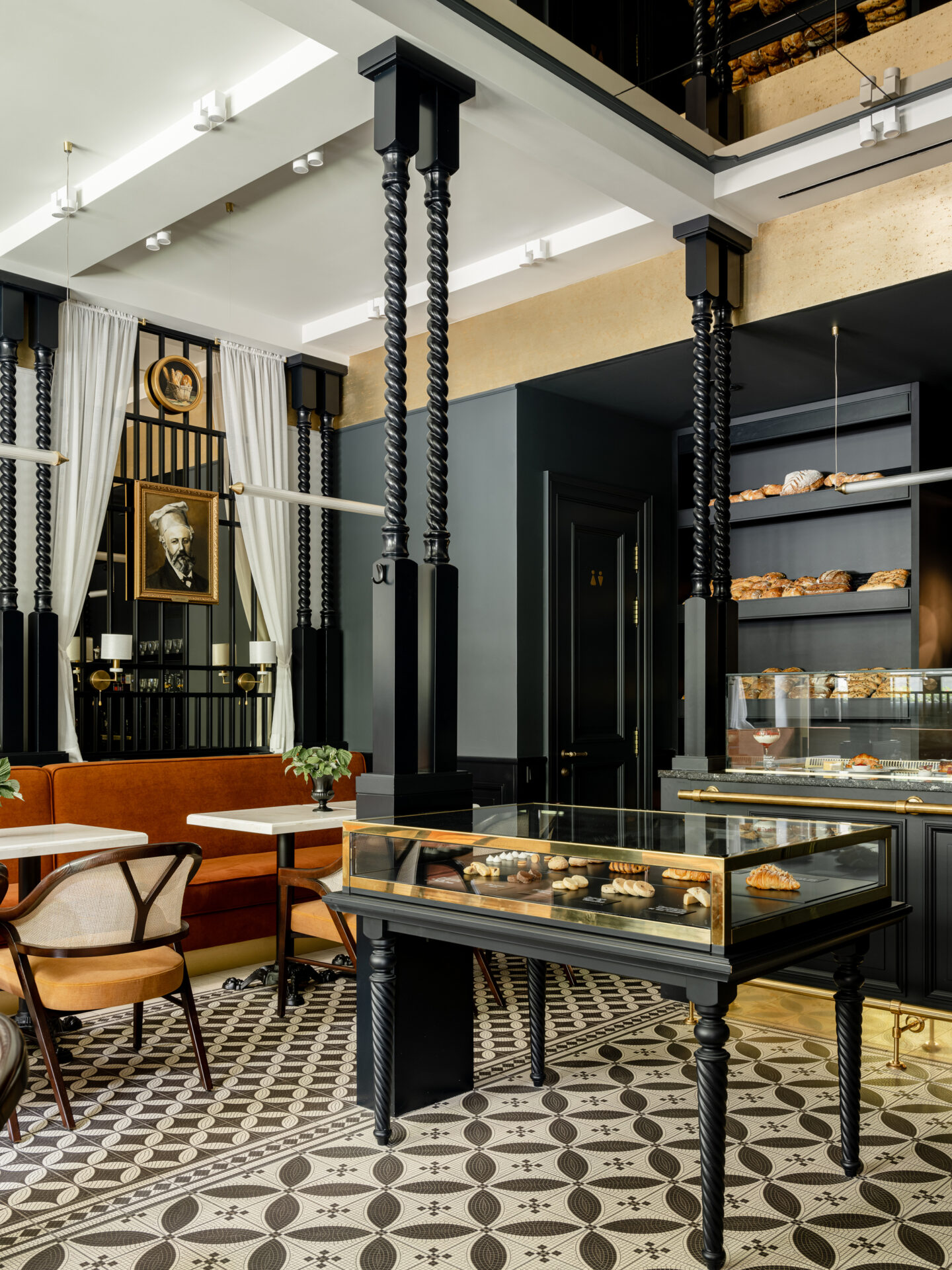 Сердце заведения — это уникальная Лаборатория с французским оборудованием для выпекания хлеба, которое существует в России в единственном экземпляре. Есть у буланжерии и тайная комната — это приватное клубное пространство для жильцов дома и их особых гостей. Туда можно попасть только по специальной договоренности через отдельных вход. Деловые встречи, семейные праздники, частные мастер-классы, все это с легкостью можно организовать в этой гостиной. Интерьер тут более камерный, здесь, помимо зеркал, мы использовали ещё и тёмный насыщенный цвет, единый для потолка и стен. Это помогло придать целостность пространству, одновременно увеличив объем за счет размытия границ.