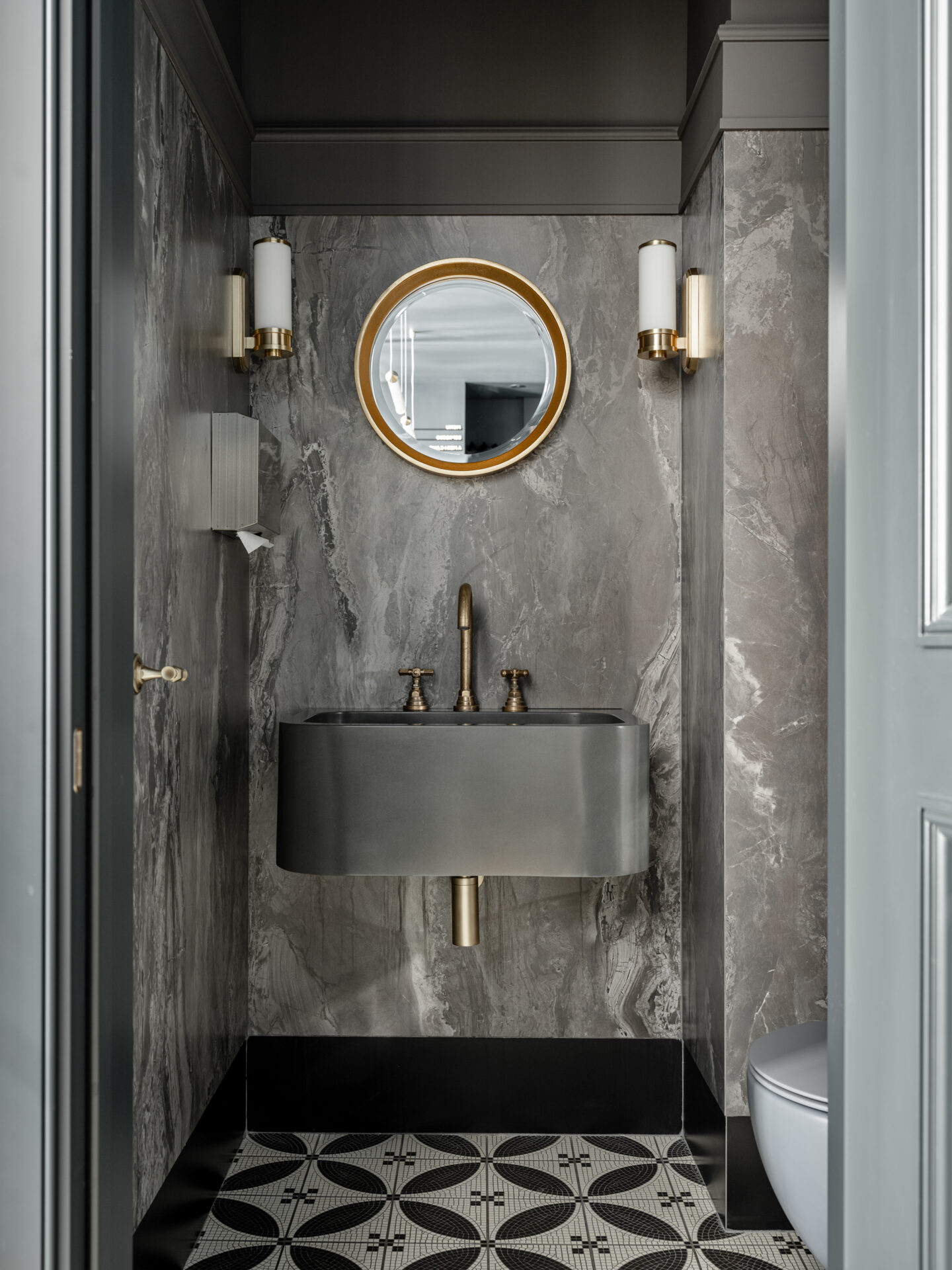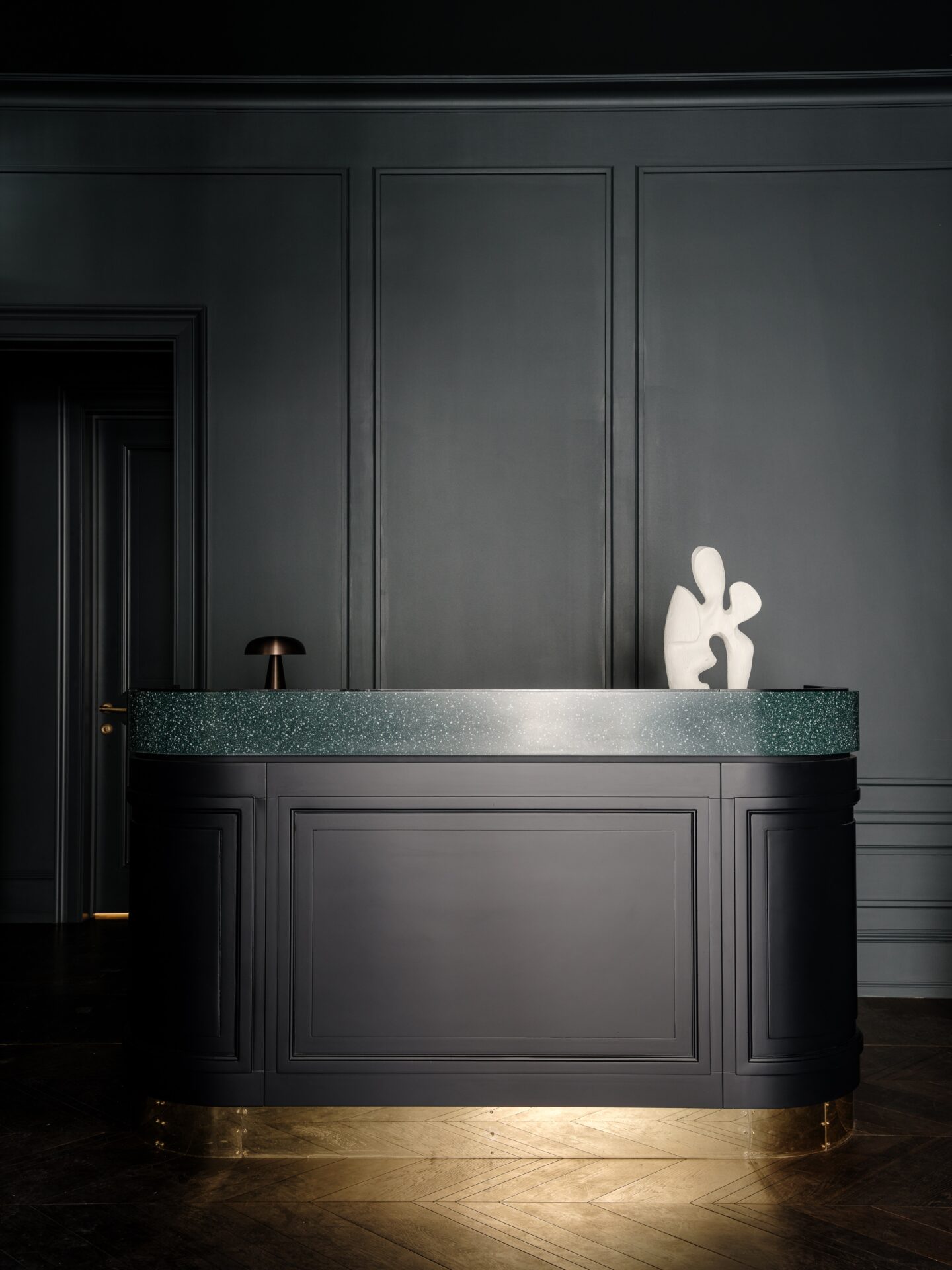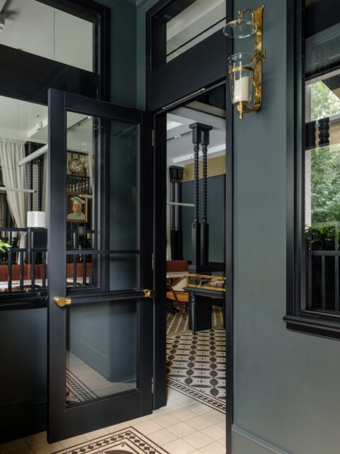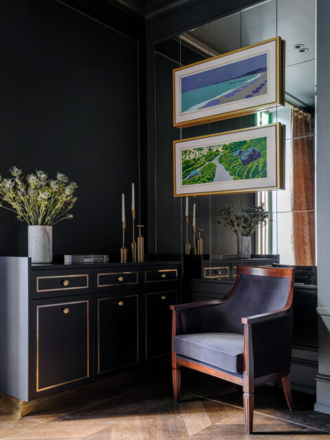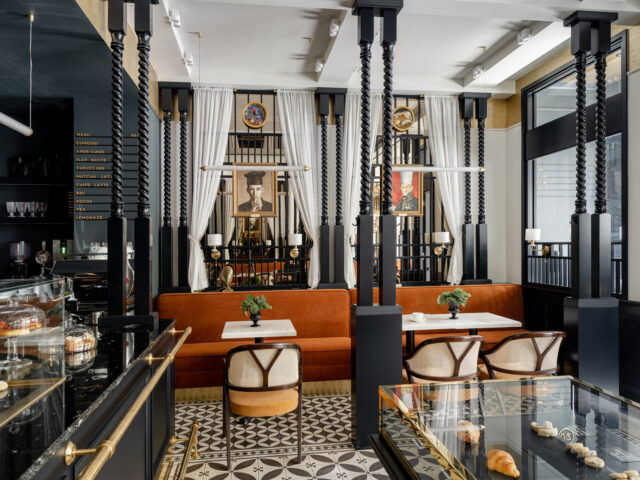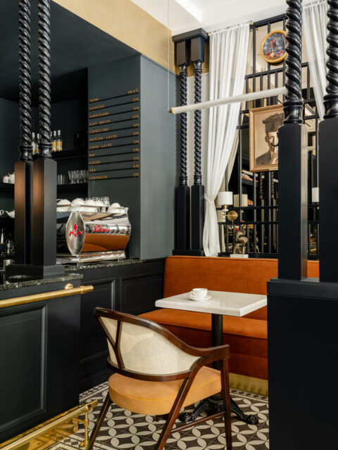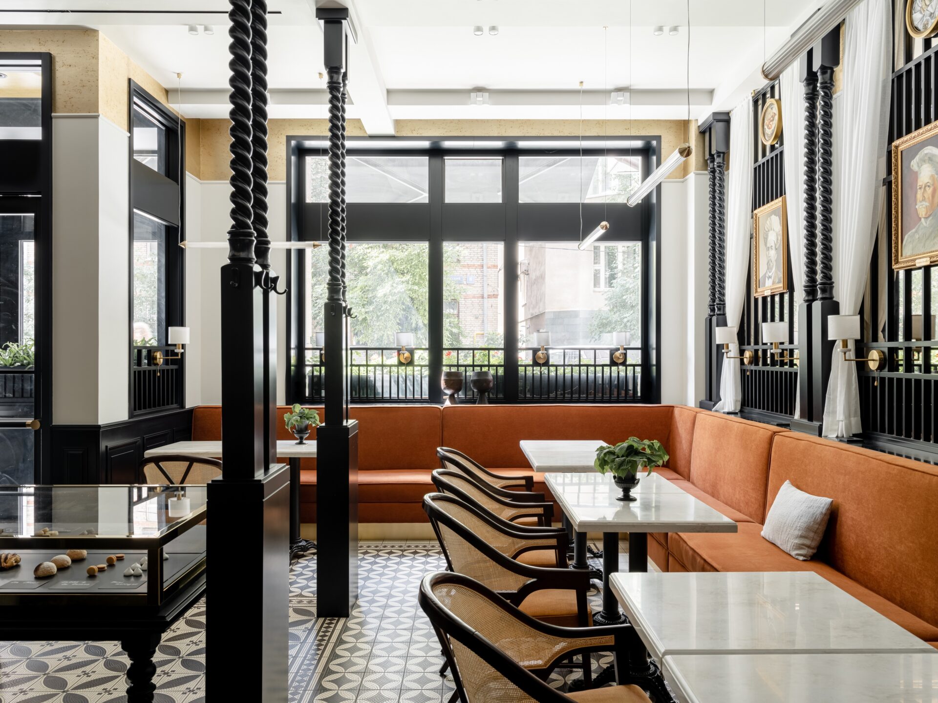 Сердце заведения — это уникальная Лаборатория с французским оборудованием для выпекания хлеба, которое существует в России в единственном экземпляре. Есть у буланжерии и тайная комната — это приватное клубное пространство для жильцов дома и их особых гостей. Туда можно попасть только по специальной договоренности через отдельных вход. Деловые встречи, семейные праздники, частные мастер-классы, все это с легкостью можно организовать в этой гостиной. Интерьер тут более камерный, здесь, помимо зеркал, мы использовали ещё и тёмный насыщенный цвет, единый для потолка и стен. Это помогло придать целостность пространству, одновременно увеличив объем за счет размытия границ.