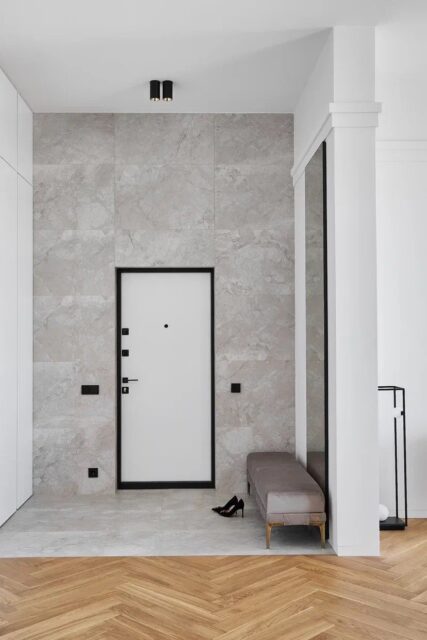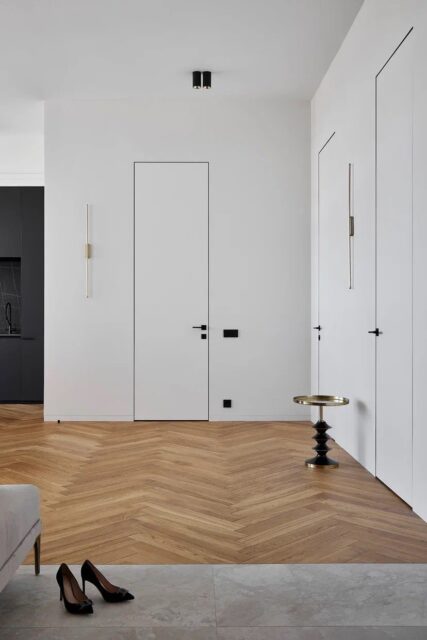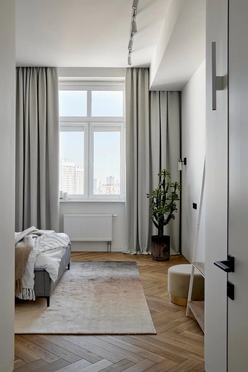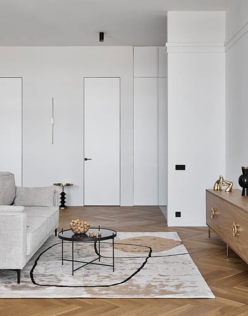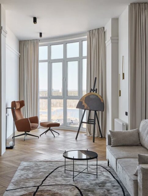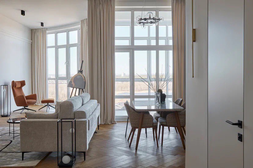 Это пространство проектировалось для взрослой семейной пары. Хозяйка творческая личность, для которой важно было оставить квартиру просторной и светлой. Высокие потолки и панорамные окна не ограничивают полёт творческой мысли. Роскошные виды на воду, на плавающих лебедей и летающих чаек вдохновляют хозяйку на создание предметов искусства.