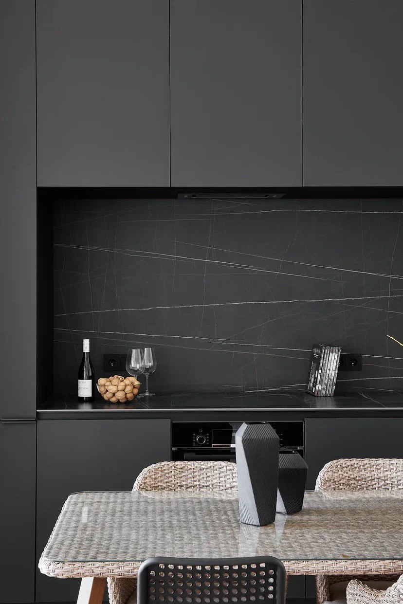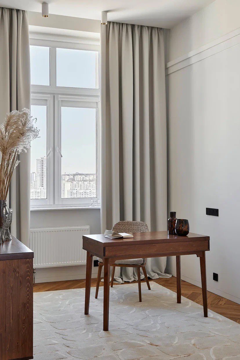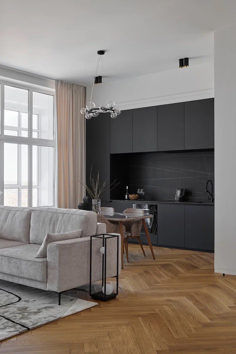 В интерьере использовались натуральные материалы и нейтральные цвета. Не стандартное сочетание чёрной современной кухни и столовой мебели из ротанга добавляет эксклюзивности в интерьер. Планировка квартиры была спроектирована с учётом всех пожеланий заказчиков, у нас помимо основной гостиной зоны с кухней, появилась спальня и рабочий кабинет. В квартире также есть удобный санузел и вместительная гардеробная комната.