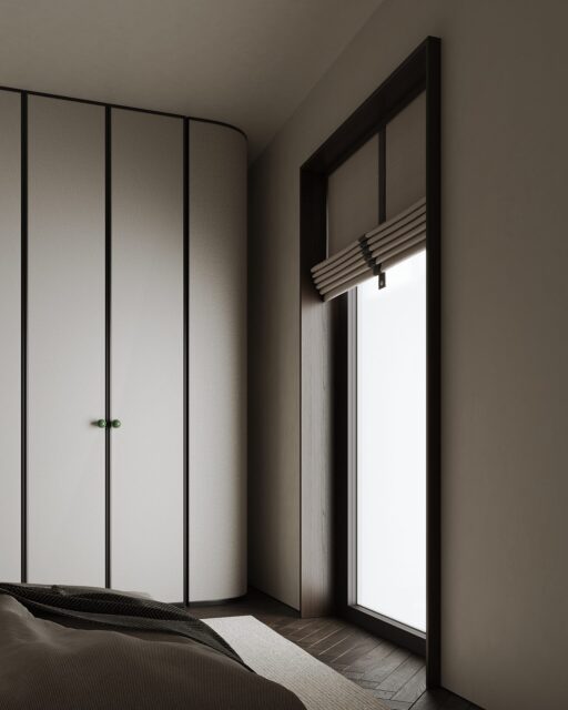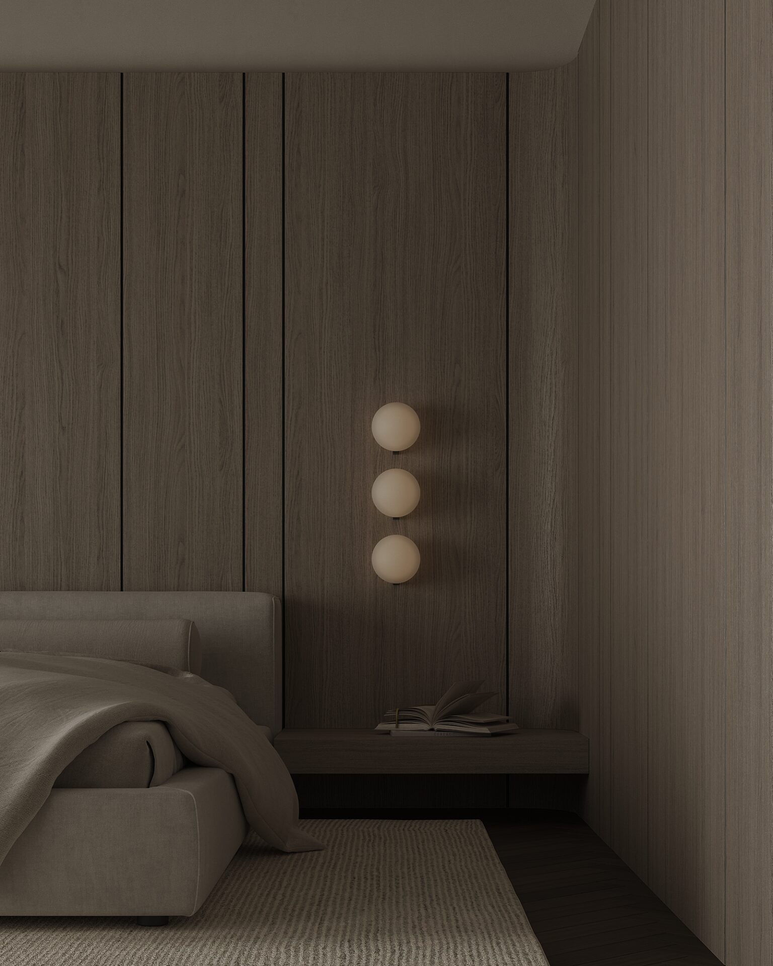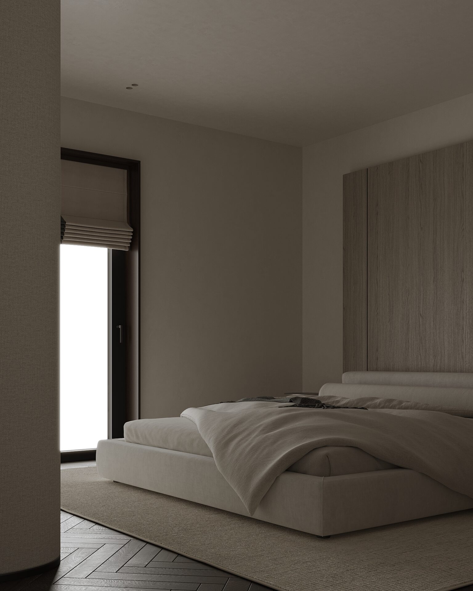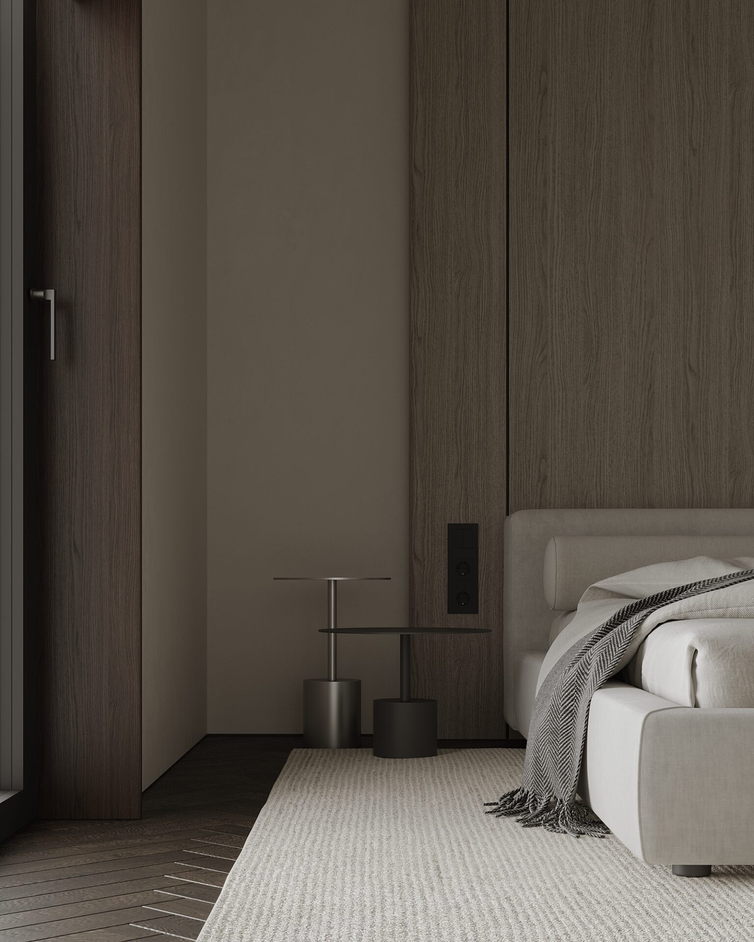 Теплая мастер-спальня выступает центром Нирваны этого дома. Закругленная шпонированная ширма и шкаф с текстильными фасадами смягчают ощущение пребывания. Тактичным игривым фактором выступают разные прикроватные тумбы и лаконичные ручки шкафа из зеленого мрамора.