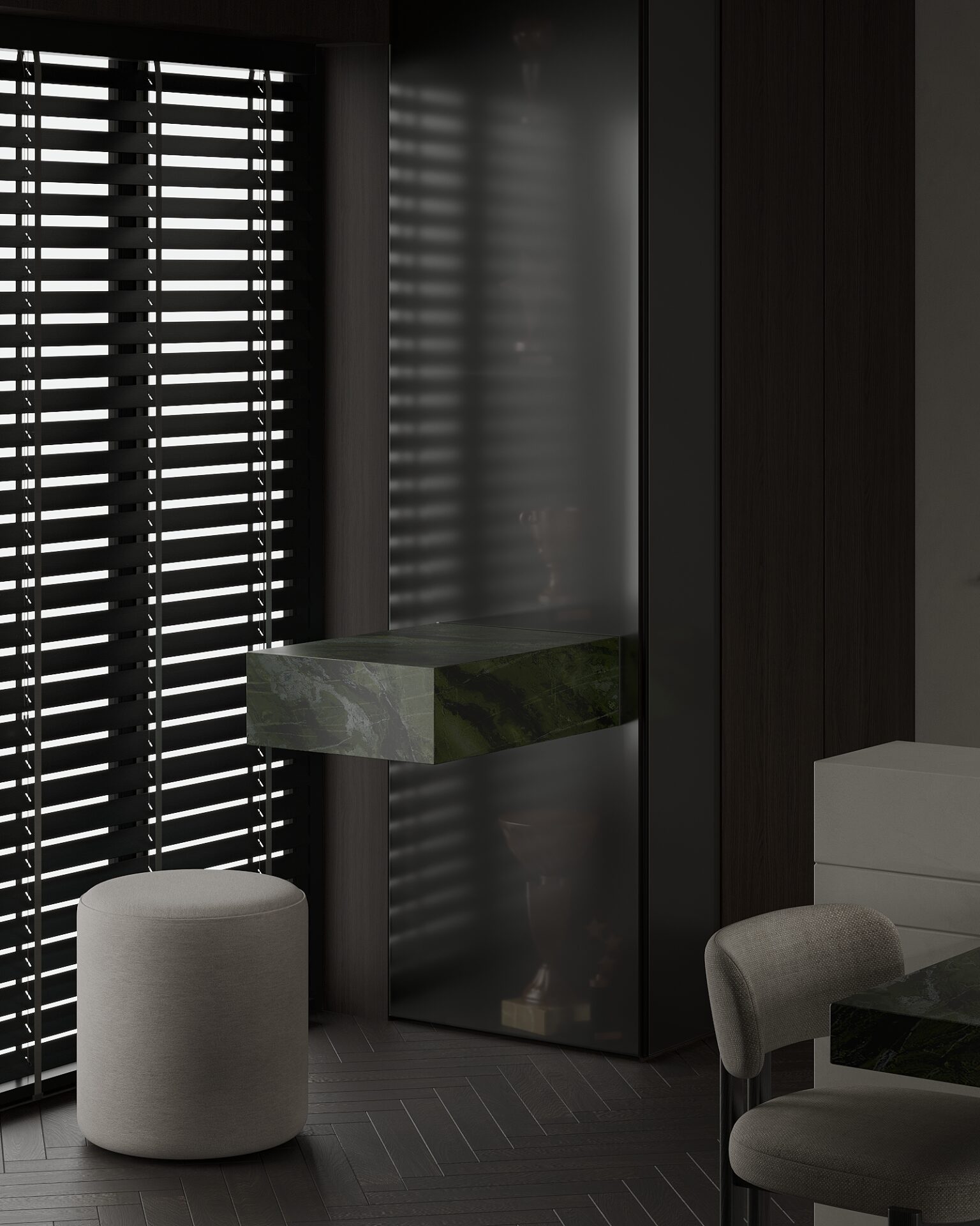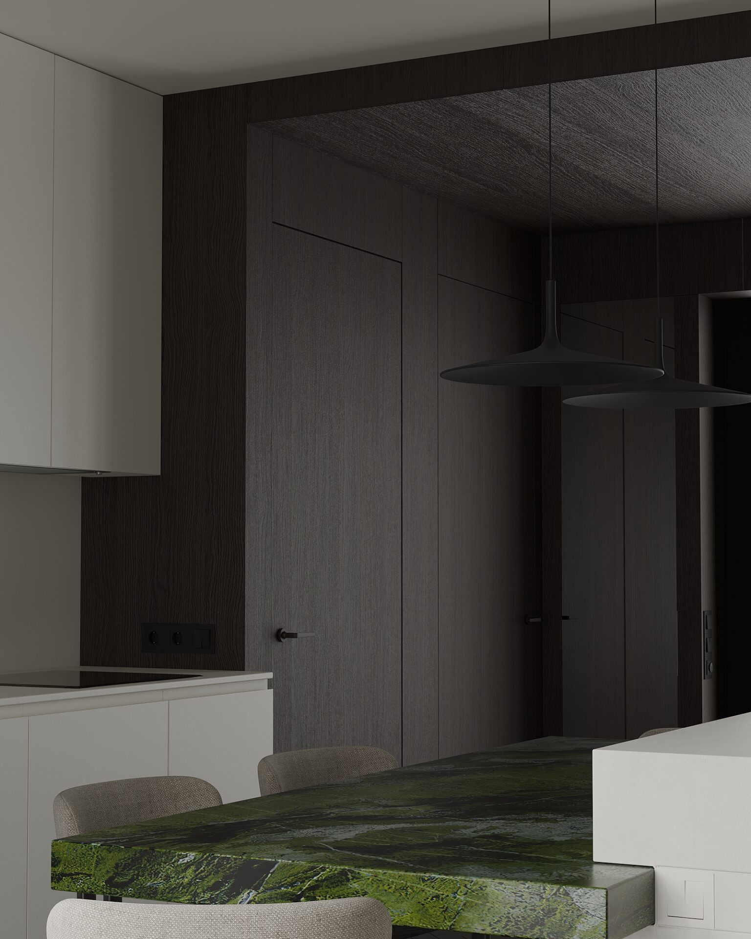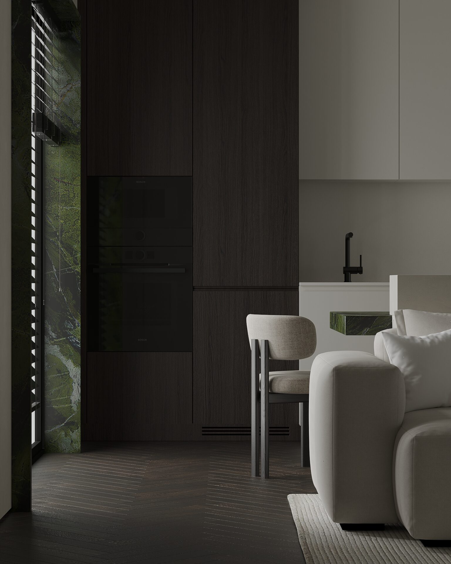 В первом и главном помещении необходимо было объединить сразу три зоны: прихожая, кухня, гостиная. Зона прихожей выделена темным шпоном, что позволят визуально отделить ее от общего пространства, а также спрятать лишний шум от соседства двух дверей. Шкаф, выполненный в том же шпоне, частично выступает акцентом за счет тонированного стеклом «аквариума» с подвесной консолью из зеленого мрамора. Тот же зеленый мрамор повторяется в столешнице обеденного стола, который является частью стойки, которая отделяет зону кухни от зоны отдыха с диваном, и портале вокруг панорамного окна, который ведет к прямому выходу к морю.