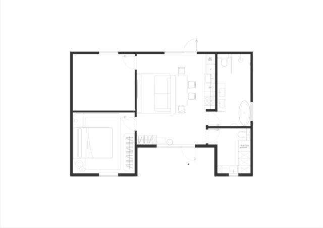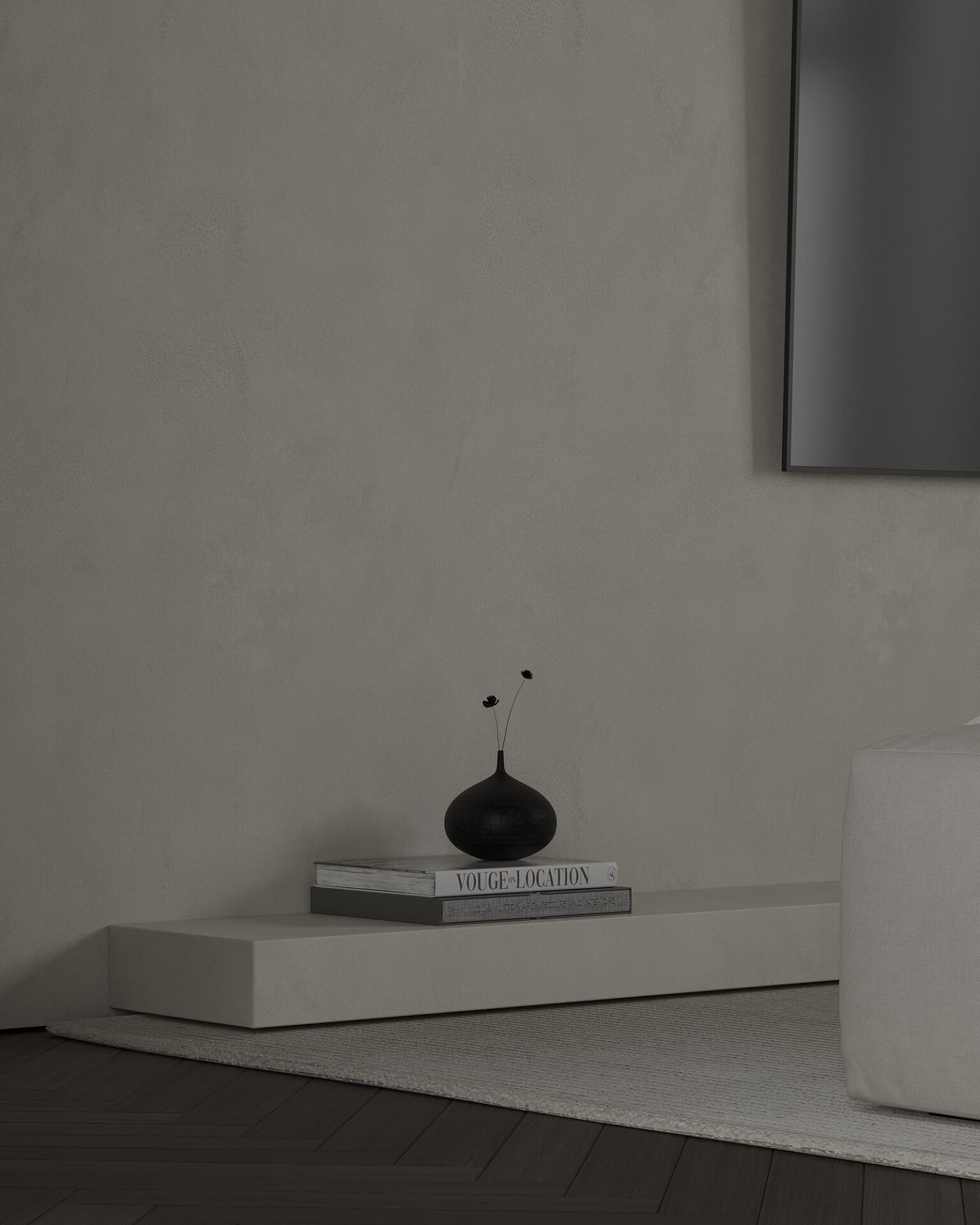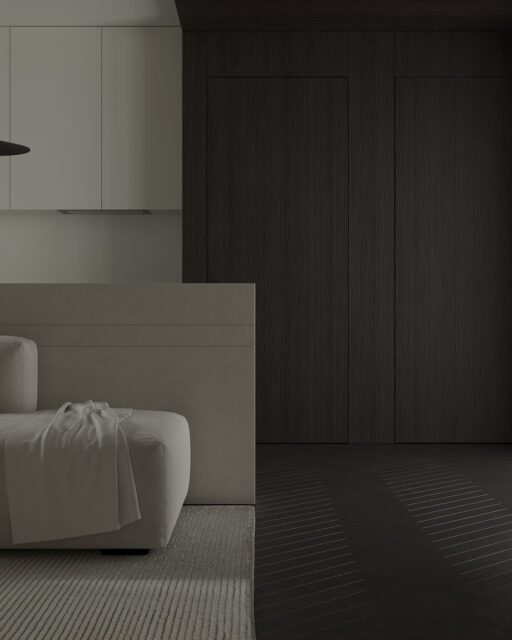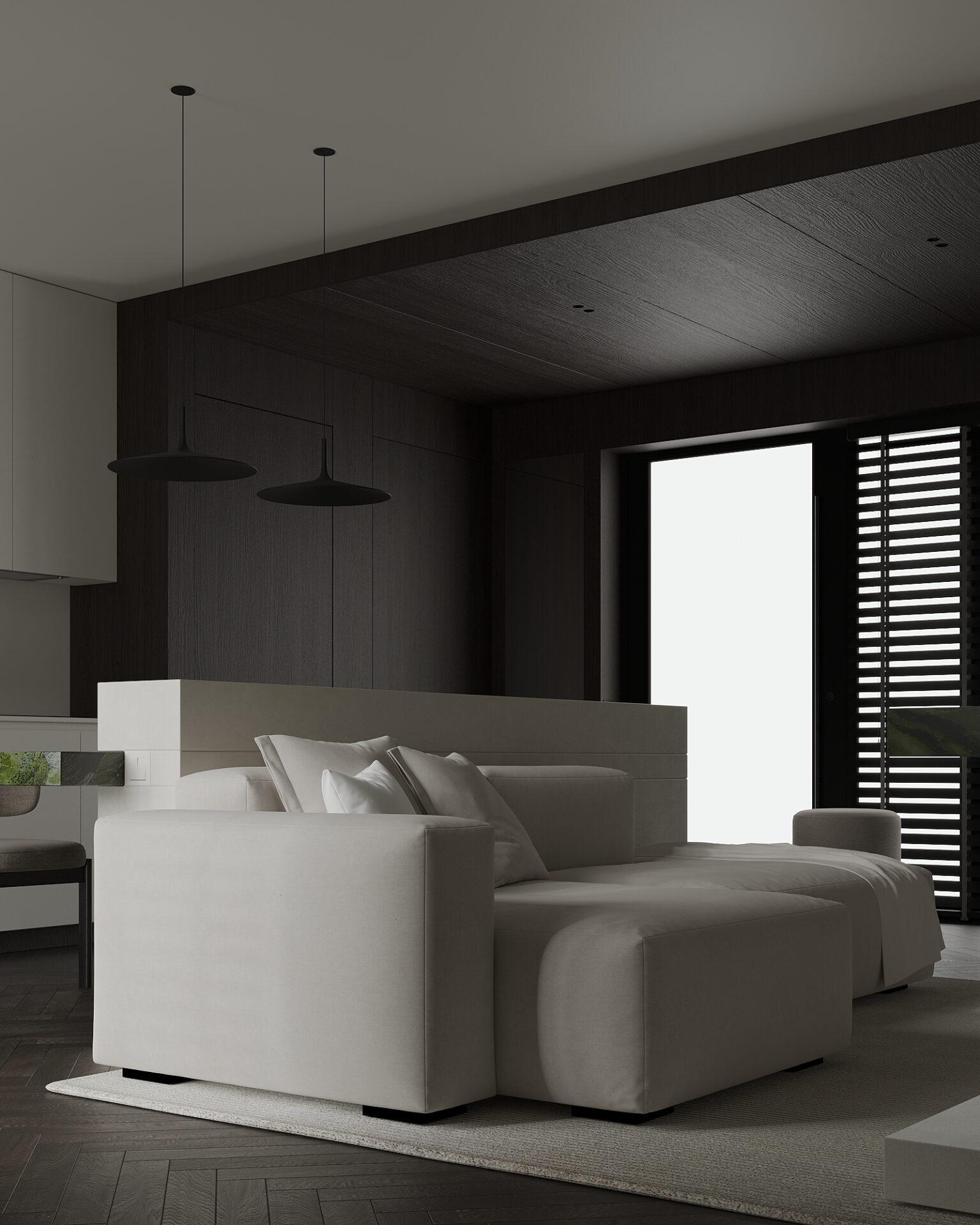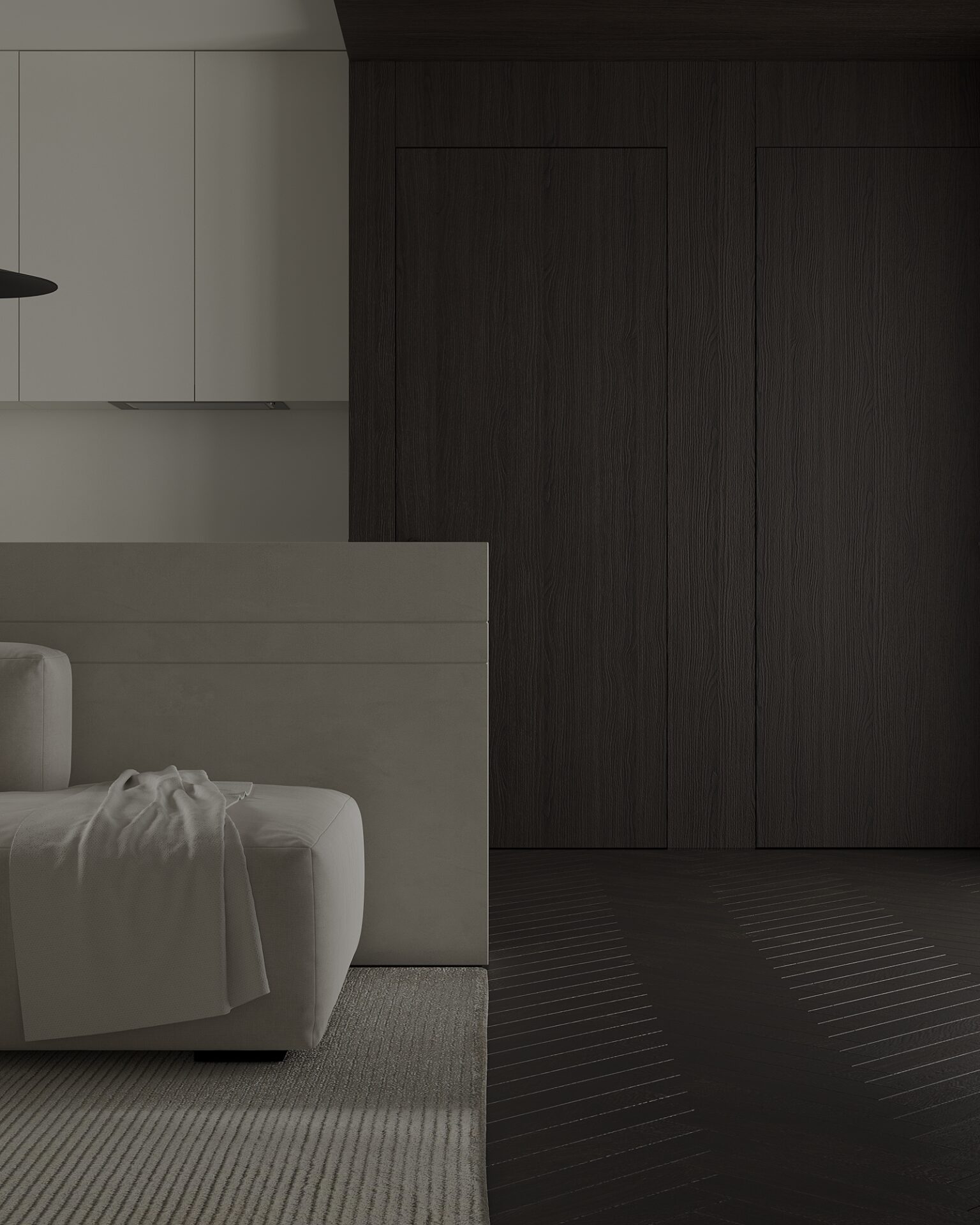 В первом и главном помещении необходимо было объединить сразу три зоны: прихожая, кухня, гостиная. Зона прихожей выделена темным шпоном, что позволят визуально отделить ее от общего пространства, а также спрятать лишний шум от соседства двух дверей. Шкаф, выполненный в том же шпоне, частично выступает акцентом за счет тонированного стеклом «аквариума» с подвесной консолью из зеленого мрамора. Тот же зеленый мрамор повторяется в столешнице обеденного стола, который является частью стойки, которая отделяет зону кухни от зоны отдыха с диваном, и портале вокруг панорамного окна, который ведет к прямому выходу к морю.