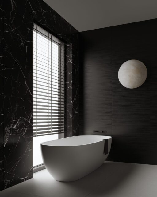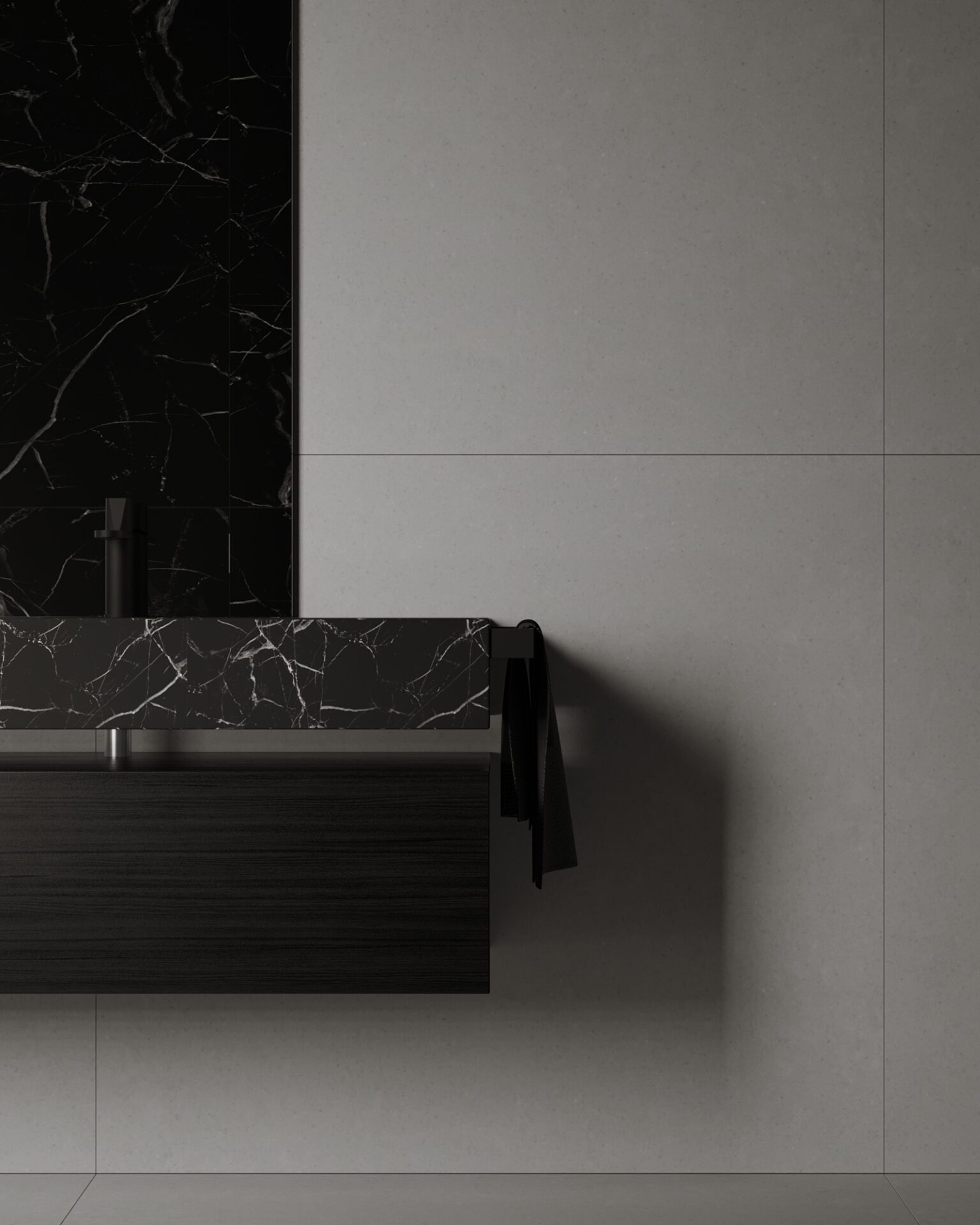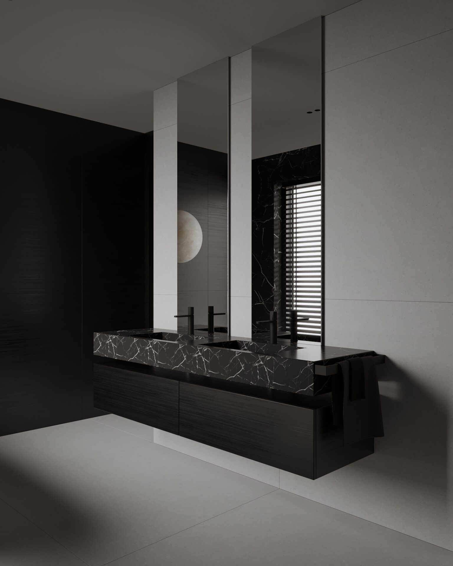 Брутальная ванная комната, с ее черными шпонированными панелями и черным мрамором на стенах и подвесных умывальниках, облегчена спокойным широкоформатным керамогранитом нейтрального серого цвета.